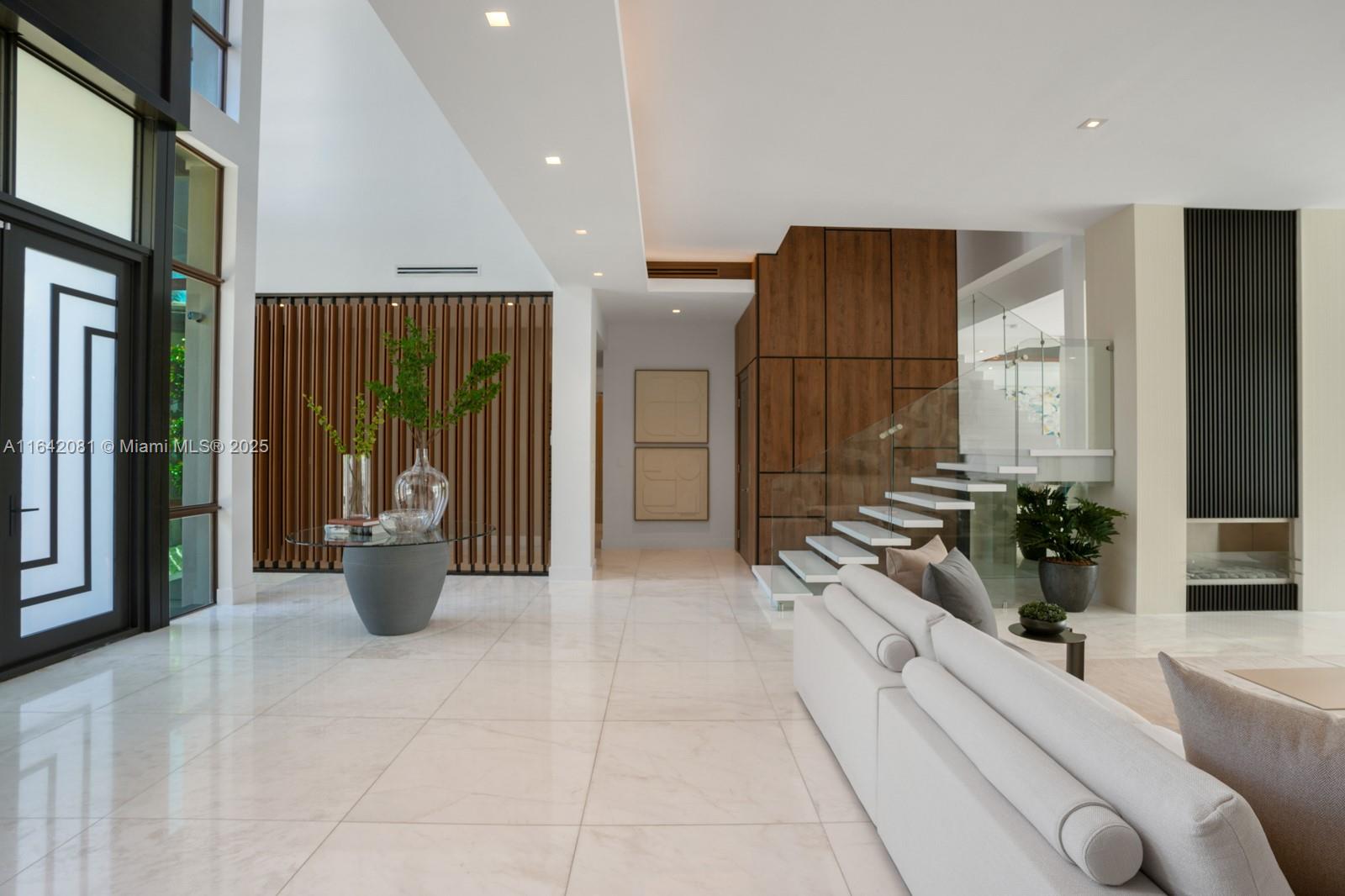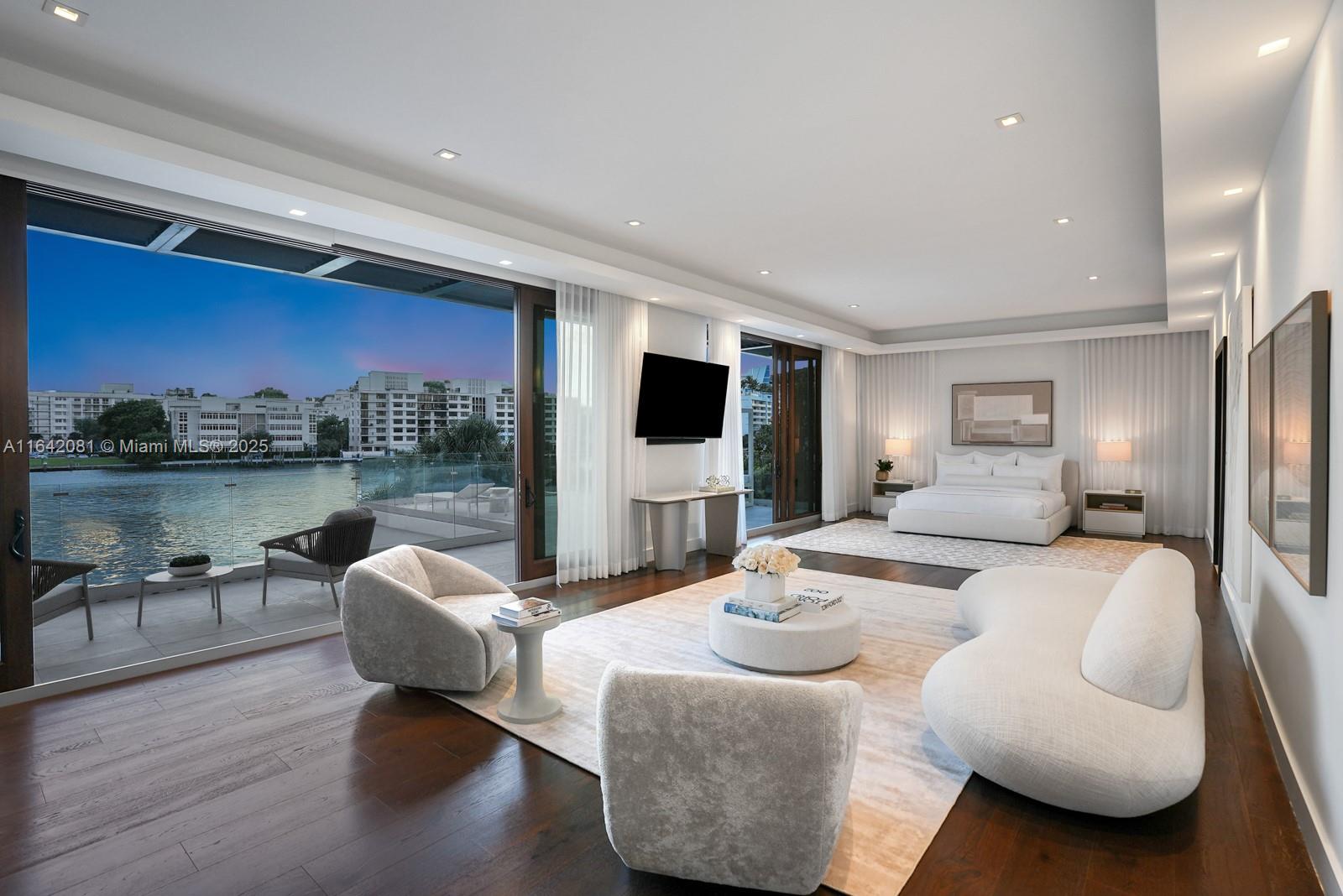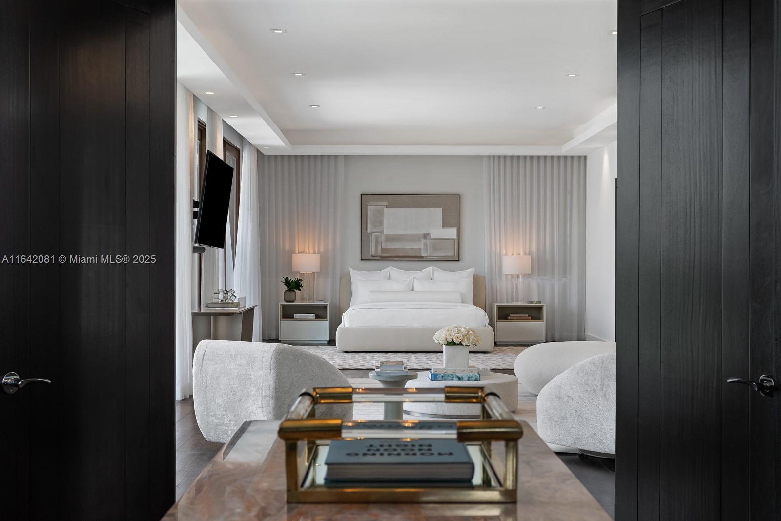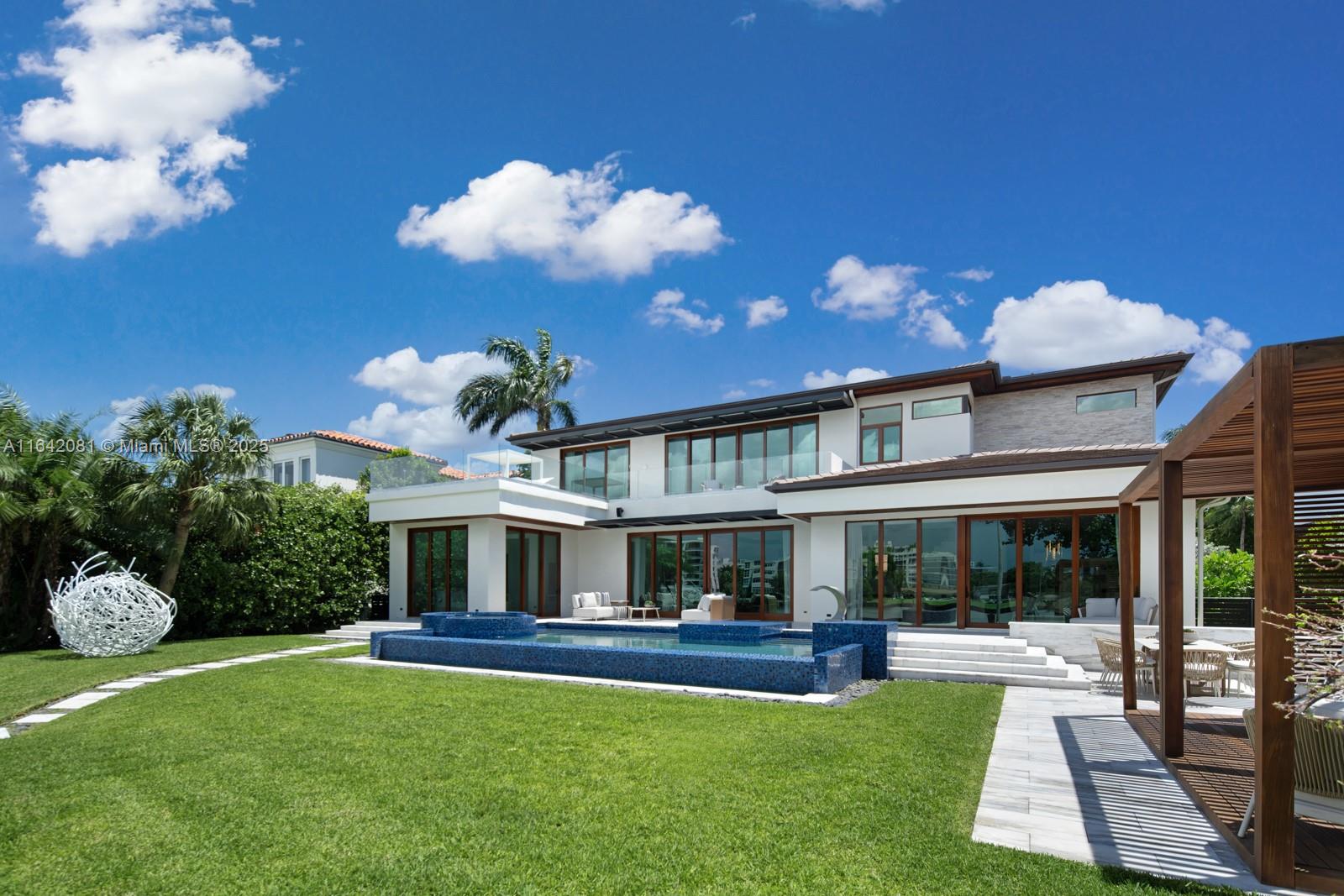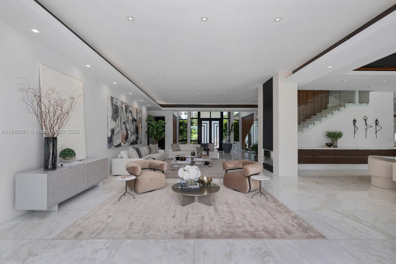 Step Inside with Me! Nestled within guard-gated Bal Harbour Village, 100 Bal Bay is 1 of only 36 waterfront addresses in this private enclave. 25' foyer ceilings open to a wood paneled hosting salon, graceful dining room and breakfast lounge all with Western views. The main level is completed with a contemporary marble kitchen + expansive eat-in island as well as 5 spacious guest suites. A modern staircase leads to the upper level dedicated to a palatial primary with seating area, dual dressing rooms and dual baths, adjacent study, and sun-deck to take in the sunsets. Embrace the outdoors at the mosaic pool + spa, 2 cabanas, greenspace, and dock along 95' of waters with open bay access. An elevator, 4-car garage, and proximity to Bal Harbour Shops, parks & the beach complete this offering.