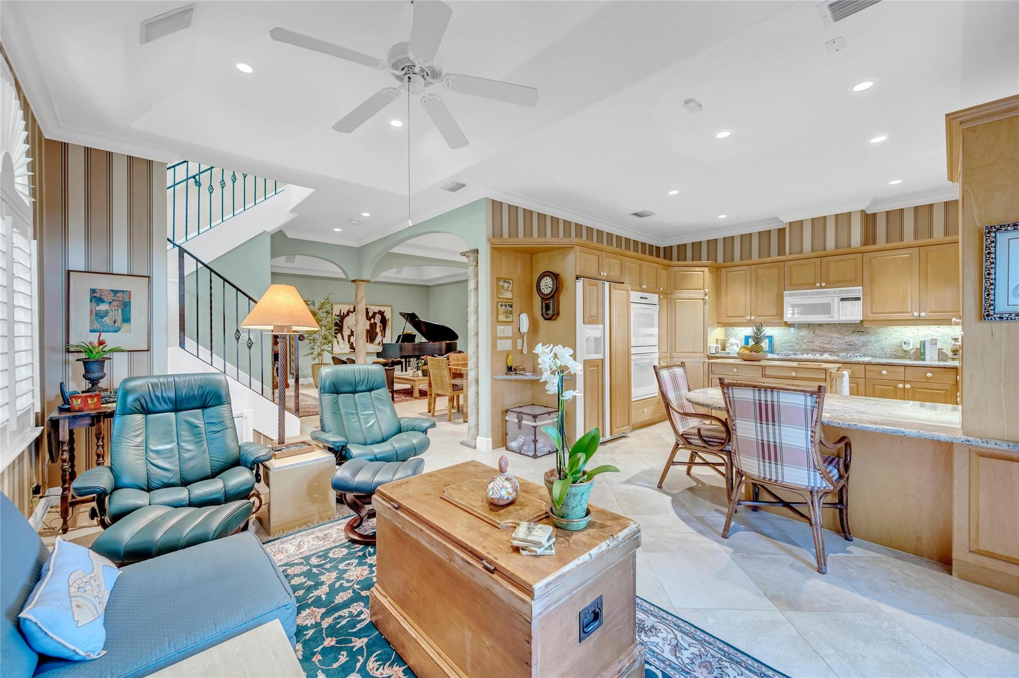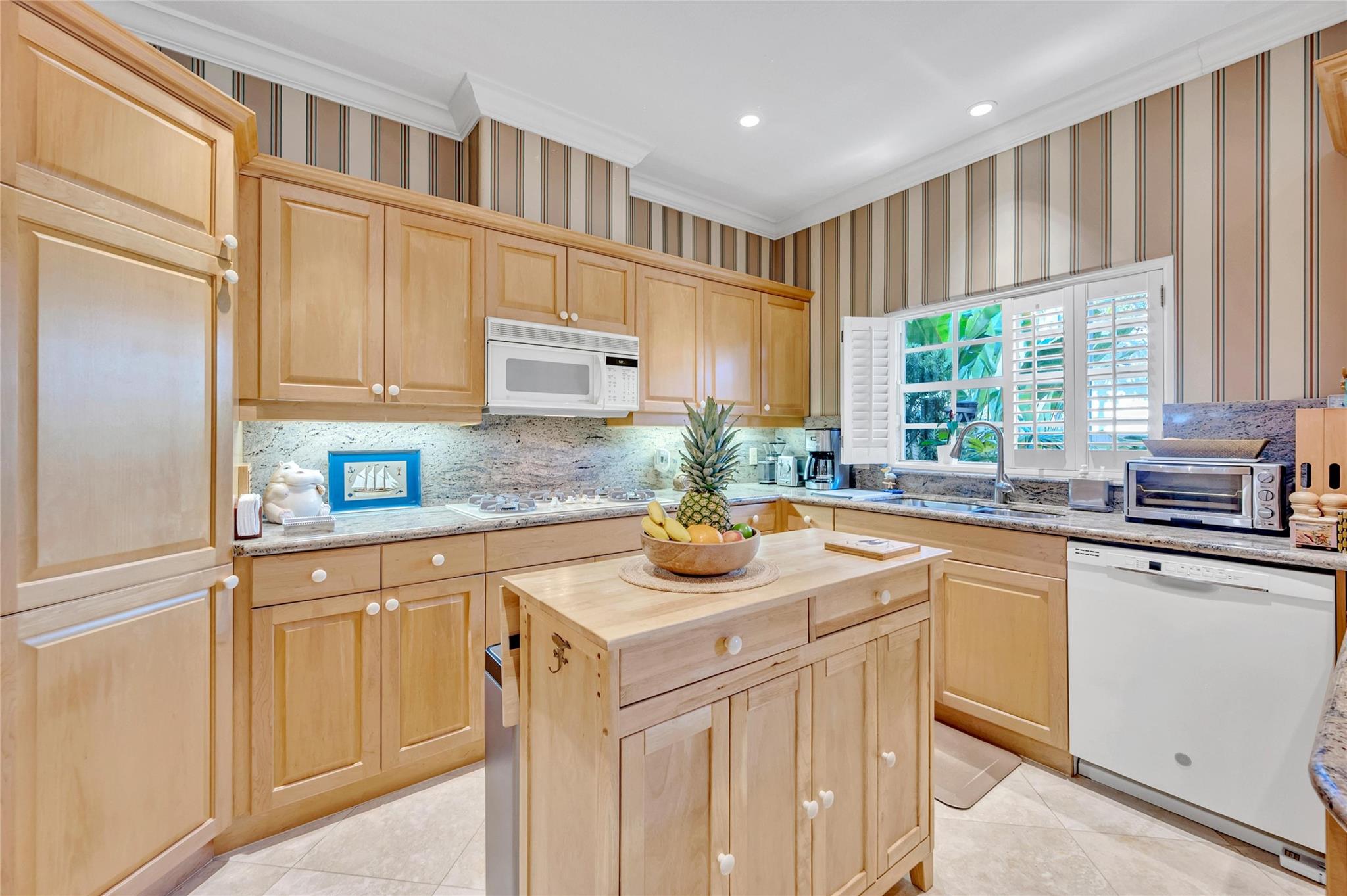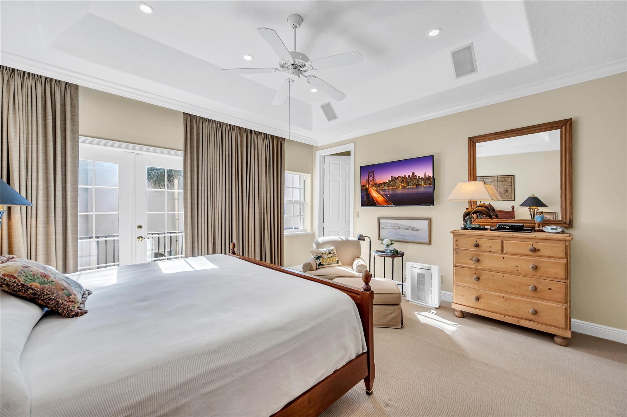 A spacious corner home in the gated Victoria Mews with a shared pool. Three bedrooms and an office/guest room for sophisticated living with high ceilings, tall windows, and pristine gardens. The vestibule leads to a sunlit foyer and spacious living room with Saturnia floors and tray ceilings. Adjacent are a dining room, family room, and open kitchen. French doors open to a walled garden with ornamental plants and landscape lighting. A wide stairway with a tall south-facing Palladian window opens to a hall connecting the bedrooms, guest bath, den, and laundry. The primary suite features a luxurious bath, large closet, and balcony with city skyline views. The den/office includes a built-in desk and space for a daybed. The home also has a wide two-bay garage that accommodates full-size cars.