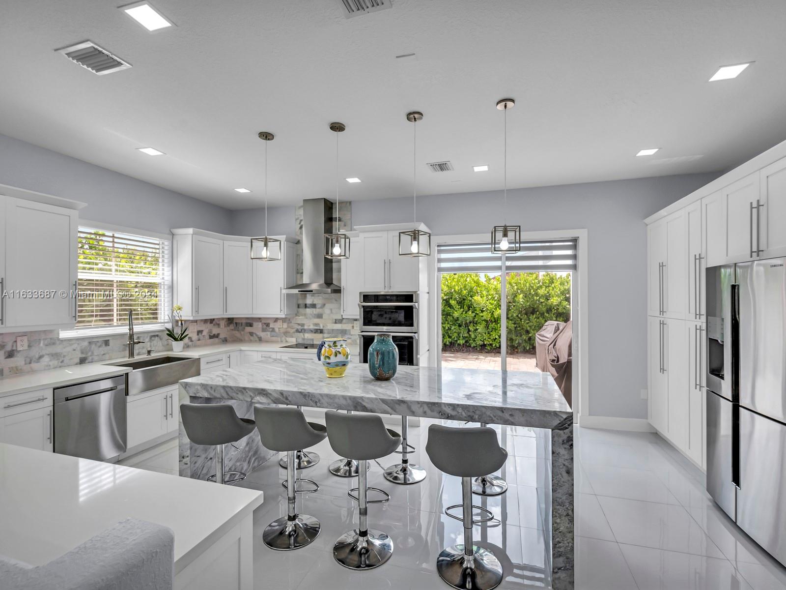 This 4 bedroom 3 bath home has been totally remodeled with white porcine tile flooring in all living areas, custom built-in dining room wall unit with custom lighting, custom built-in master closet with lighting features, custom recessed lighting, custom kitchen cabinets , 9' waterfall kitchen island with eight chairs, and 2 car garage with custom flooring and gym equipment. Best of all is the back yard with no construction for total privacy.