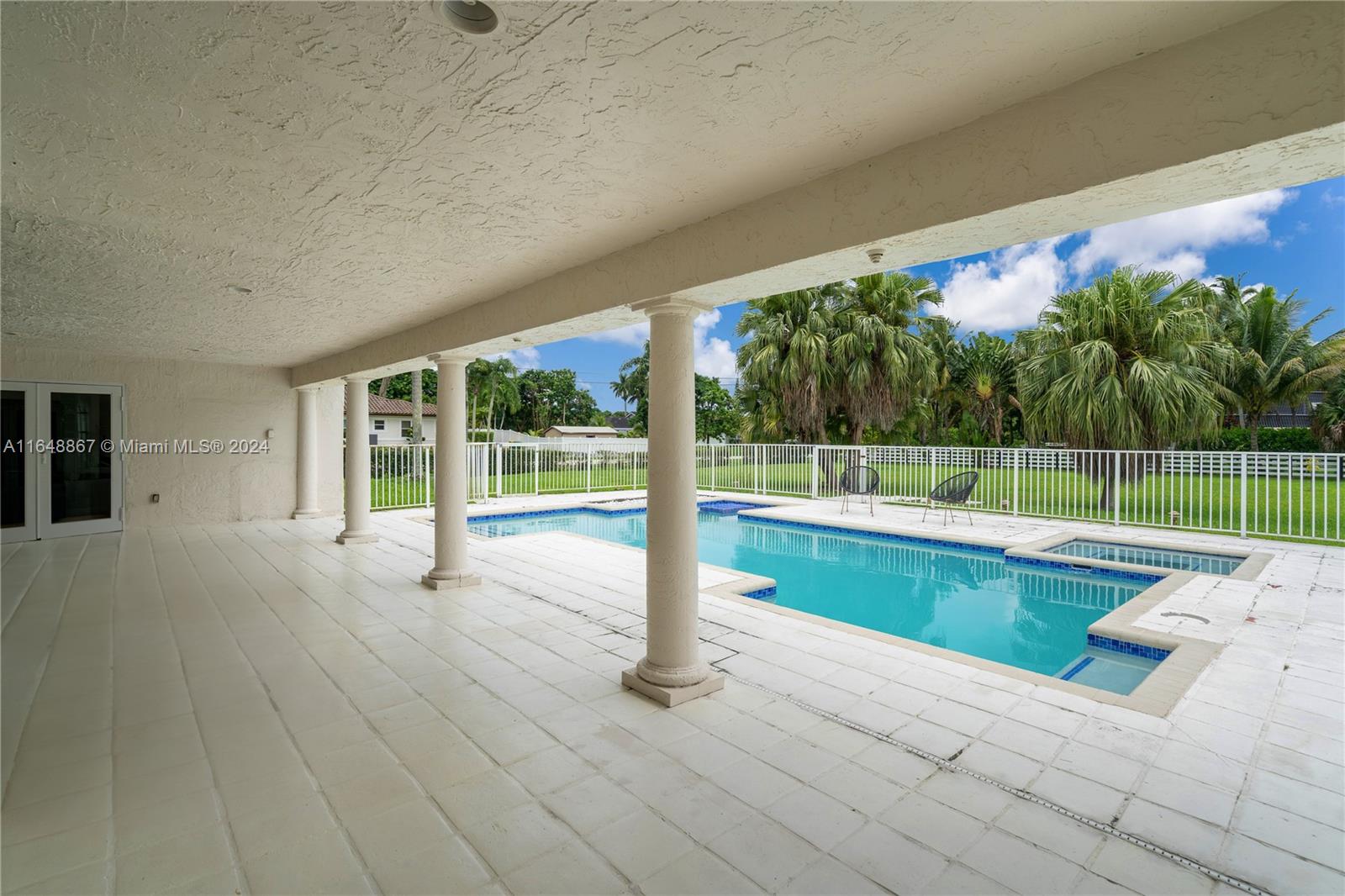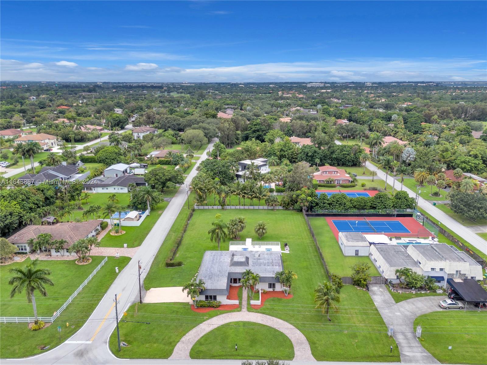 Welcome to your sanctuary of upscale living, where indoor elegance blends seamlessly with outdoor serenity. Nestled on a pristine acre in the coveted Plantation Acres, this stunning home offers a tranquil retreat in a quiet neighborhood surrounded by multi-million-dollar estates. The interior features an open layout with a gourmet kitchen and a large island, ideally situated between the dining and living areas. Enjoy a heated saltwater pool and jacuzzi for year-round relaxation. The property is designed with a circular driveway in the front and a secondary driveway leading to the garage.