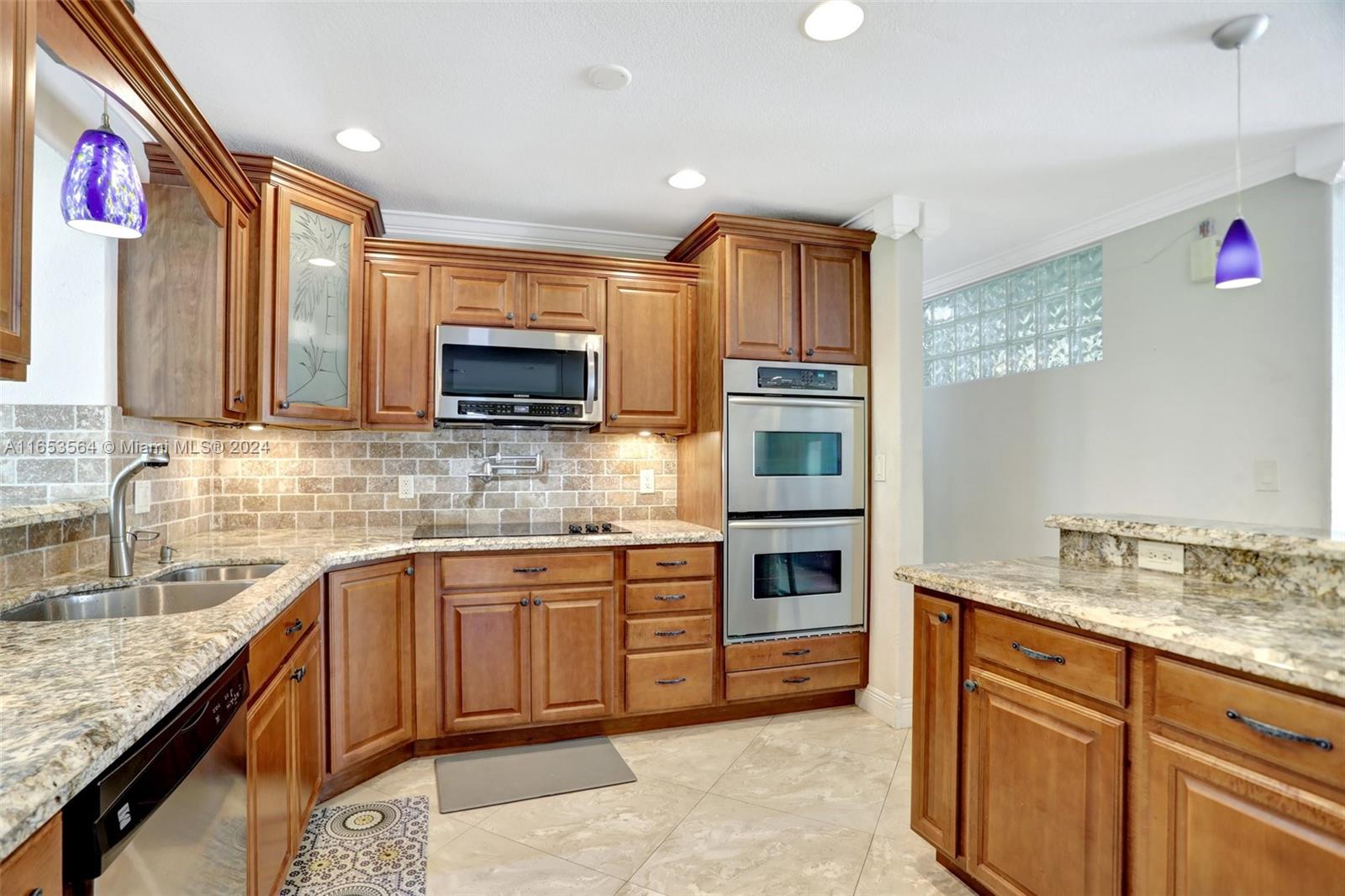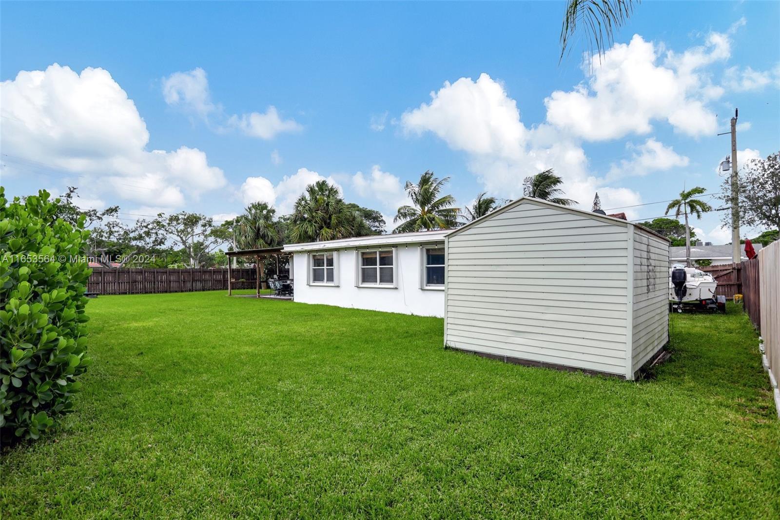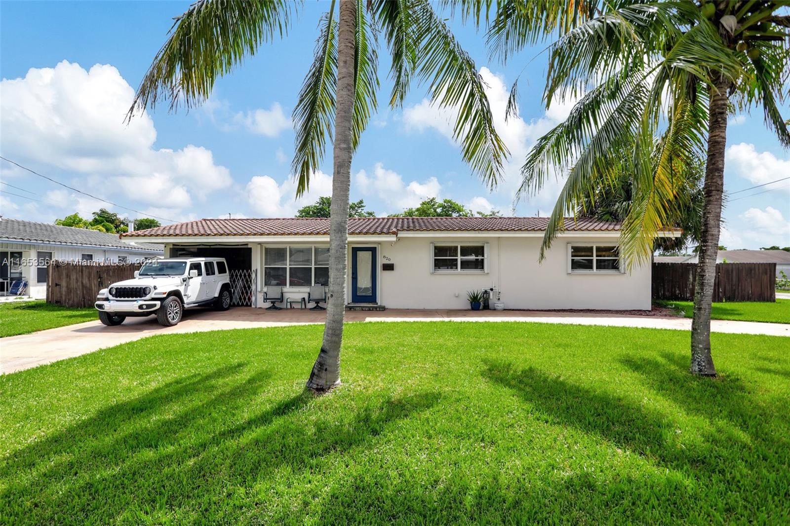 Welcome to this charming ranch-style 4-bed, 2-bath home on a 1/4-acre lot. Enjoy the open kitchen featuring stainless steel appliances, granite counters, wood cabinets, a large island with breakfast bar, and dual convection ovens. Elegant 24" Italian porcelain tile and crown molding throughout. Relax in the master bath's Jacuzzi tub or entertain in the spacious Florida room with a bar. Step outside to a 16'x32' covered patio, lush garden and a large backyard. Extras include a large laundry room, enclosed carport, hurricane impact doors, and accordion shutters. Water filtration system for the whole house installed. Roof 2020, water heater 2020. Quiet street with great neighbors - Bonus: big circular driveway, storage shed and big space for your boat!