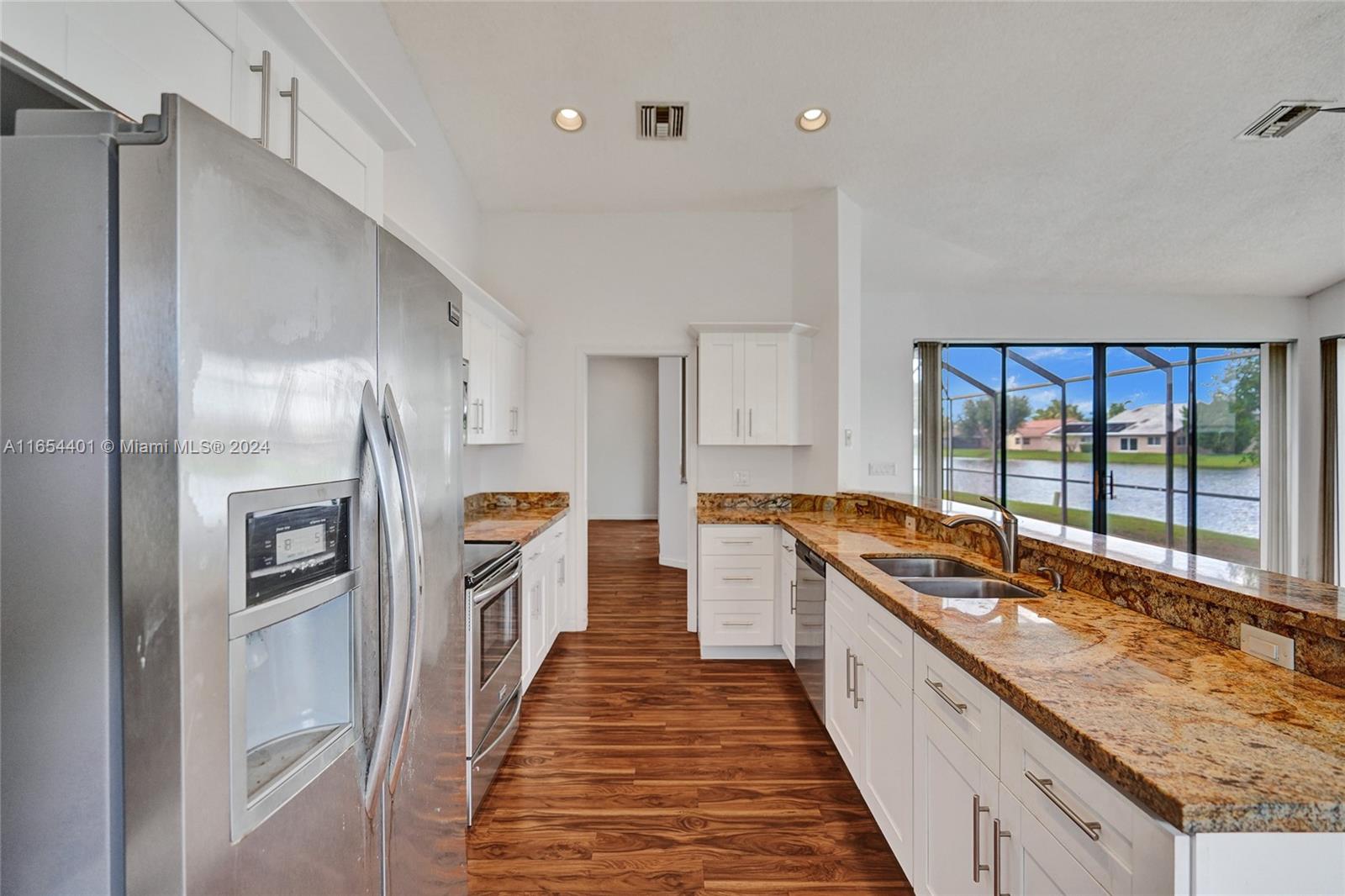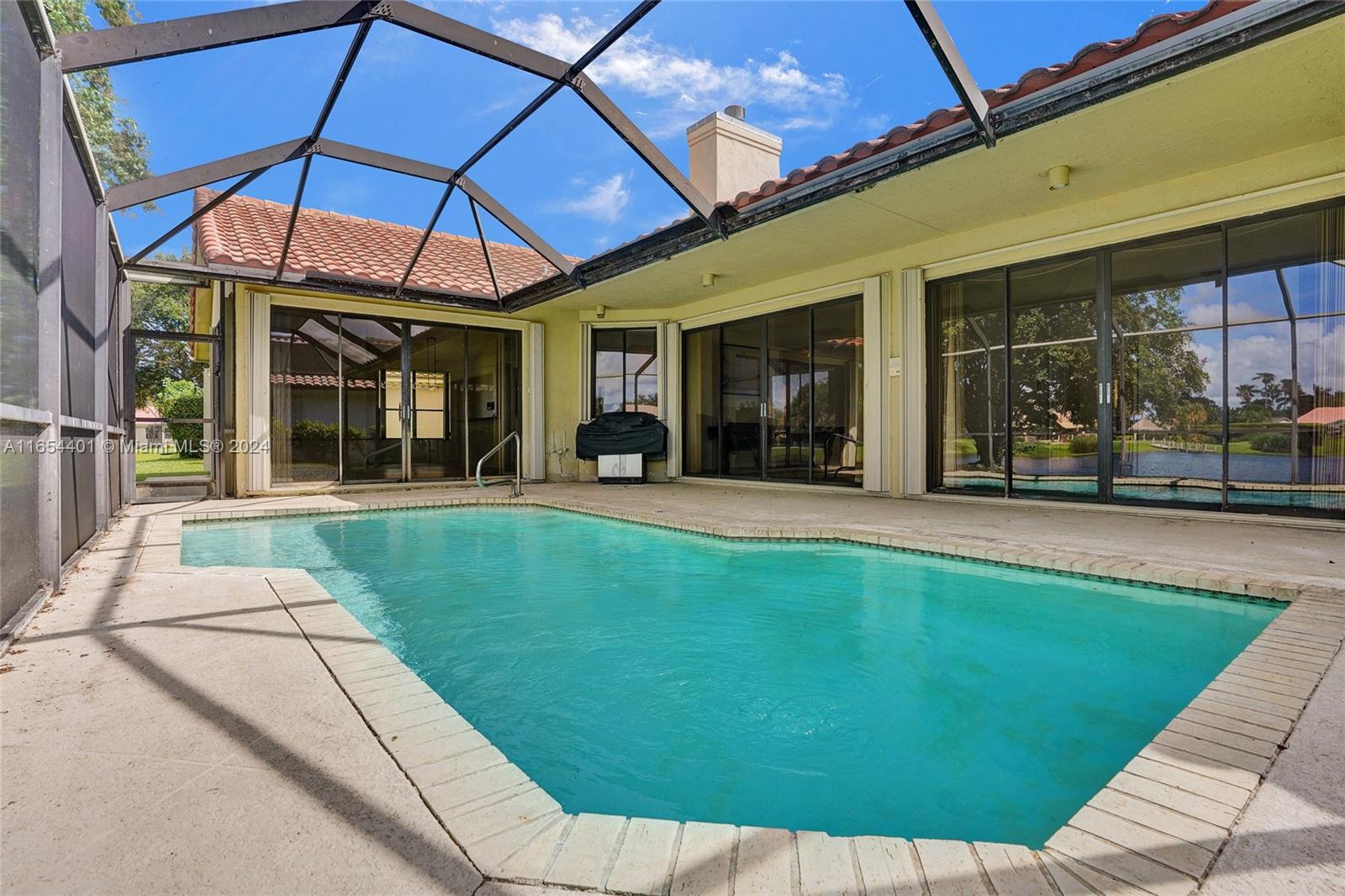 PRICE IMPROVEMENT. Awesome 5 bed, 3 bath waterfront pool home with a fireplace, located in the desirable community of Boca Winds. This home is light, bright and airy featuring 12 ft ceilings and tons of natural light a whole house generator & more. The open-concept layout flows seamlessly between living spaces that all lead to your beautiful screened pool and patio, perfect for relaxation and entertainment. The large family room off the open kitchen w/ granite countertops is perfect for family gatherings. The large master bedroom features sliding doors that overlook the sparkling pool. Community include tennis & basketball courts, & a pool. Boca Winds is conveniently located close to restaurants, shops, & parks. Zoned for A rated schools.