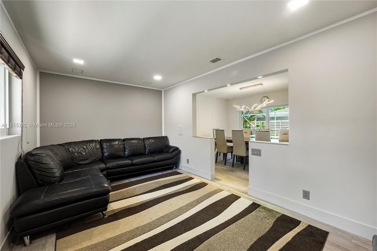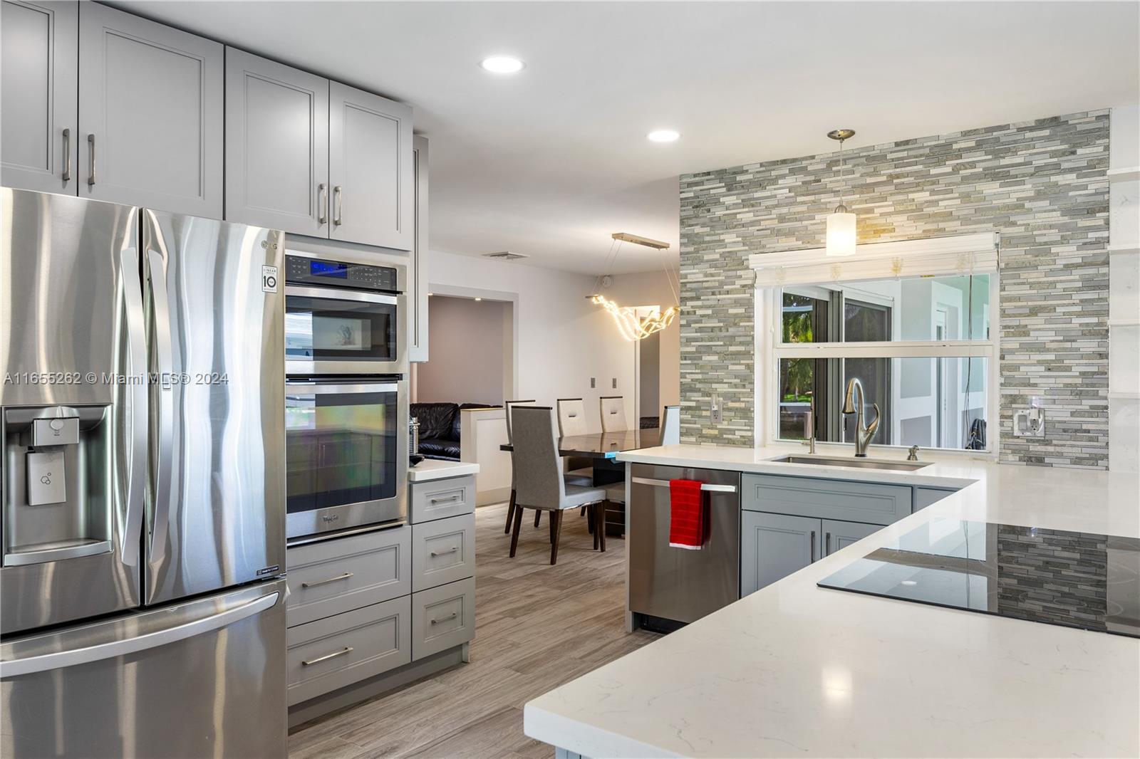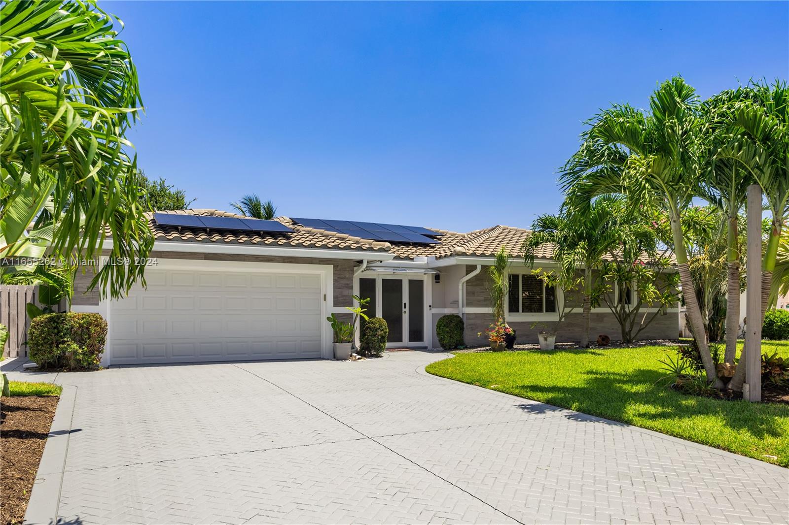 Rarely available stunning waterfront property in the desirable High Ridge Estates. Spacious 3/2 features open layout seamlessly combines the living, dining, and kitchen areas, with abundant natural light. The kitchen features modern appliances, while an adjacent office space, and a media room offers convenience & fun on movie nights/ game days. Step outside to a travertine patio surrounding a sparkling pool, ideal for relaxation.The home features a 30' boat dock & many eco-friendly features, solar system, new roof (2020), & impact windows /doors. Located in a quiet Cul-de-Sac, minutes from the beach! Close to restaurants, shopping, golf, highways and airport. Don't miss out on this waterfront oasis situated at higher elevation.Low insurance.