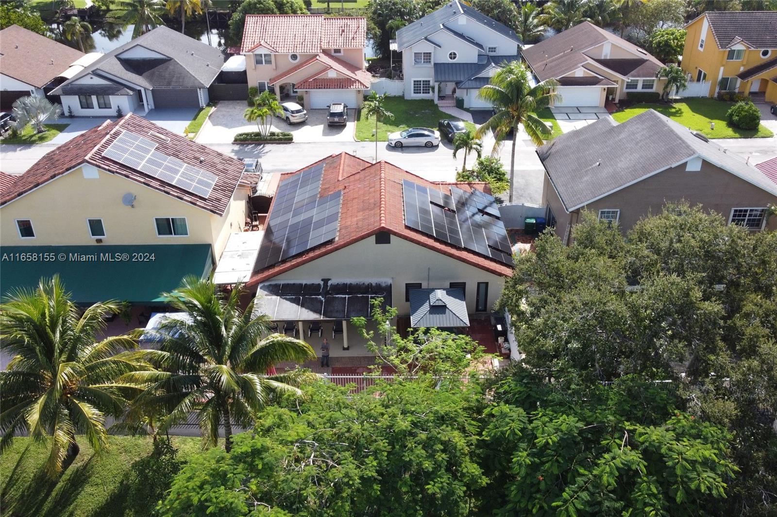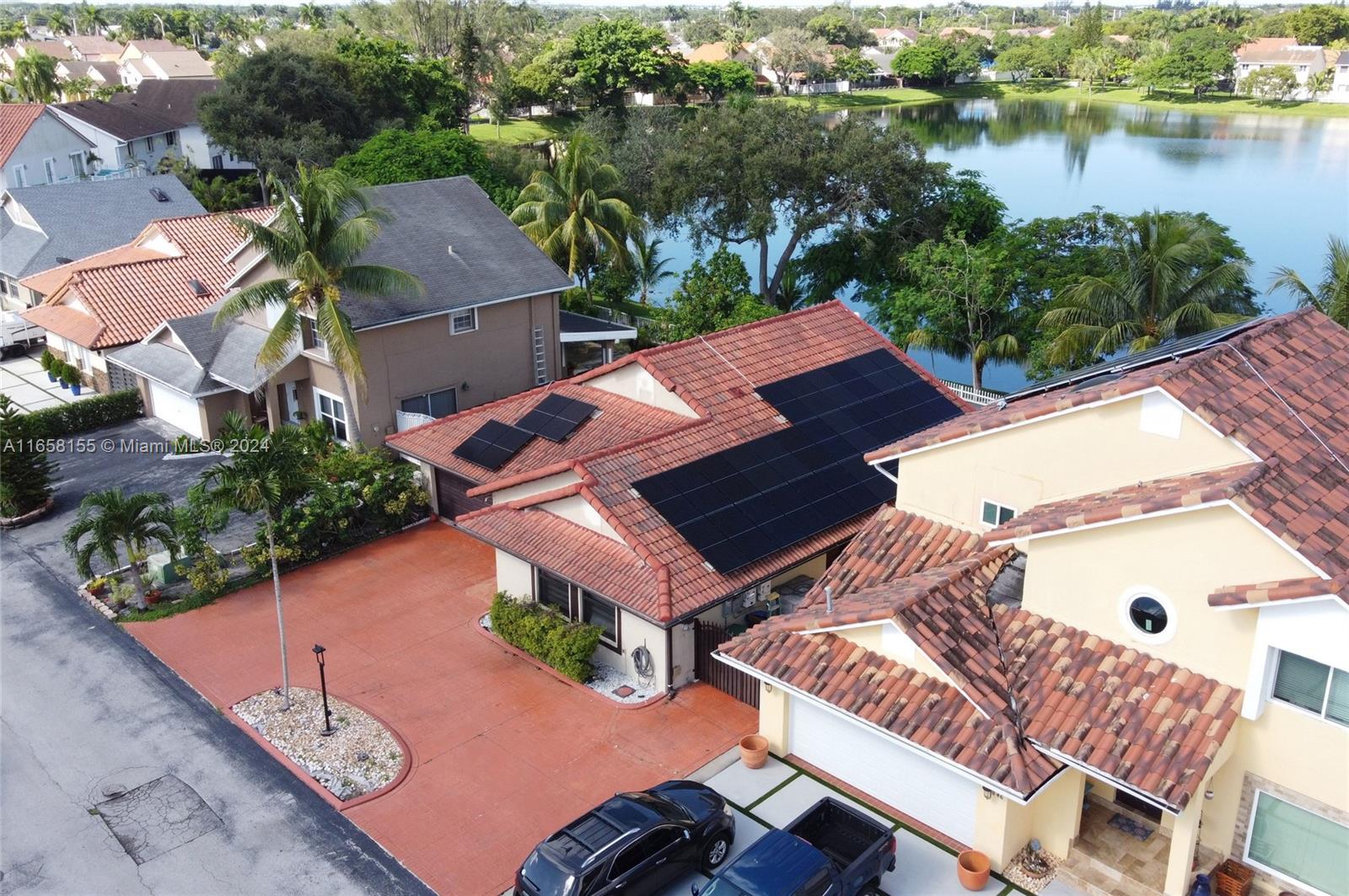 Seller contribution! Discover lakefront living in the highly sought-after community of Esplanade! This 4-bedroom, 2-bathroom gem offers breathtaking sunset views from your inviting paved patio, complete with a covered terrace and a relaxing hot tub. With no rear neighbors, you'll enjoy peace and privacy, while the scenic lakeside path offers the perfect setting for morning or evening walks. The home features a brand new high-impact front door, high-impact windows throughout, and solar panels for energy efficiency. new refrigerator, washer and dryer, new floors, new LED lights, and alarm. With a very low HOA and an unbeatable location just a few minutes from I-75, Miami Lakes, and the future American Dream Miami megamall this property is a must-see!