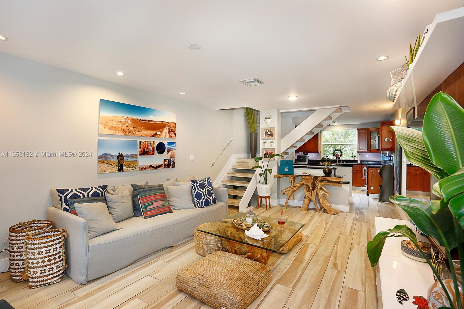 Rare find South of Fifth - beautifully updated 3/2 townhome. Enjoy peace and serenity with only 18 units in this quiet, secure, gated complex on the most beautifully tree-lined street in all of South Beach. The garage features elevated storage and new electronic garage door to safely park a vehicle with a carport space for a second vehicle. Brand new AC unit installed in July. Entire complex is receiving a fresh new look with painting happening now. Custom built-in storage closets in all 3 rooms. Hurricane glass in all windows. Entry level features full size water/dryer, full bath, and a guest bedroom. Second floor is the 'entertainment' level with open kitchen and spacious living/dining and lots of light. Third floor are two more bedrooms and large full bath. Leased through Jan. 10, 2025