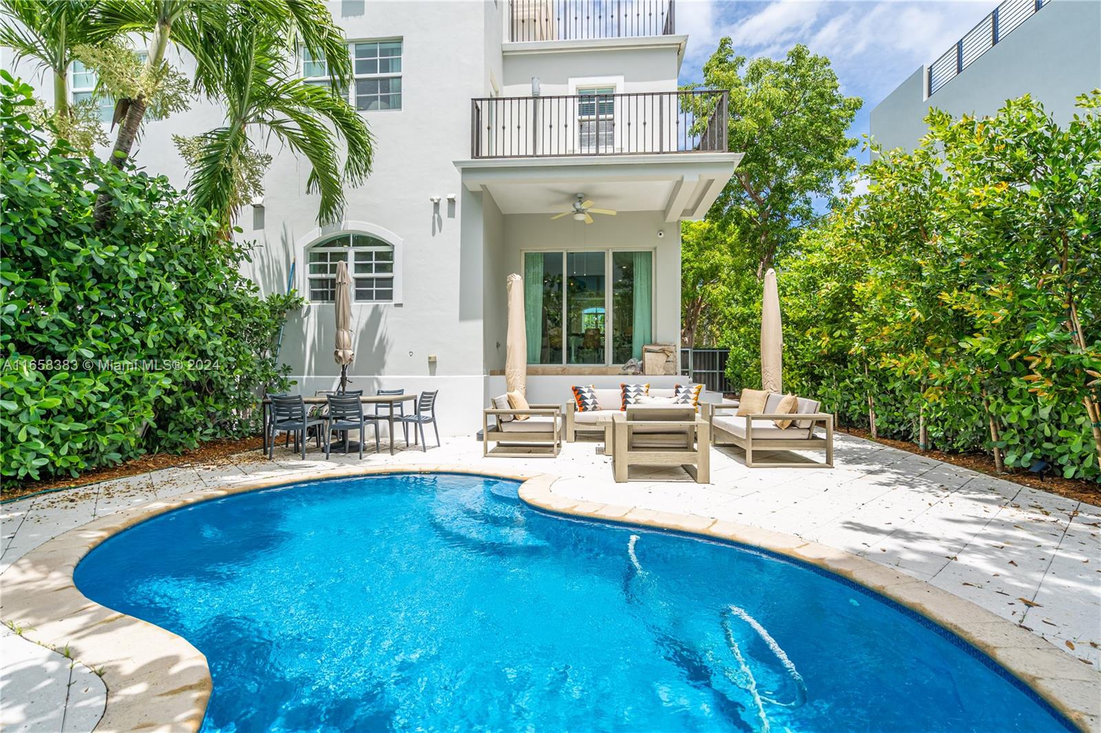 Welcome to this beautifully renovated 3BR/2.5BA beachy townhouse in Key Biscayne. This elevated house features high ceilings, terraces off every bedroom, and a rooftop terrace perfect for sunset views. The coastal-inspired design extends to the private backyard with a saltwater pool, outdoor shower, and plumbing/electric setup for a cold plunge—perfect after a beach day and fun for all ages. The home boasts a renovated kitchen, impact windows, motorized blackout shades in the bedrooms, and linen curtains throughout. Just steps from Village Green, top schools, and shopping, this is island living at its finest! *Key Biscayne Beach Club Membership Included.
