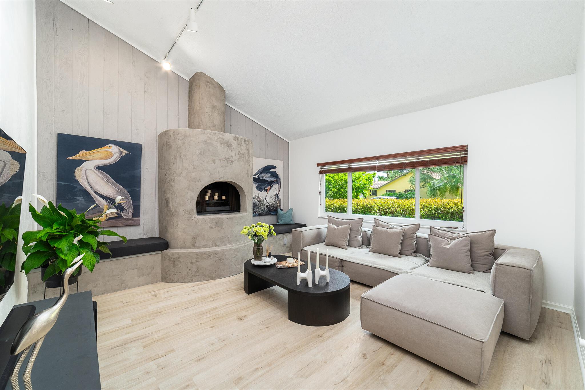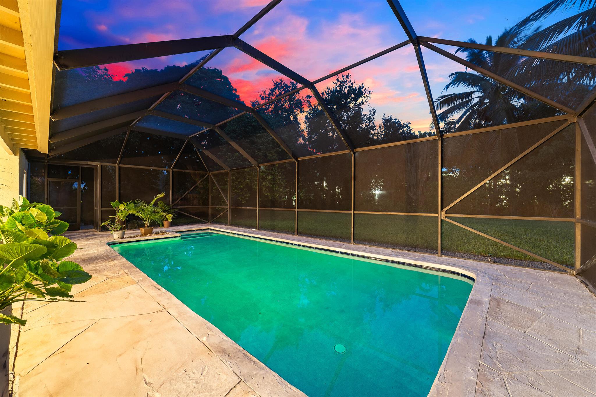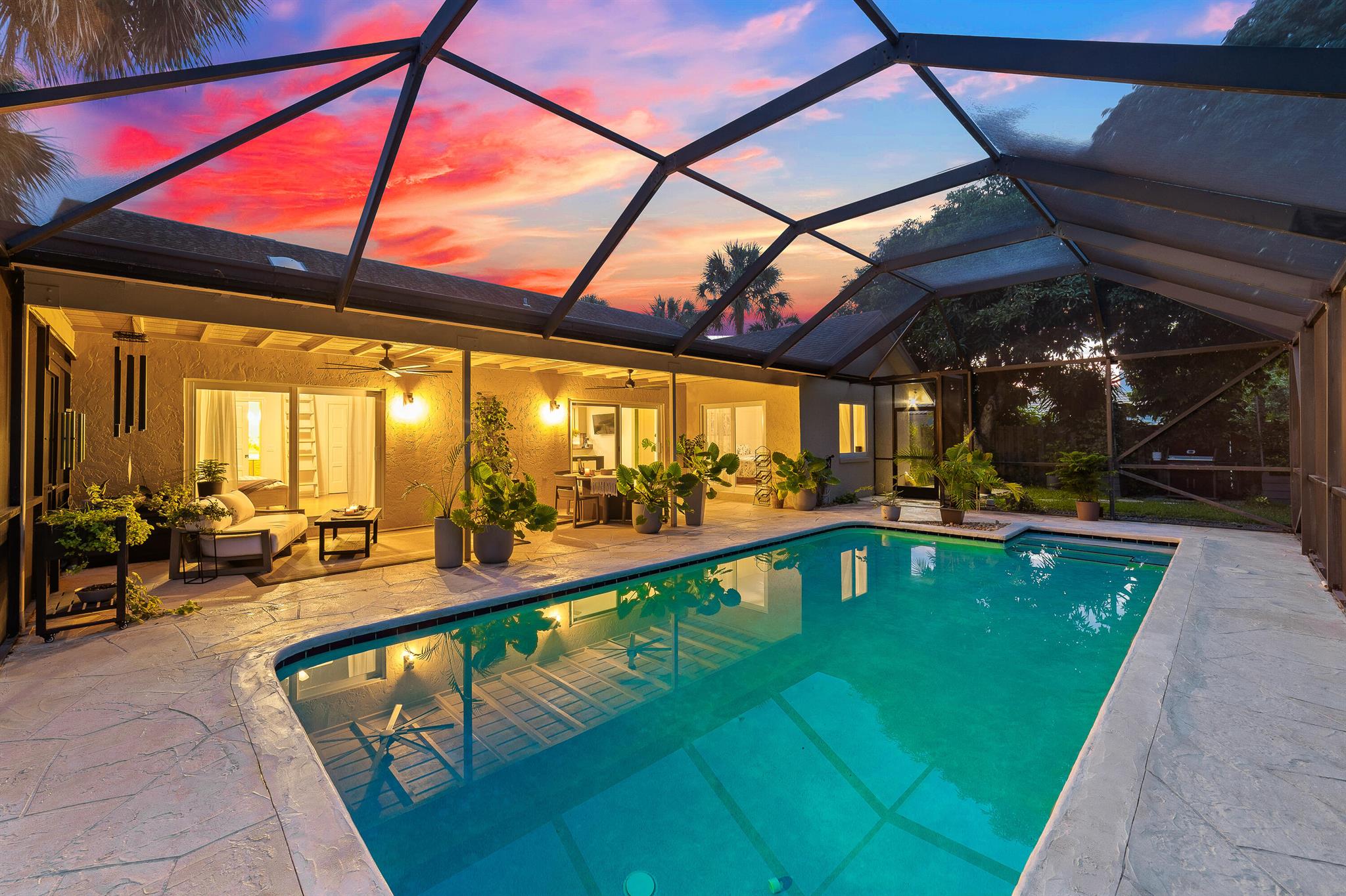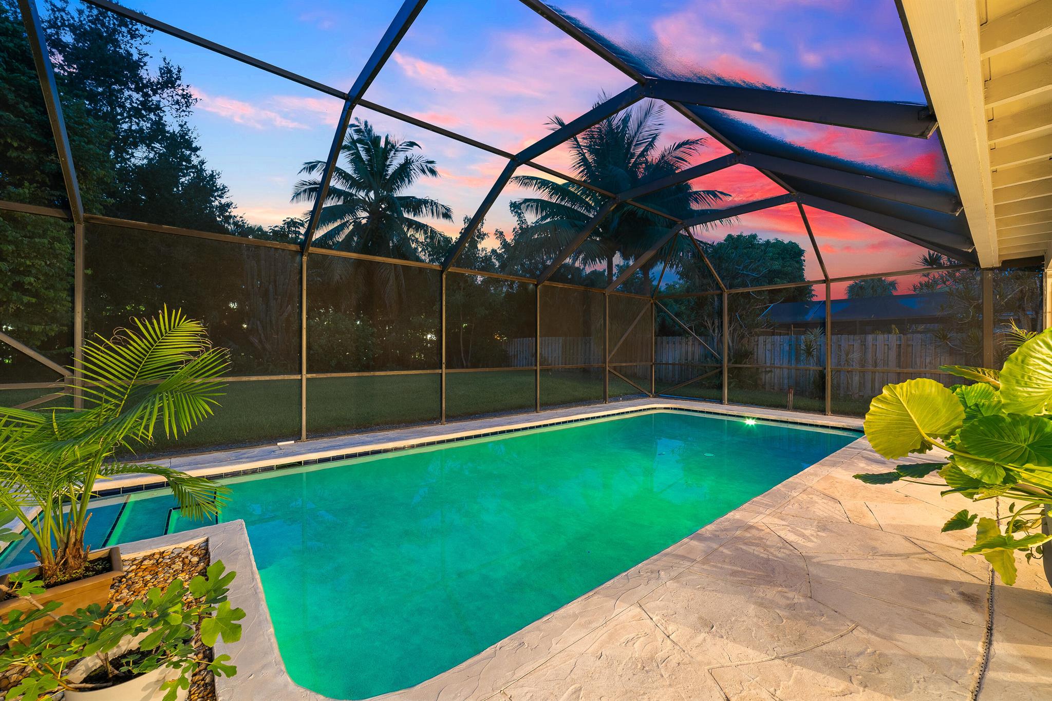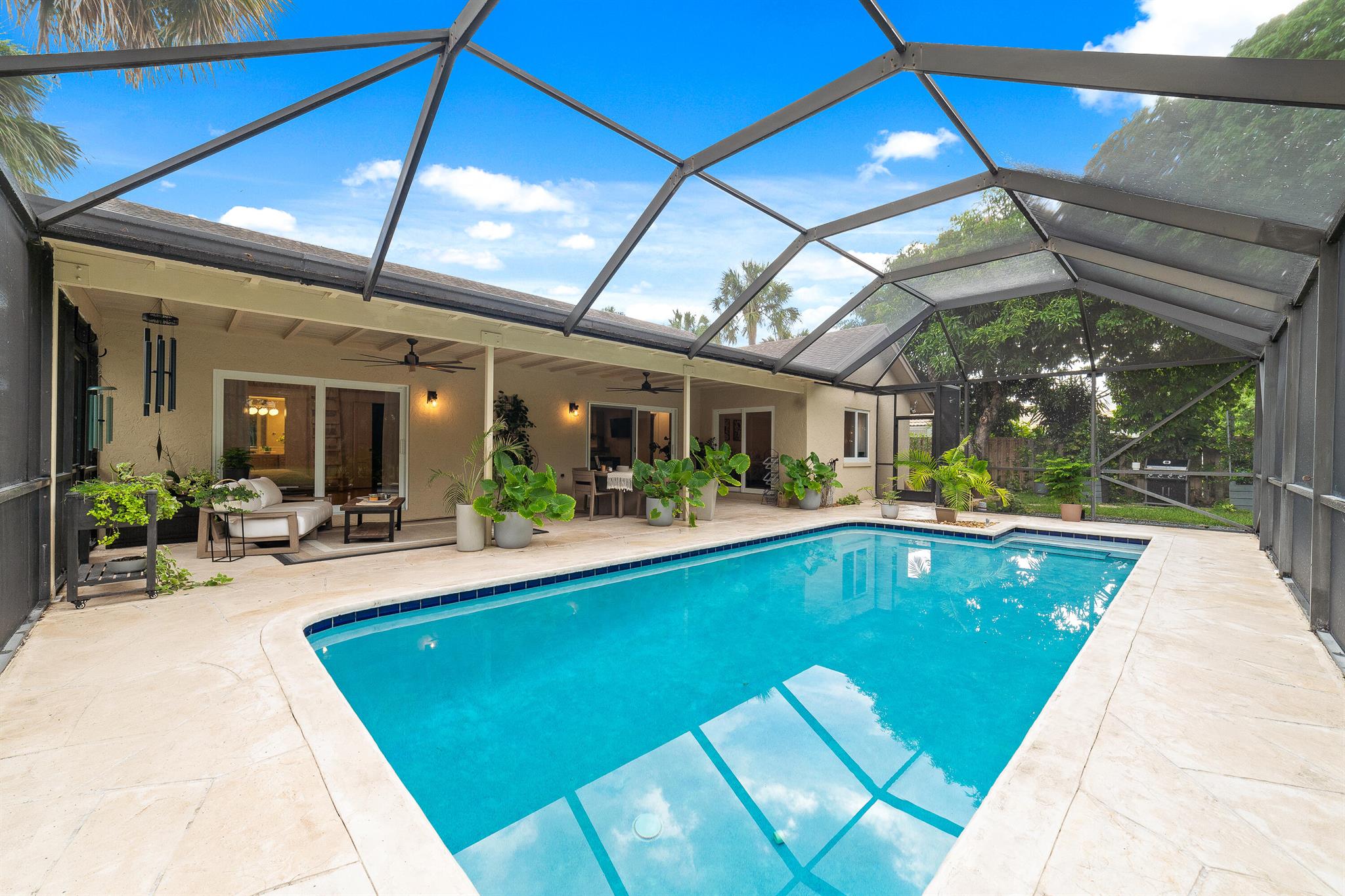 Freedom from an HOA exists! East Boca home located in an A-rated school district with stylish interior for today's aesthetic. This 3 bedroom, 2 bathroom features modern 2024 updates: smooth ceilings, updated bathrooms, custom closet, sleek A/C vents, new ceiling fans/lighting, and smart home technology. Micro-cement covered wood-burning fireplace is the centerpiece of the vaulted living room with new flooring. Your primary bedroom comes with a multi-purpose loft with a skylight. The heart of the home, your recently updated kitchen, overlooks the screened pool and grounds with large bedrooms on either side of it. Outside, you'll enjoy no rear neighbors and your own fruit trees in the fully fenced space. Close to George Snow Park and Whole Foods and restaurants.