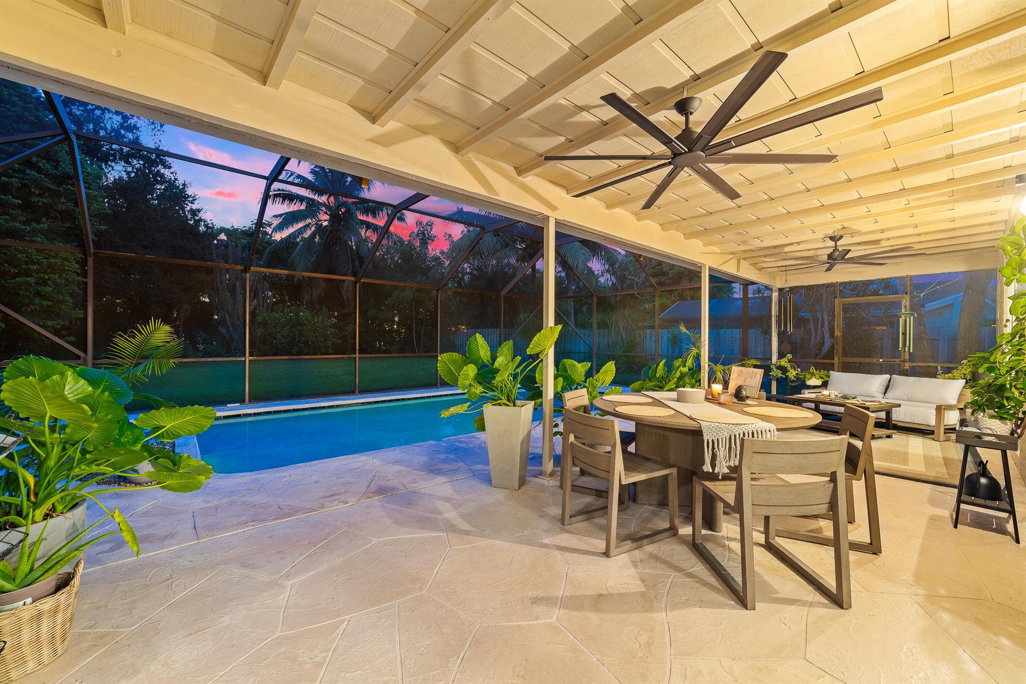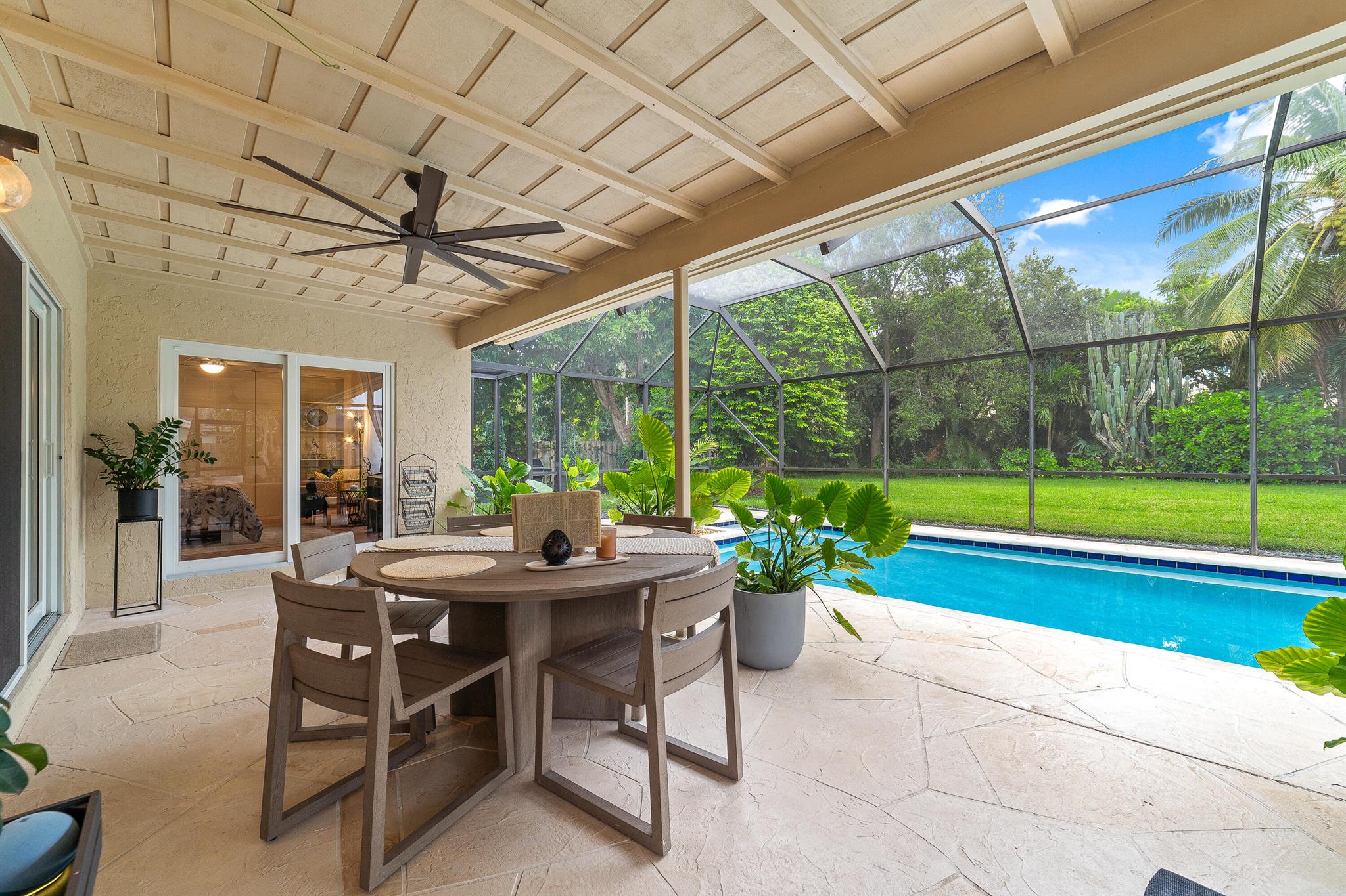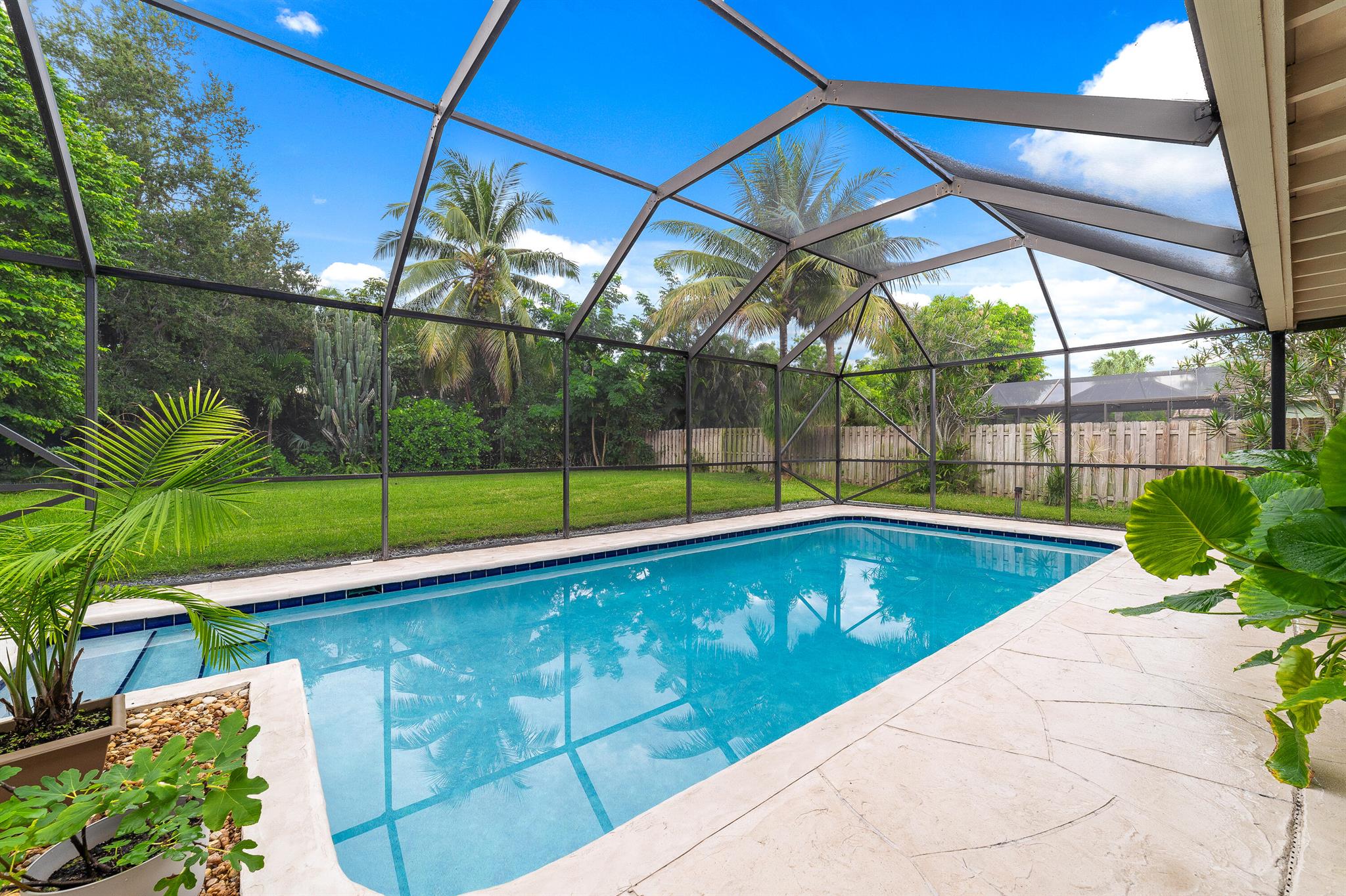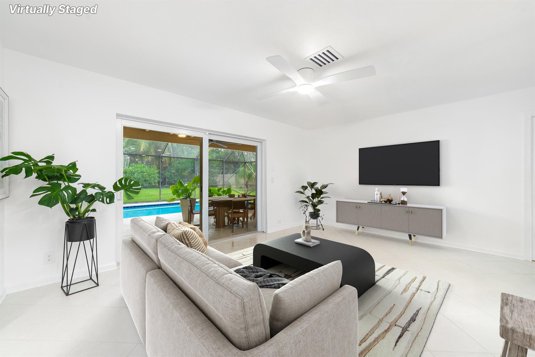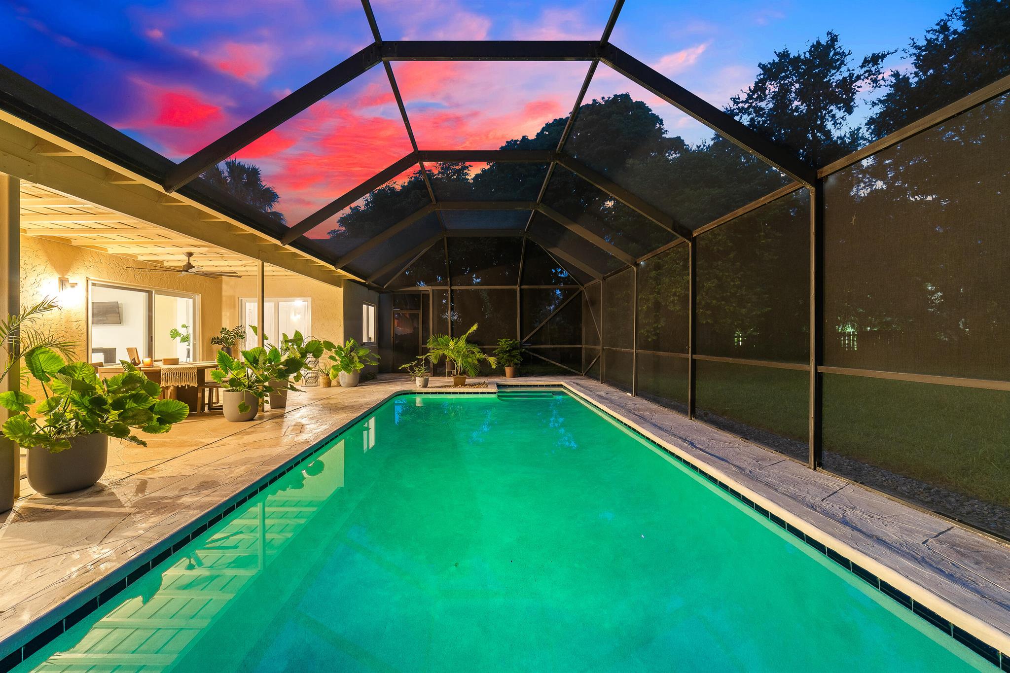 Freedom from an HOA exists! East Boca home located in an A-rated school district with stylish interior for today's aesthetic. This 3 bedroom, 2 bathroom features modern 2024 updates: smooth ceilings, updated bathrooms, custom closet, sleek A/C vents, new ceiling fans/lighting, and smart home technology. Micro-cement covered wood-burning fireplace is the centerpiece of the vaulted living room with new flooring. Your primary bedroom comes with a multi-purpose loft with a skylight. The heart of the home, your recently updated kitchen, overlooks the screened pool and grounds with large bedrooms on either side of it. Outside, you'll enjoy no rear neighbors and your own fruit trees in the fully fenced space. Close to George Snow Park and Whole Foods and restaurants.