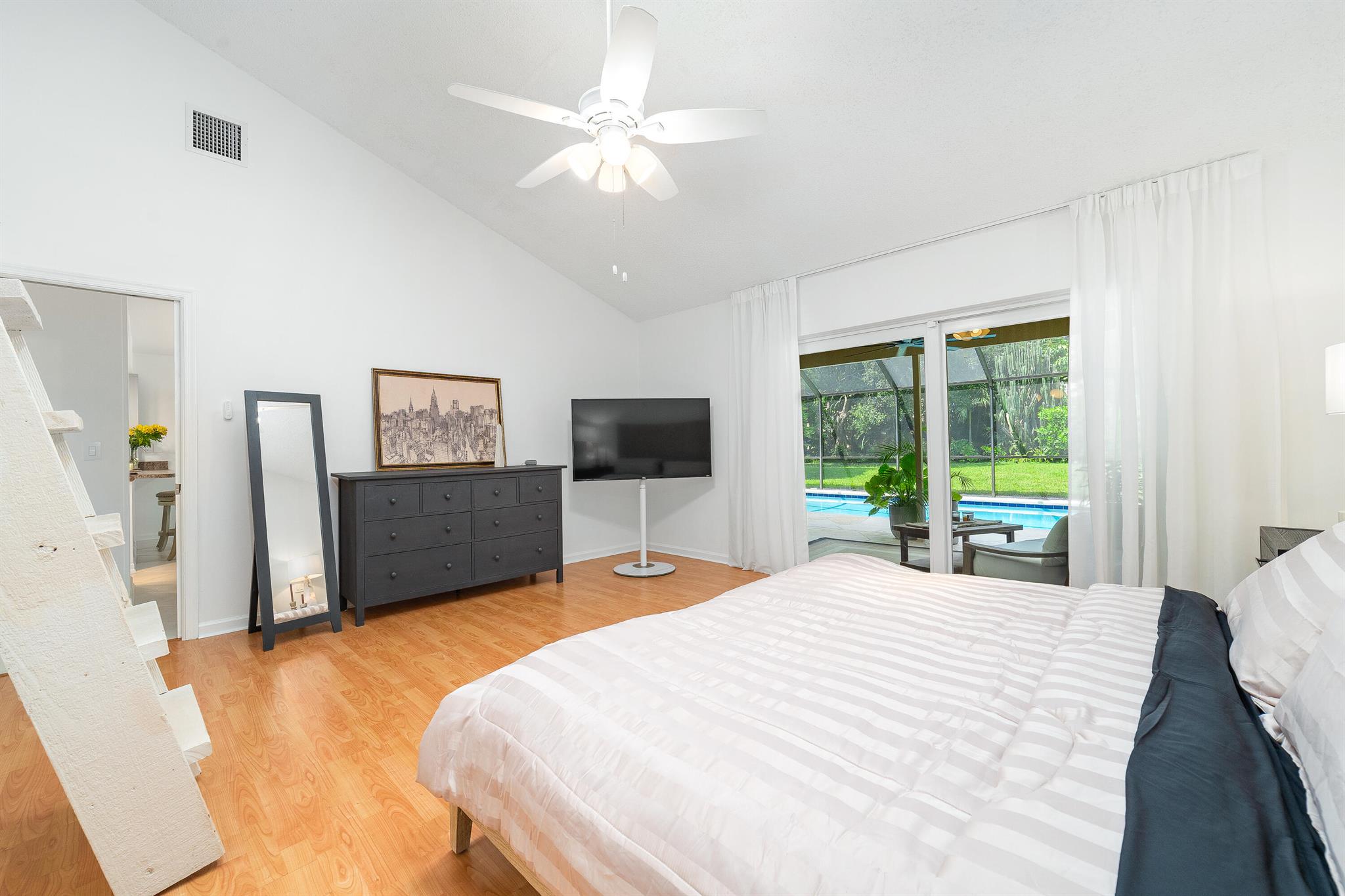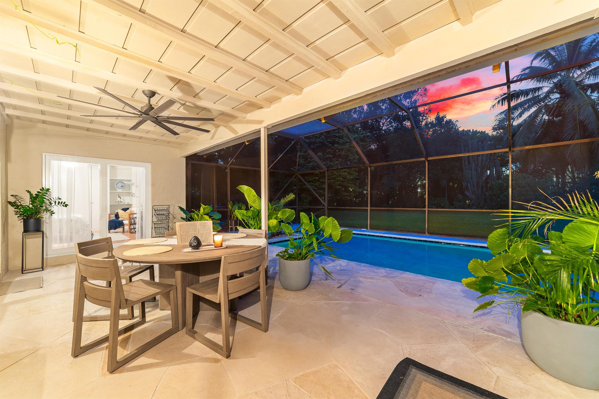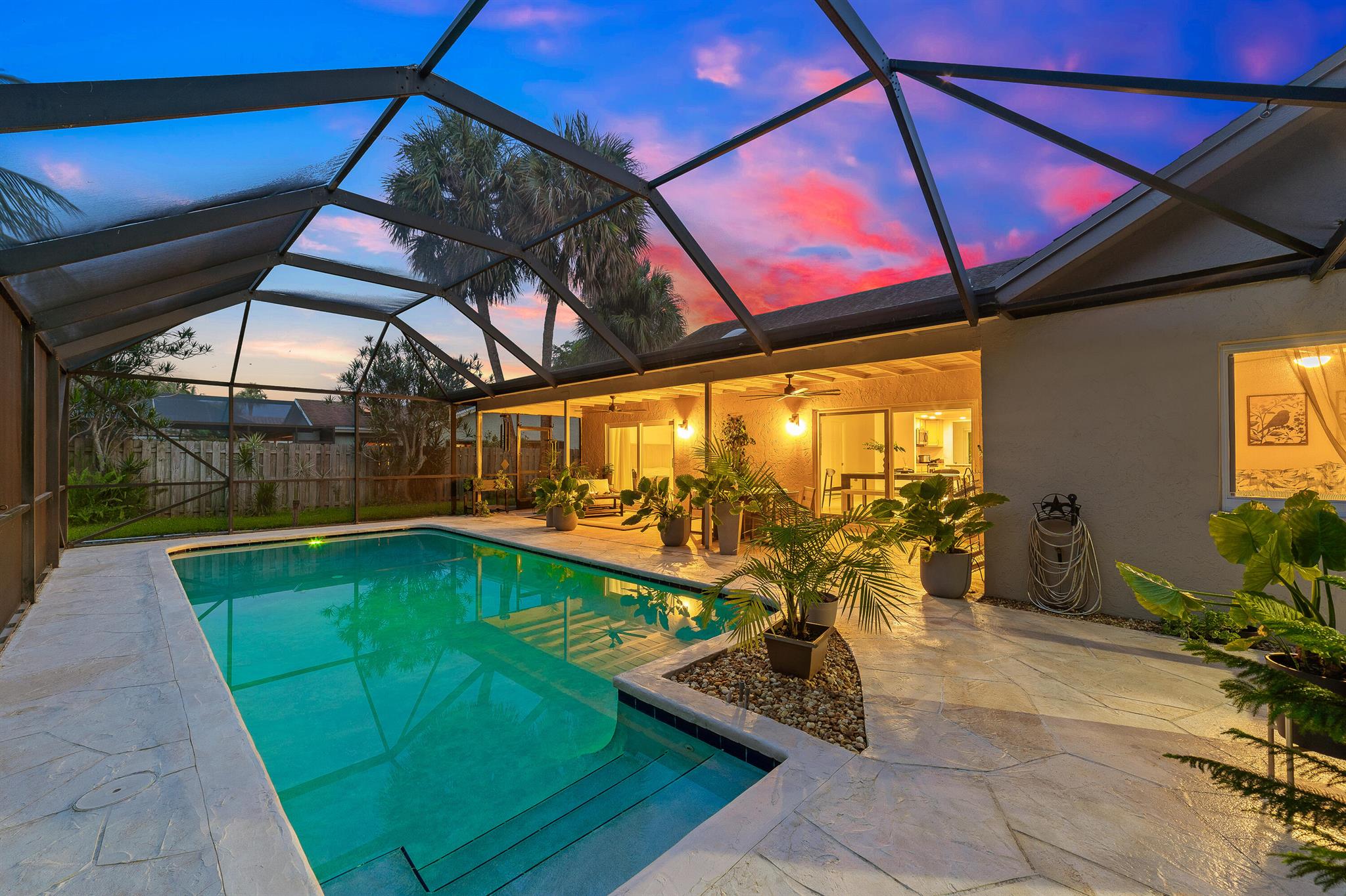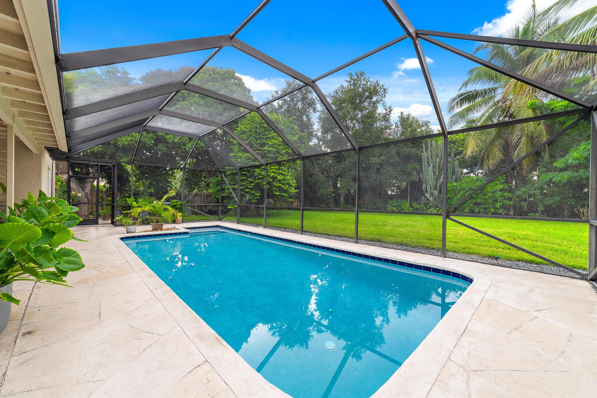 Freedom from an HOA exists! East Boca home located in an A-rated school district with stylish interior for today's aesthetic. This 3 bedroom, 2 bathroom features modern 2024 updates: smooth ceilings, updated bathrooms, custom closet, sleek A/C vents, new ceiling fans/lighting, and smart home technology. Micro-cement covered wood-burning fireplace is the centerpiece of the vaulted living room with new flooring. Your primary bedroom comes with a multi-purpose loft with a skylight. The heart of the home, your recently updated kitchen, overlooks the screened pool and grounds with large bedrooms on either side of it. Outside, you'll enjoy no rear neighbors and your own fruit trees in the fully fenced space. Close to George Snow Park and Whole Foods and restaurants.