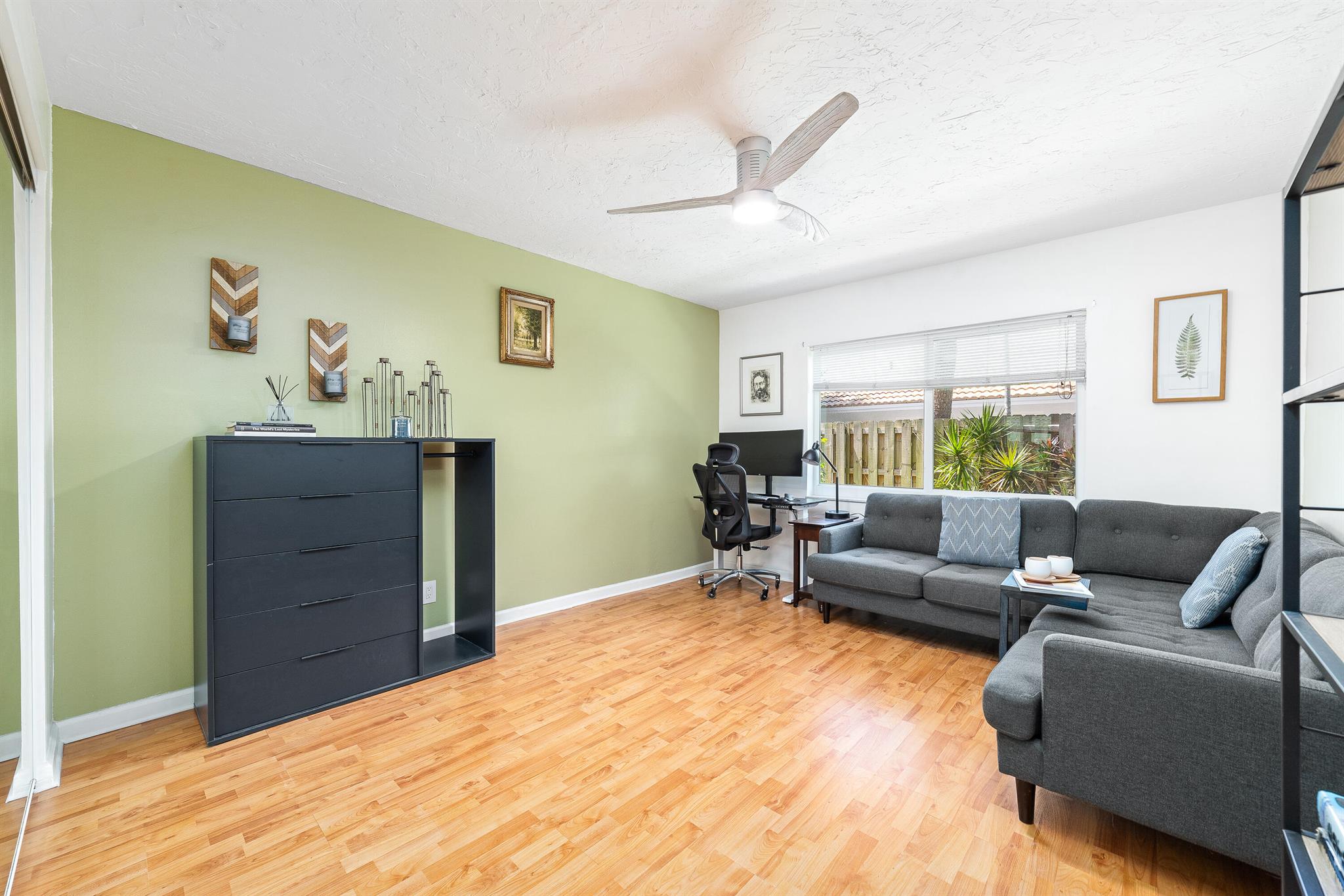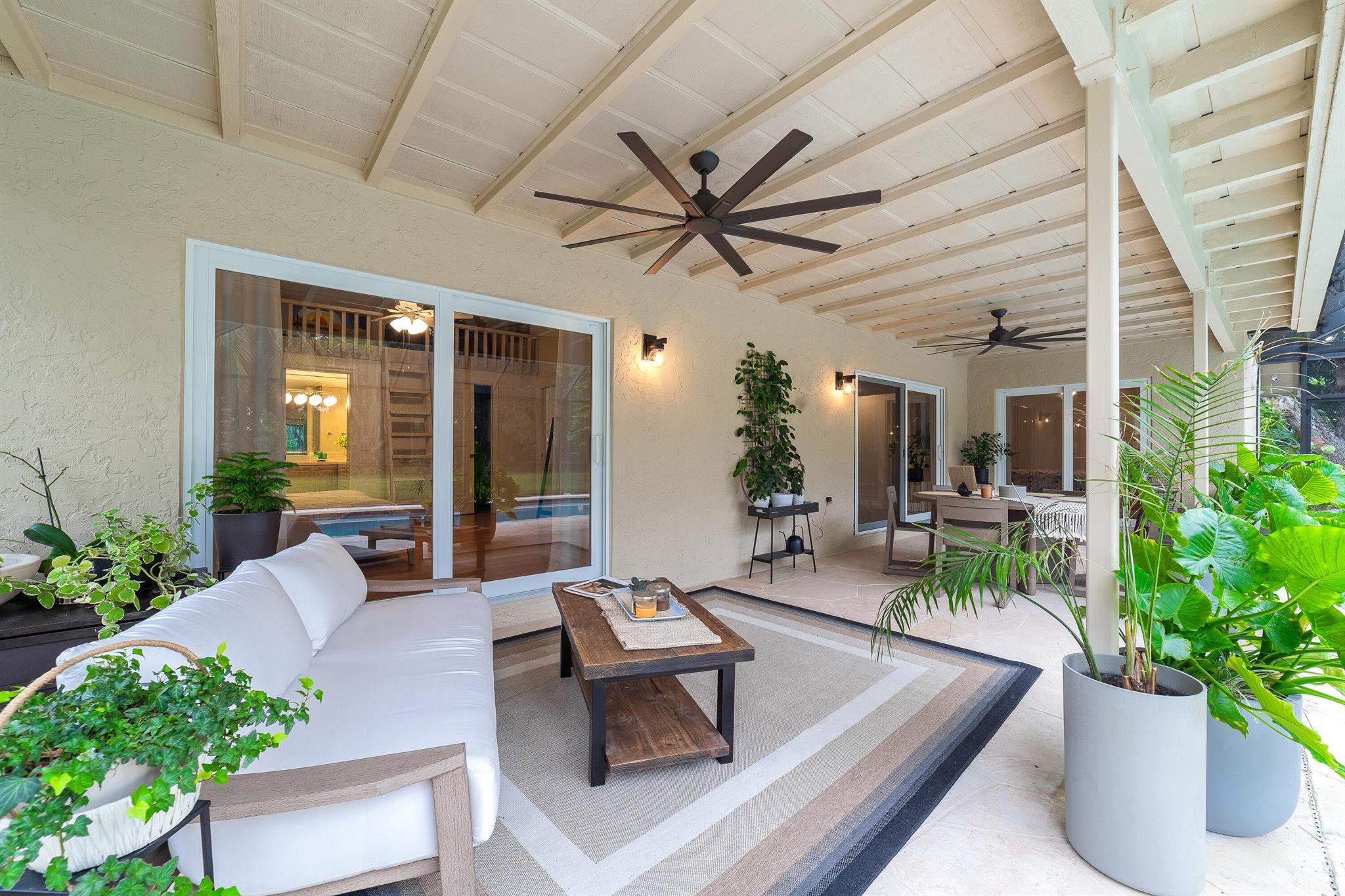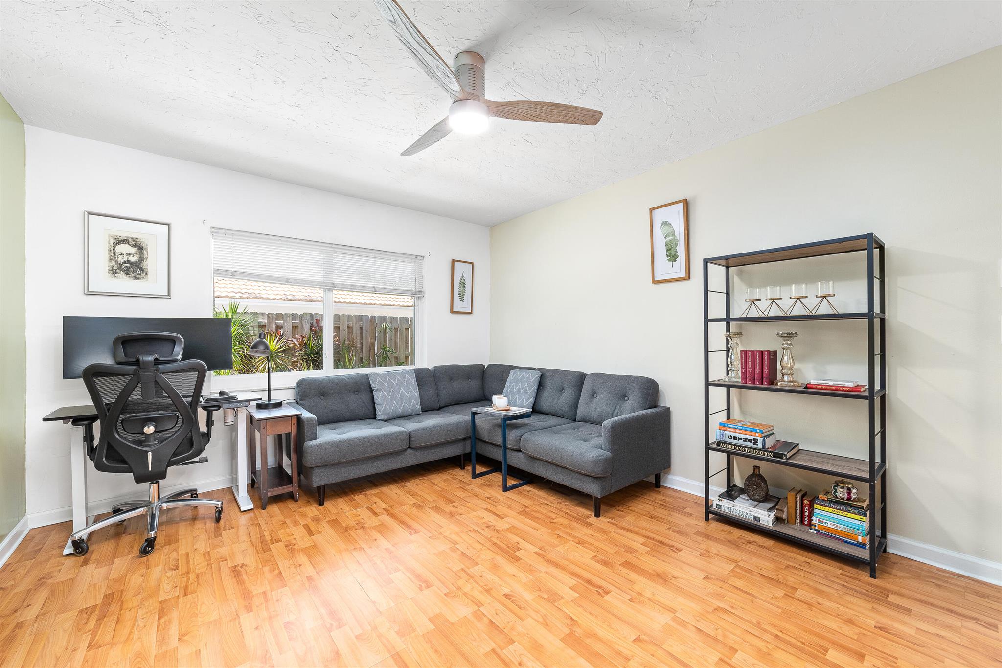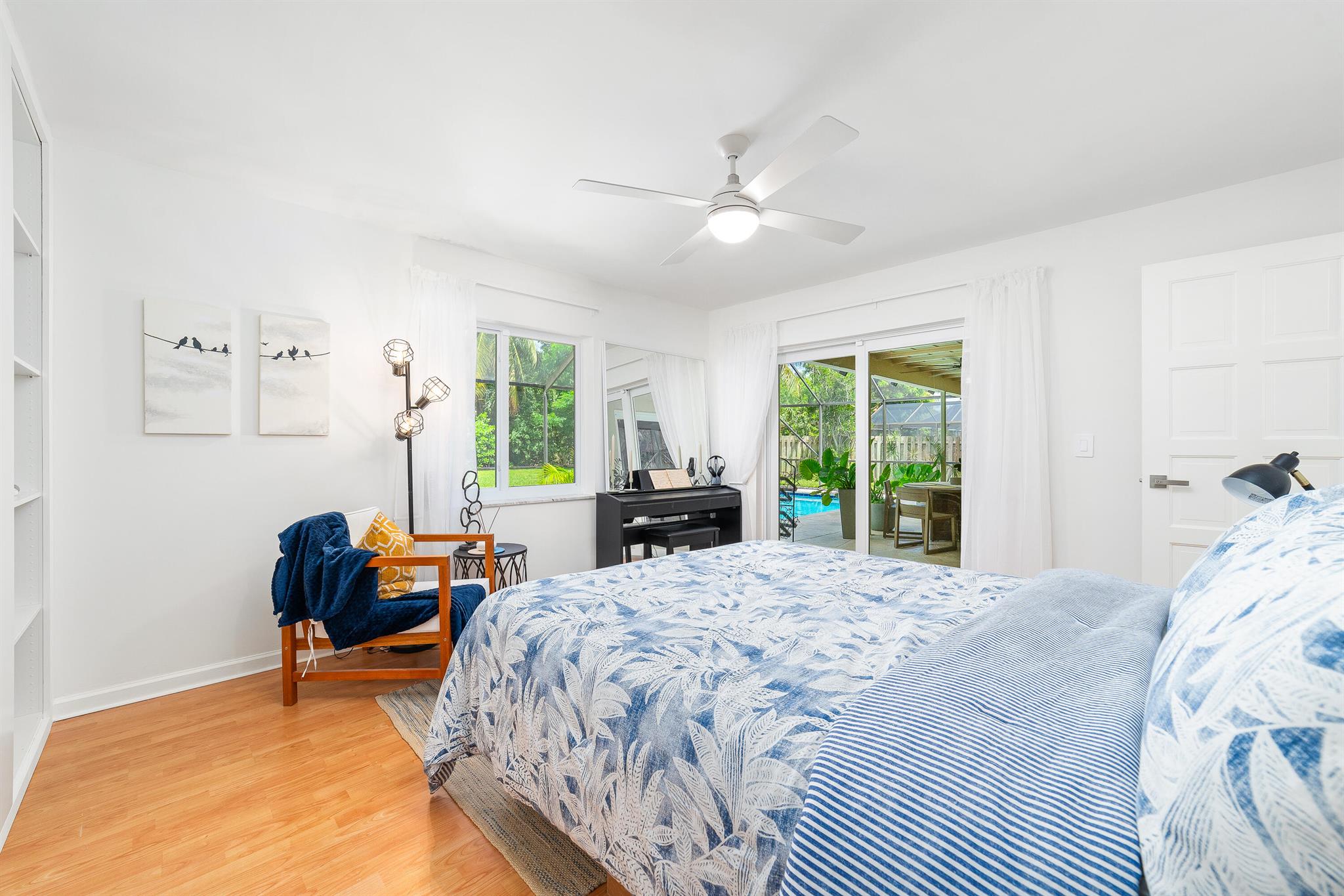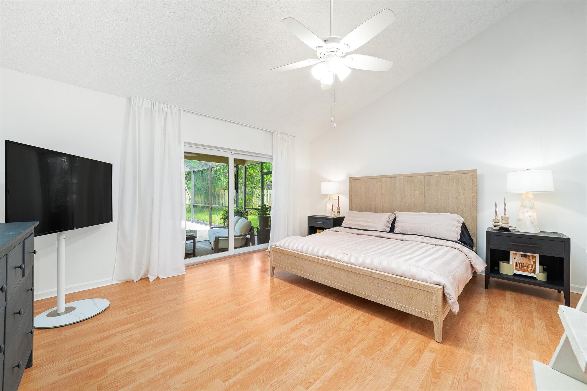 Freedom from an HOA exists! East Boca home located in an A-rated school district with stylish interior for today's aesthetic. This 3 bedroom, 2 bathroom features modern 2024 updates: smooth ceilings, updated bathrooms, custom closet, sleek A/C vents, new ceiling fans/lighting, and smart home technology. Micro-cement covered wood-burning fireplace is the centerpiece of the vaulted living room with new flooring. Your primary bedroom comes with a multi-purpose loft with a skylight. The heart of the home, your recently updated kitchen, overlooks the screened pool and grounds with large bedrooms on either side of it. Outside, you'll enjoy no rear neighbors and your own fruit trees in the fully fenced space. Close to George Snow Park and Whole Foods and restaurants.