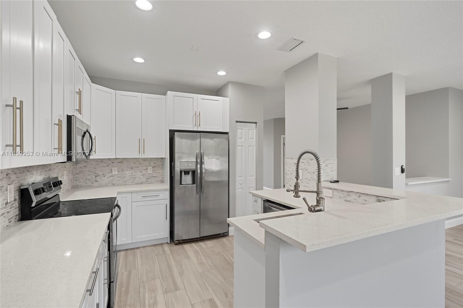 This beautiful large spacious home features 5 bedroom, 3.5 bath, 2 car garage on waterfront located in The Lakes Community. New Roof 8/2024 & Hurricane Impacted Windows 8/2024. High ceilings, updated kitchen & bathrooms, new tile flooring & carpet throughout, in-ground jacuzzi. Master bedroom & bath are on the first floor with separate tub & shower, with access to patio. Upstairs are the remaining 4 bedrooms & 2 jack & jill bathrooms. Great A-rated school districts , Community Pool, Playground and Soccer Field, Play Areas, Easy Access to Parks, Fabulous Restaurants, Terrific Shopping. Close to major highways and Cleveland Clinic.