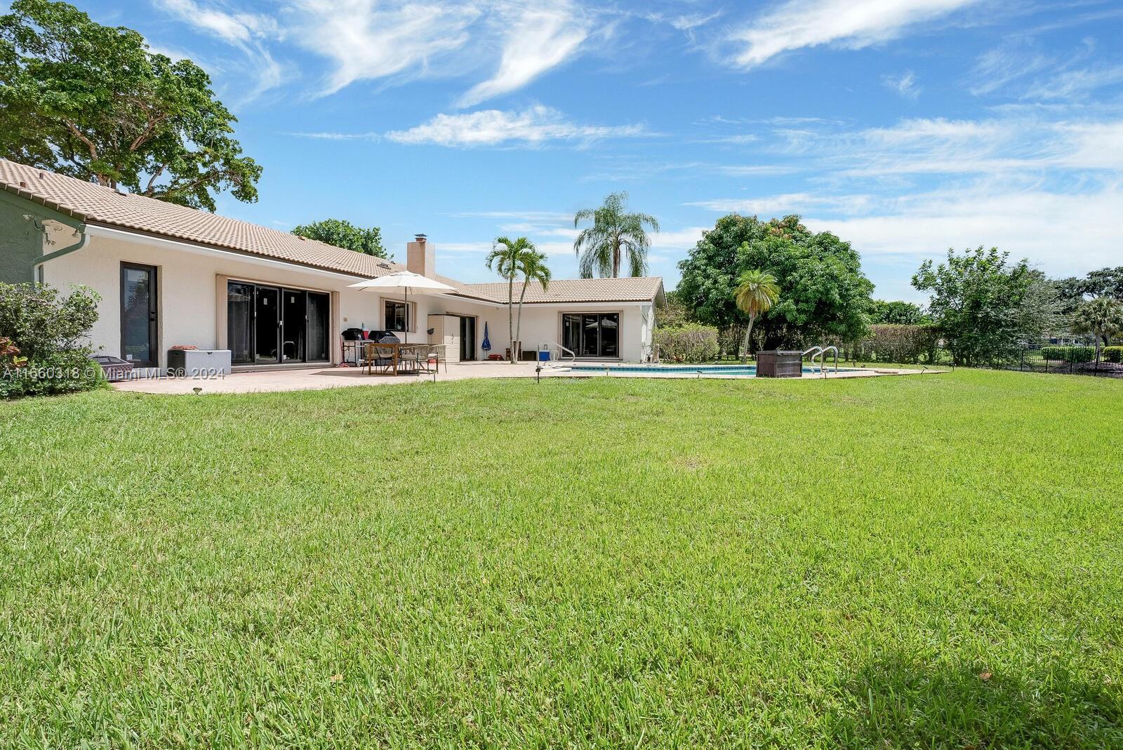 Contemporary custom designed 5/3 pool residence situated on expansive 18,759 waterfront lot. Overlooking the Jacaranda golf course offering a backdrop of tropical vistas, sunrise to sunset! New paved circular driveway surrounded by mature trees & shrubs. Expansive floorplan, primary bdrm new ensuite bath, 2 spacious bdrms w/ connecting new bathroom. Bonus area for office/den/library. Open dining/living w/ fireplace. Chef’s kitchen featuring 2 ovens, commercial size fridge/freezer, farmhouse sink, quartz countertops, plus large island w/walnut quartzite. Family room w/built in wet bar and cabana bath, additional media room & 2 bdrms perfect for guest suite or in-laws. New tile wood flooring, high ceilings & impact windows. Separate Laundry room. Make this exceptional property yours today!