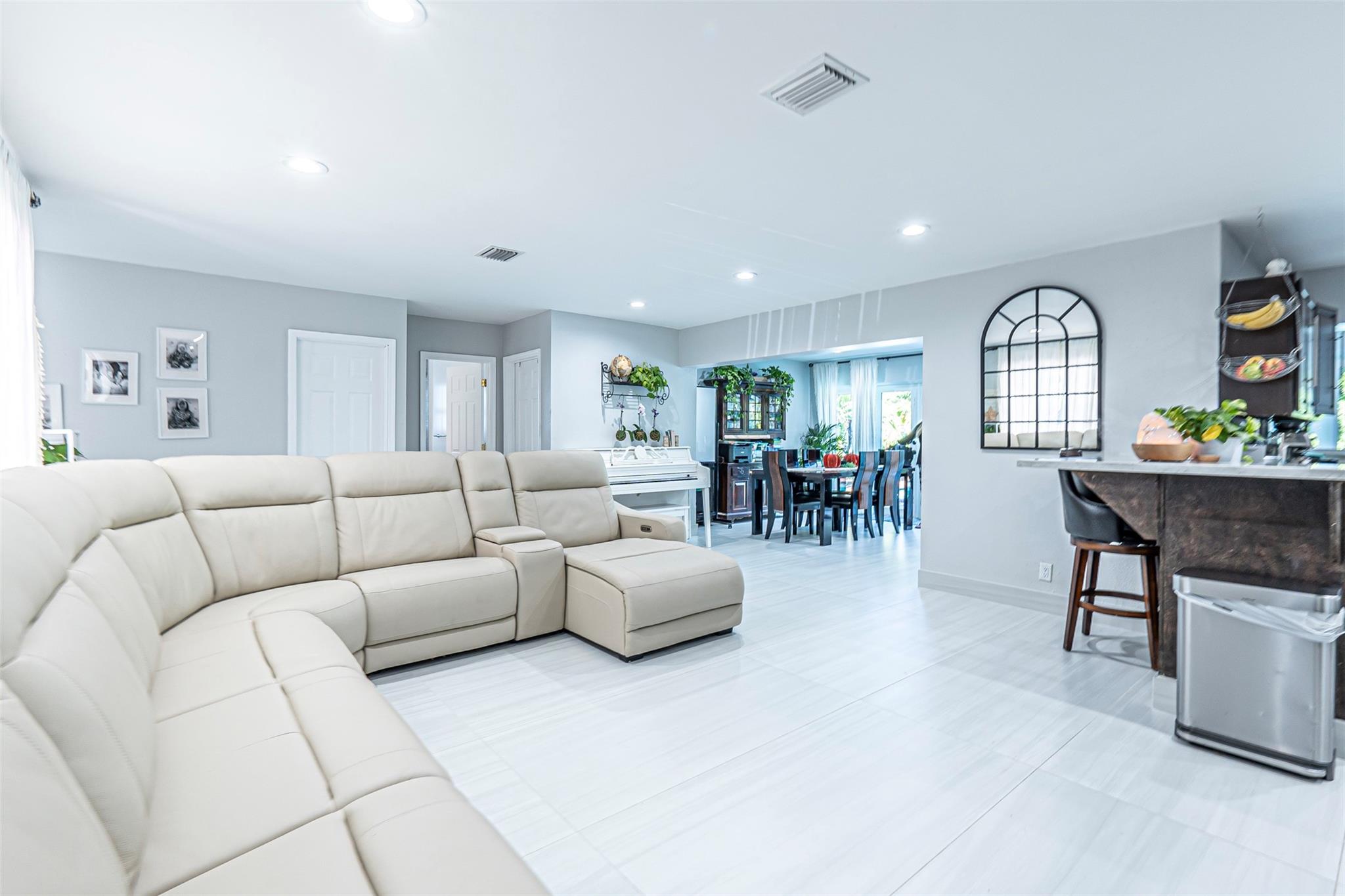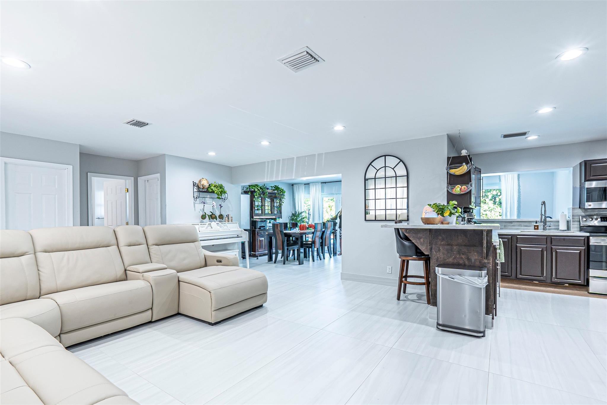 EAST of US1, close to beaches, shopping, restaurants. Featuring 3 OVERSIZED bedrooms & 2 new elegantly designed bathrooms. Step inside to find newly installed ITALIAN PORCELAIN TILE throughout the living area, giving the home a sleek & modern feel. The kitchen & bathrooms have been remodeled to provide a contemporary touch, while impact windows & doors ensure both safety & peace of mind. Outside enjoy the OVERSIZED POOL & BACKYARD, offering tons of space for the kids to play or to host gatherings. IMPACT WINDOWS & DOORS! 2018 ROOF! Imagine the SAVINGS ON INSURANCE! The garage has been converted to a playroom & workout space, & can be converted back to its original use. Best of all NO HOA restrictions so YOU CONTROL YOUR COST OF OWNERSHIP!