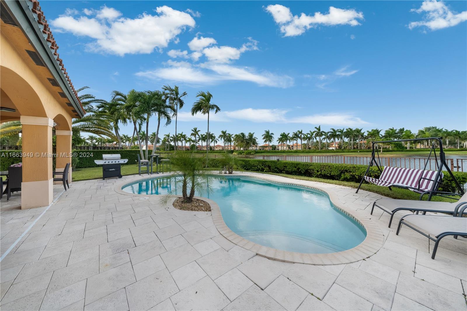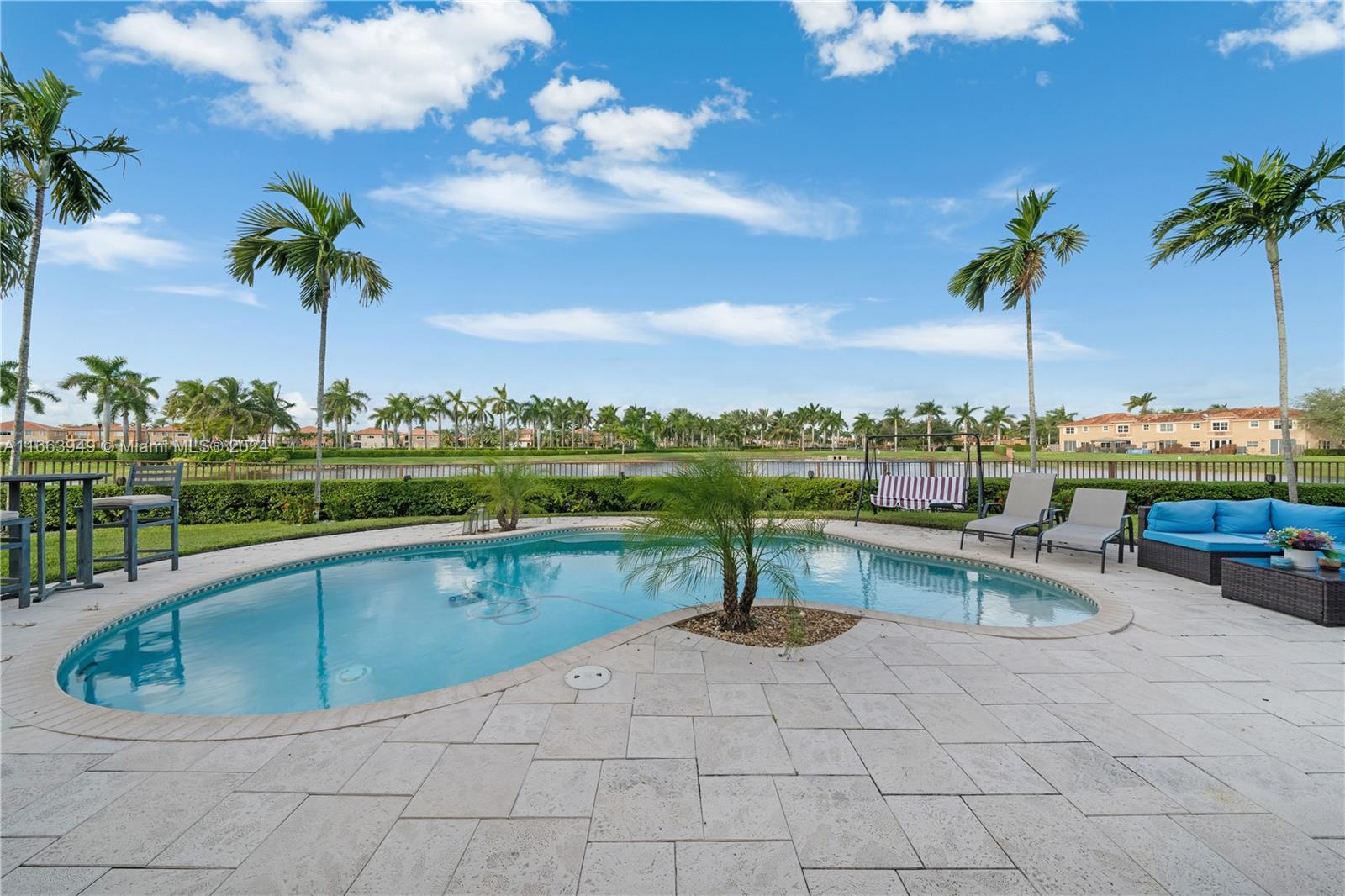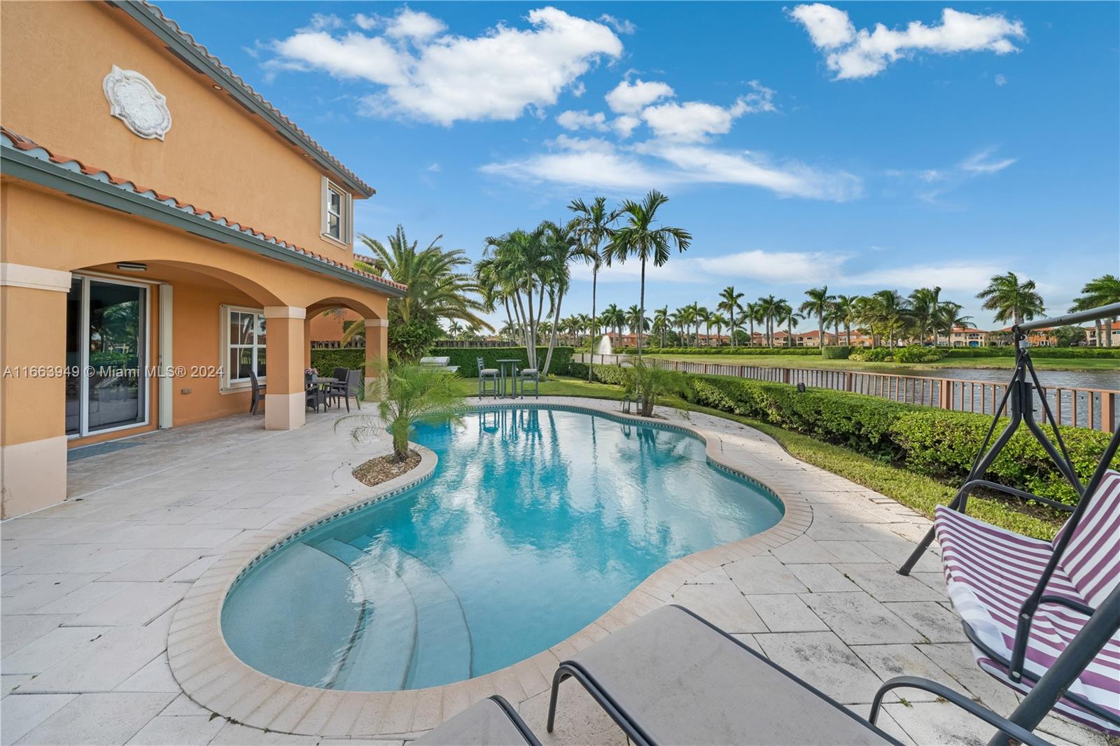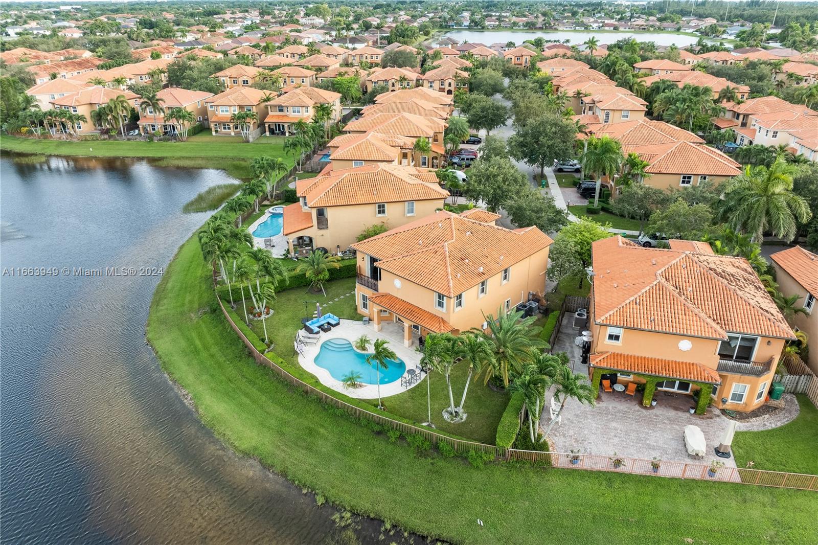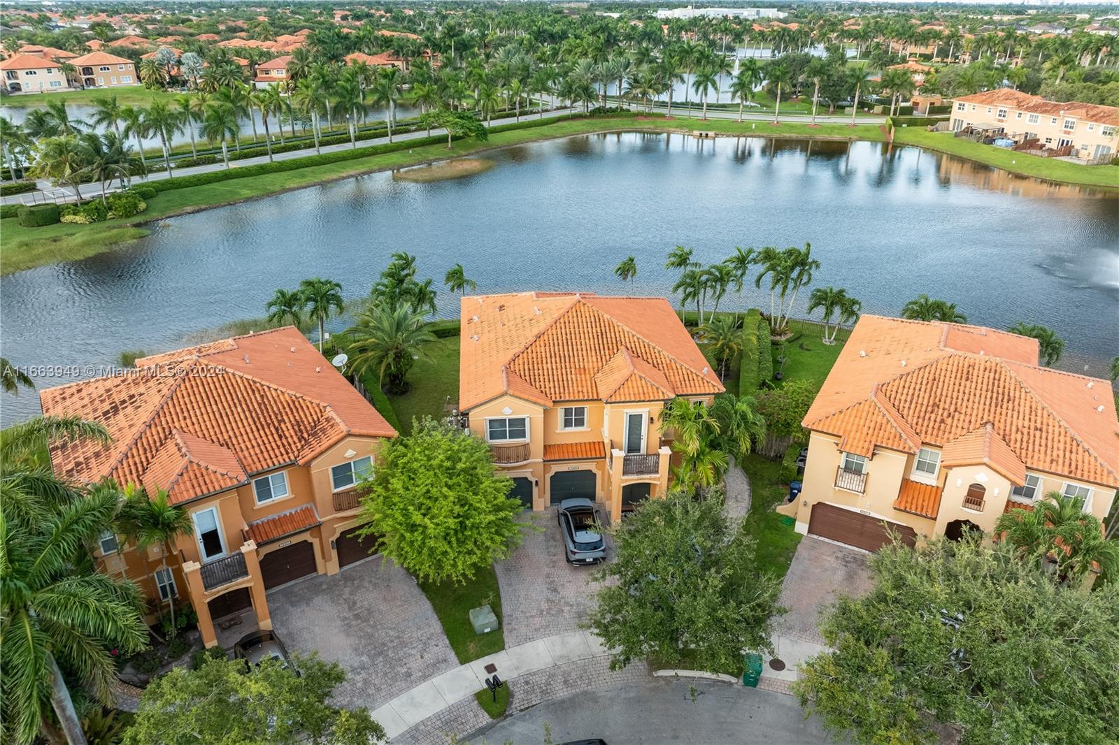 Expansive 8,109 s/f lot, offering breathtaking lake views, palm-lined surroundings, 2-car garage and an extended paver driveway. With 5 bedrooms and 4 bathrooms across 4,070 total s/f, this is the largest model in the community. The open-concept first floor boasts elegant Italian tile, a convenient laundry area, and a beautifully remodeled kitchen with sleek stainless steel appliances and quartz countertops. Second floor features a cozy living room/den, custom closets, and rich hardwood floors. Enjoy year-round comfort with three independent a/c units. Step outside to a large terrace with a uniquely shaped saltwater pool, complete with a CircuPool salt chlorinator system, all framed by stunning lake views and beautifully manicured ficus hedges and palm trees.