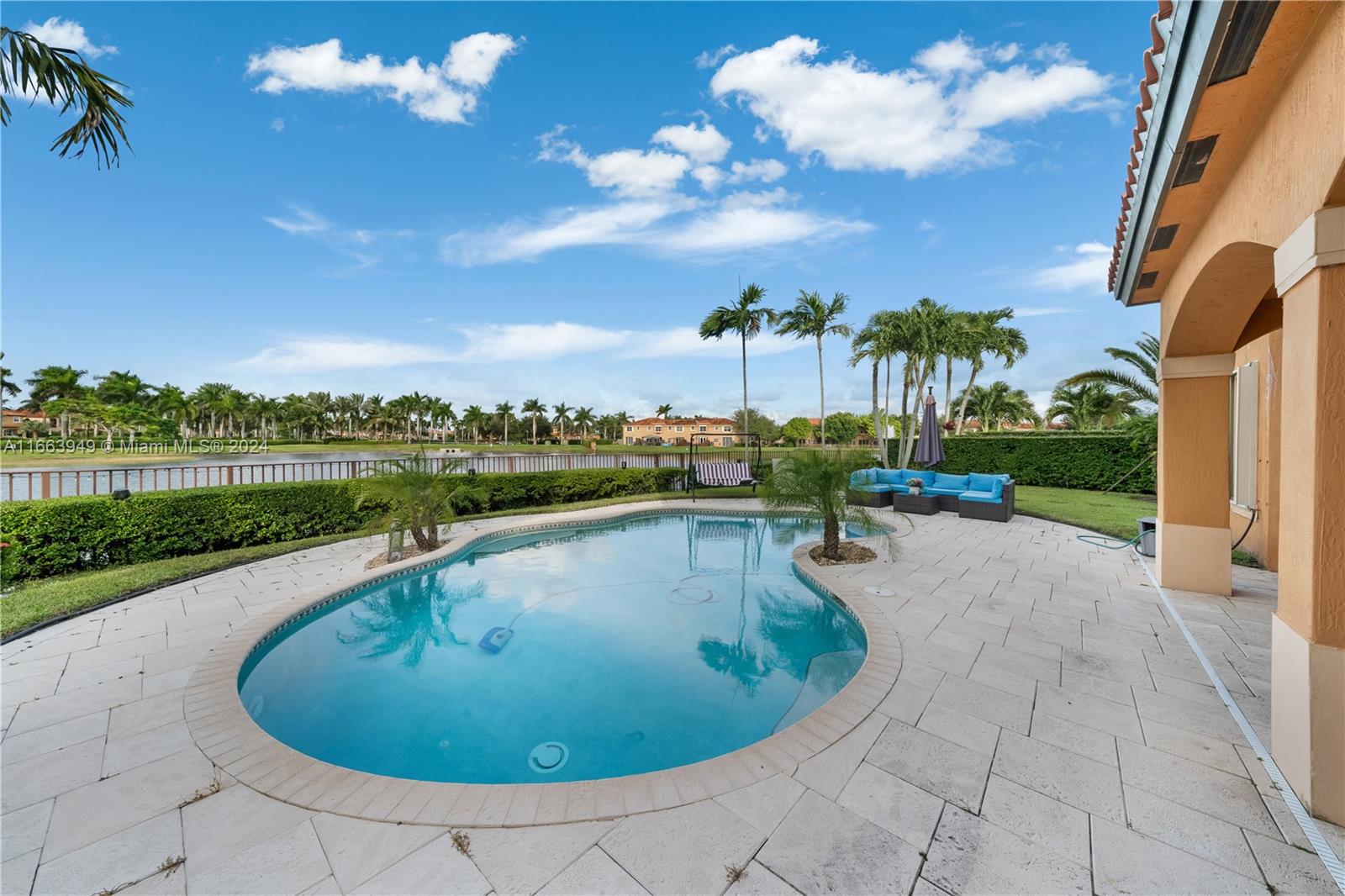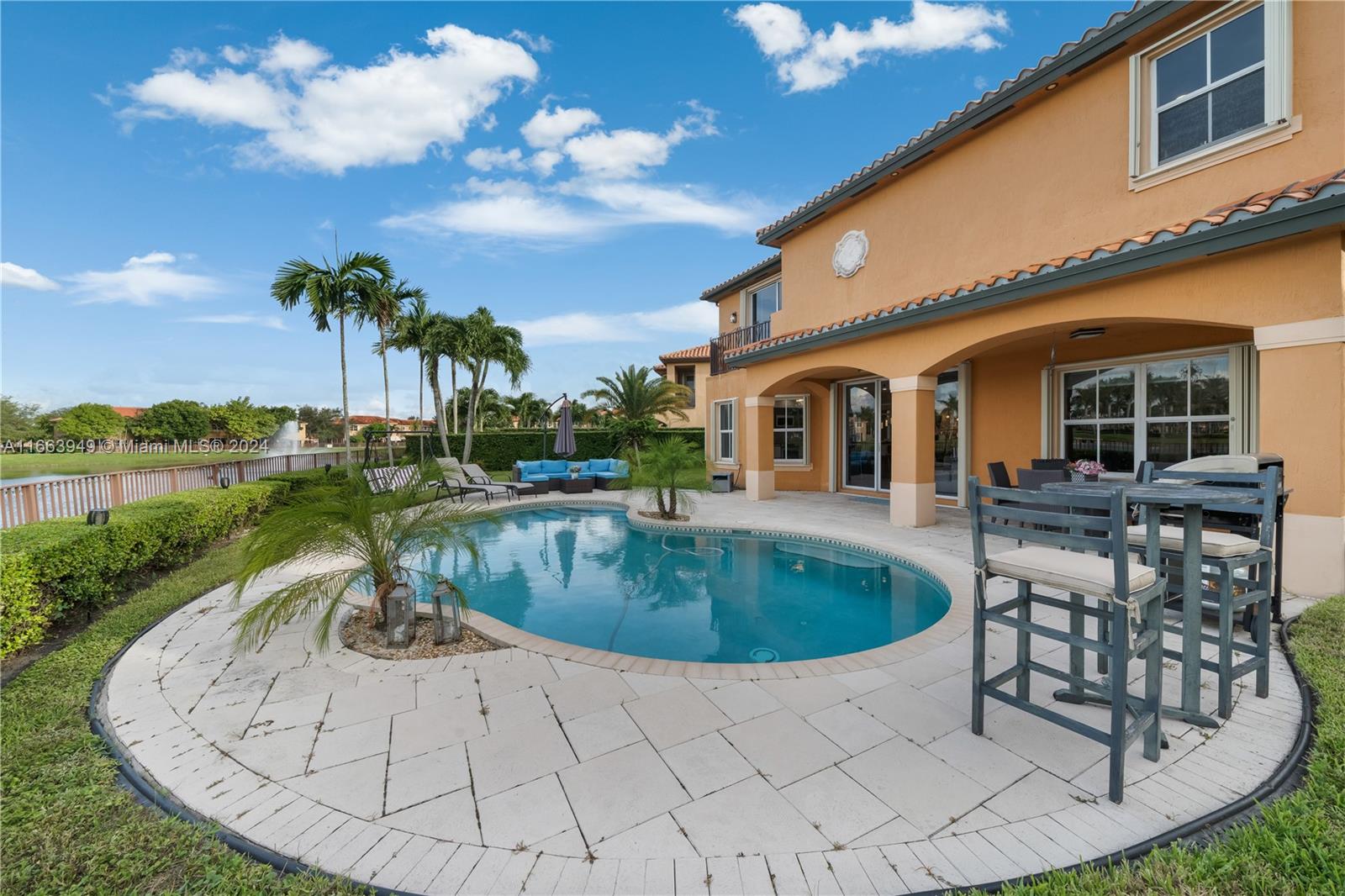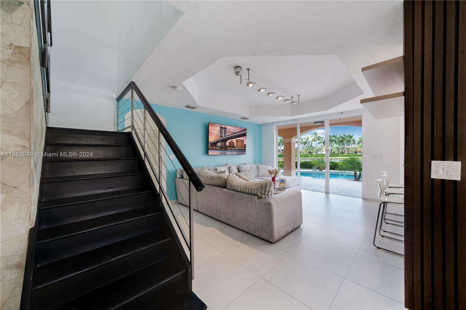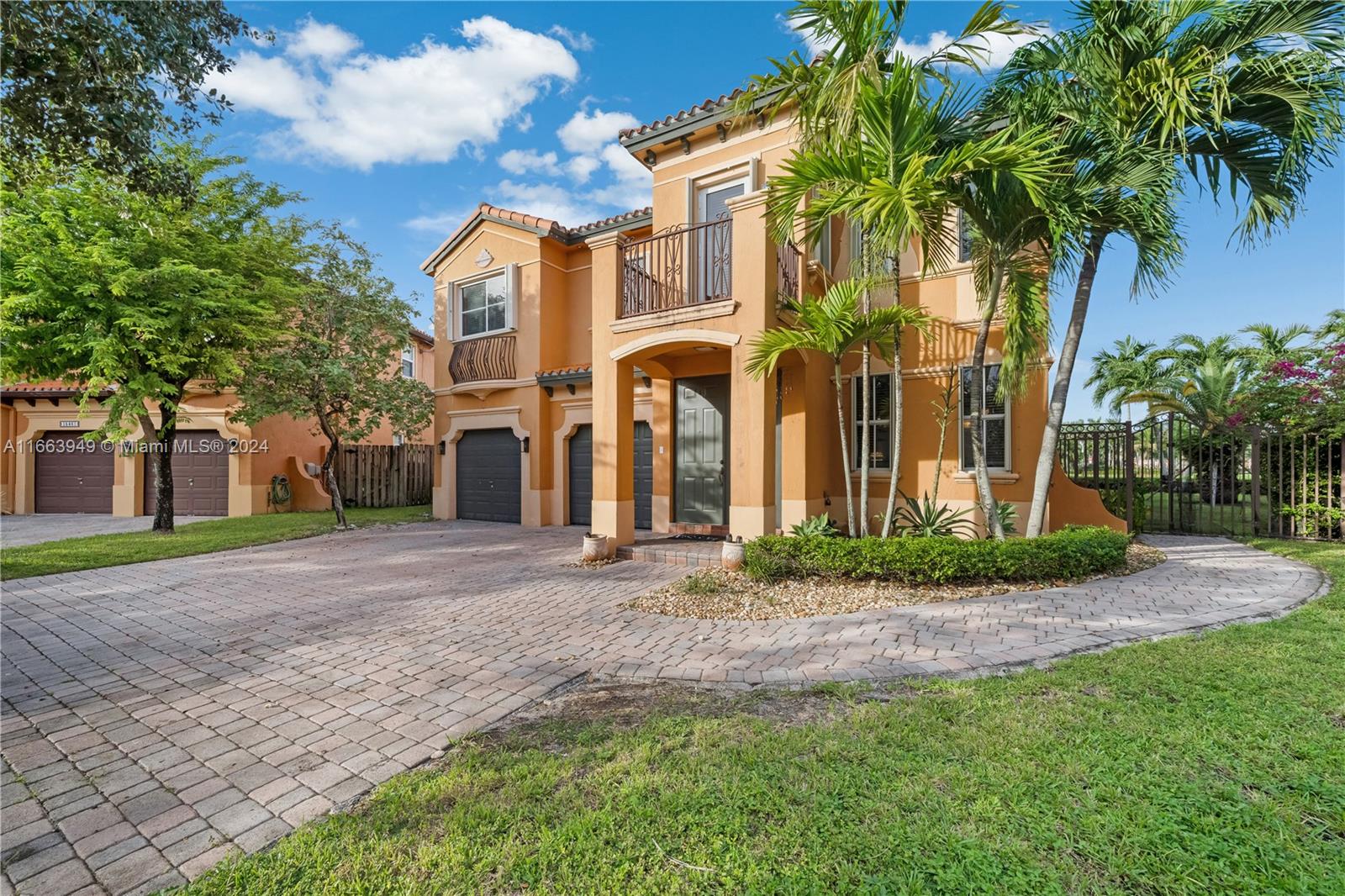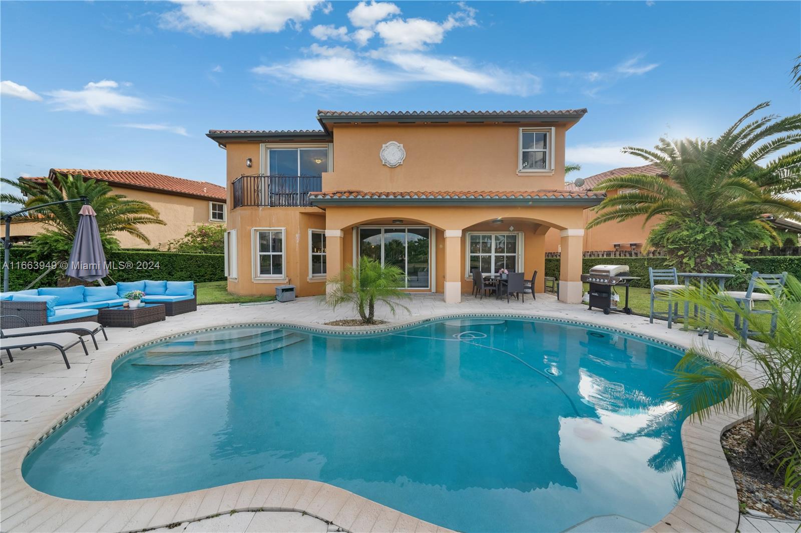 Expansive 8,109 s/f lot, offering breathtaking lake views, palm-lined surroundings, 2-car garage and an extended paver driveway. With 5 bedrooms and 4 bathrooms across 4,070 total s/f, this is the largest model in the community. The open-concept first floor boasts elegant Italian tile, a convenient laundry area, and a beautifully remodeled kitchen with sleek stainless steel appliances and quartz countertops. Second floor features a cozy living room/den, custom closets, and rich hardwood floors. Enjoy year-round comfort with three independent a/c units. Step outside to a large terrace with a uniquely shaped saltwater pool, complete with a CircuPool salt chlorinator system, all framed by stunning lake views and beautifully manicured ficus hedges and palm trees.