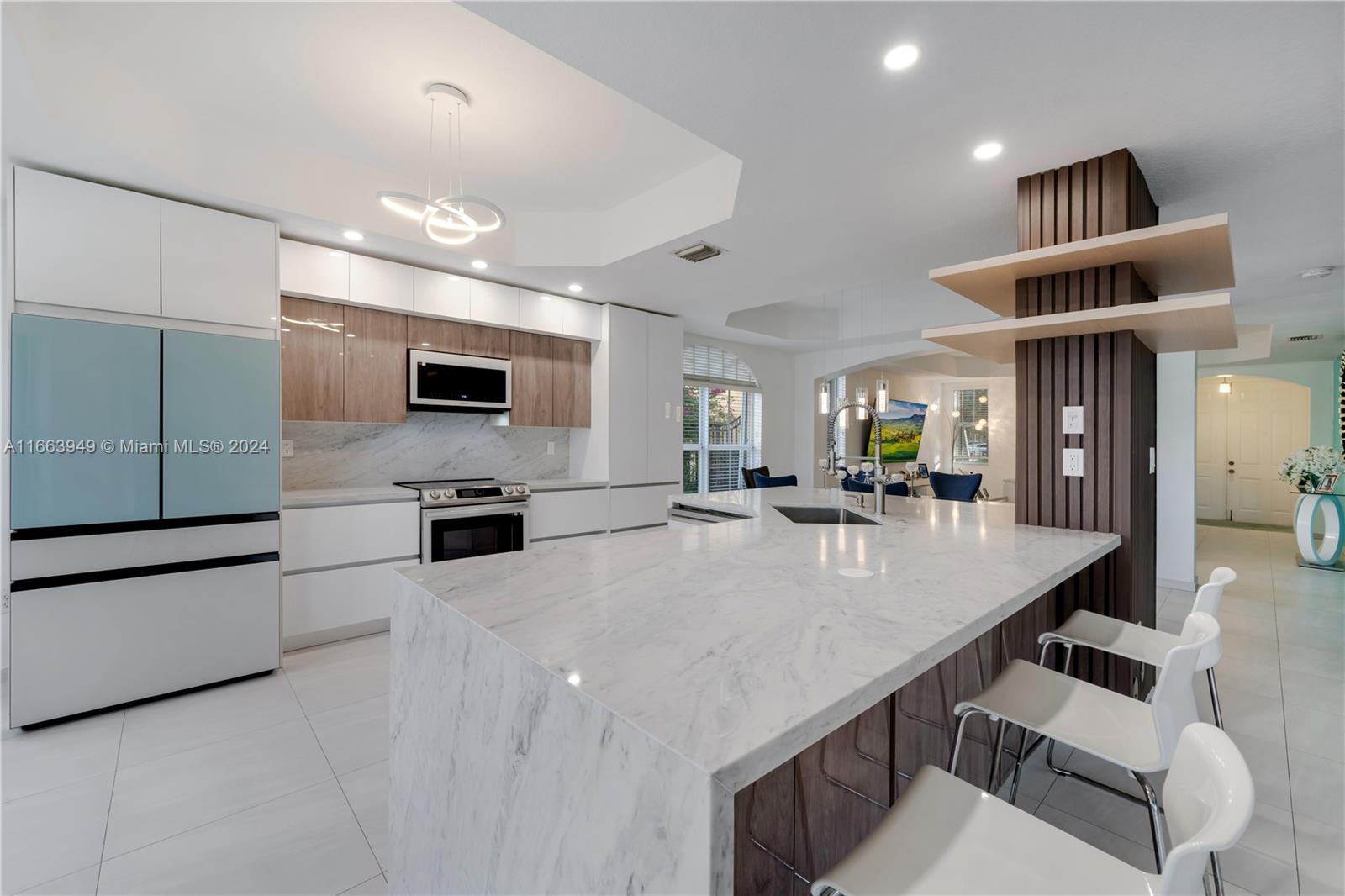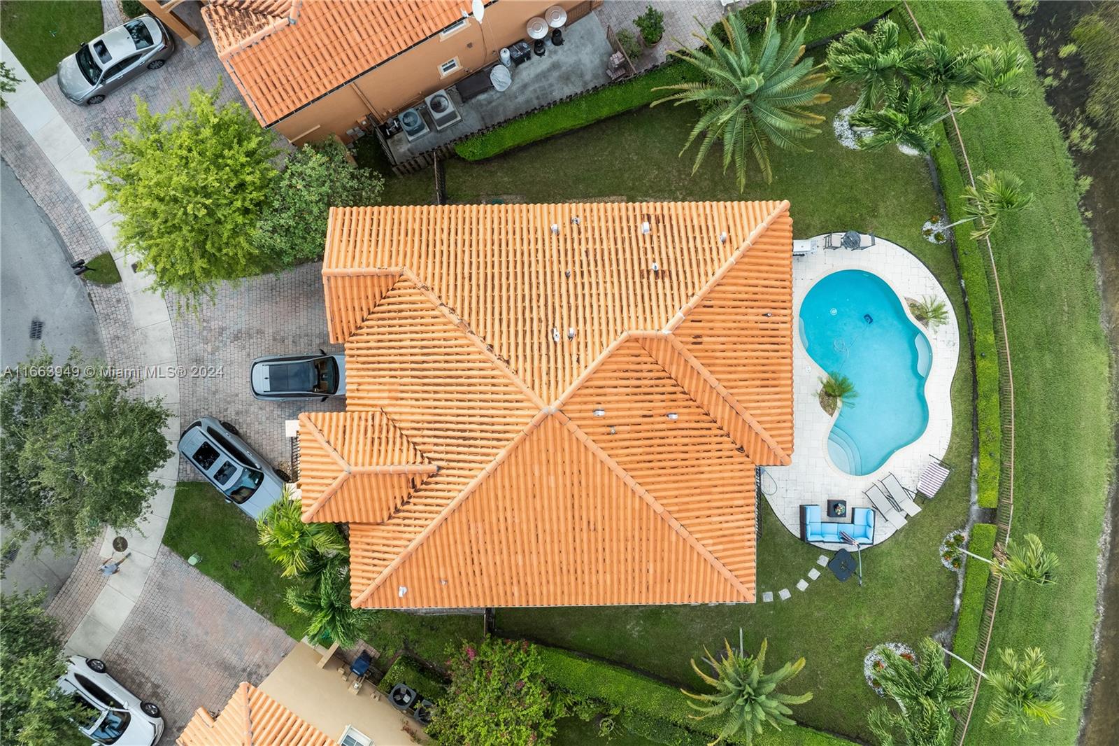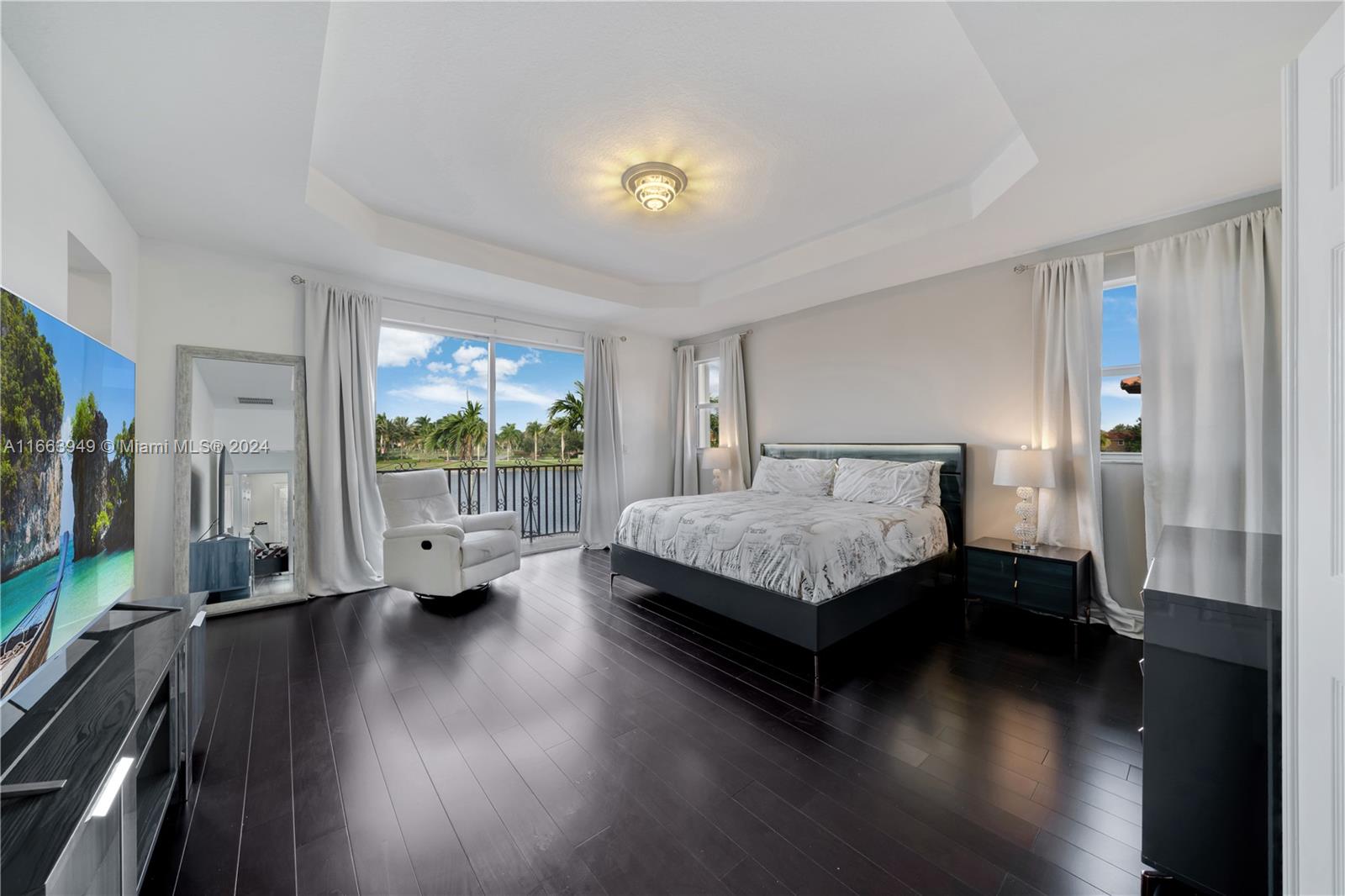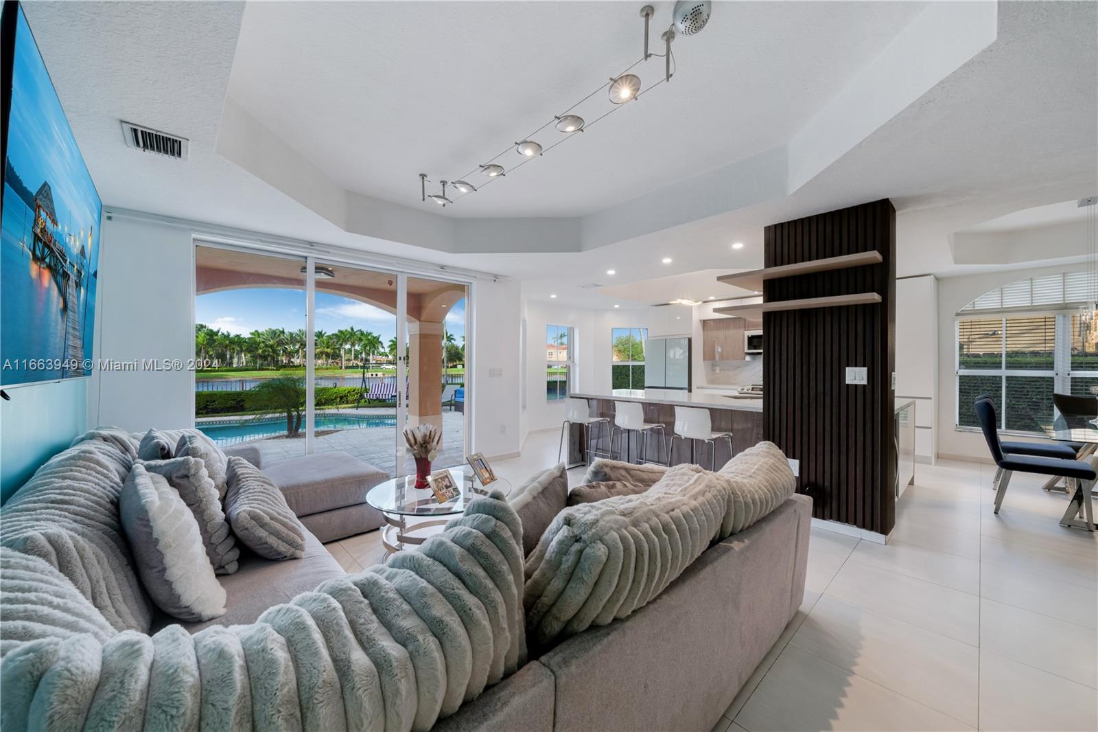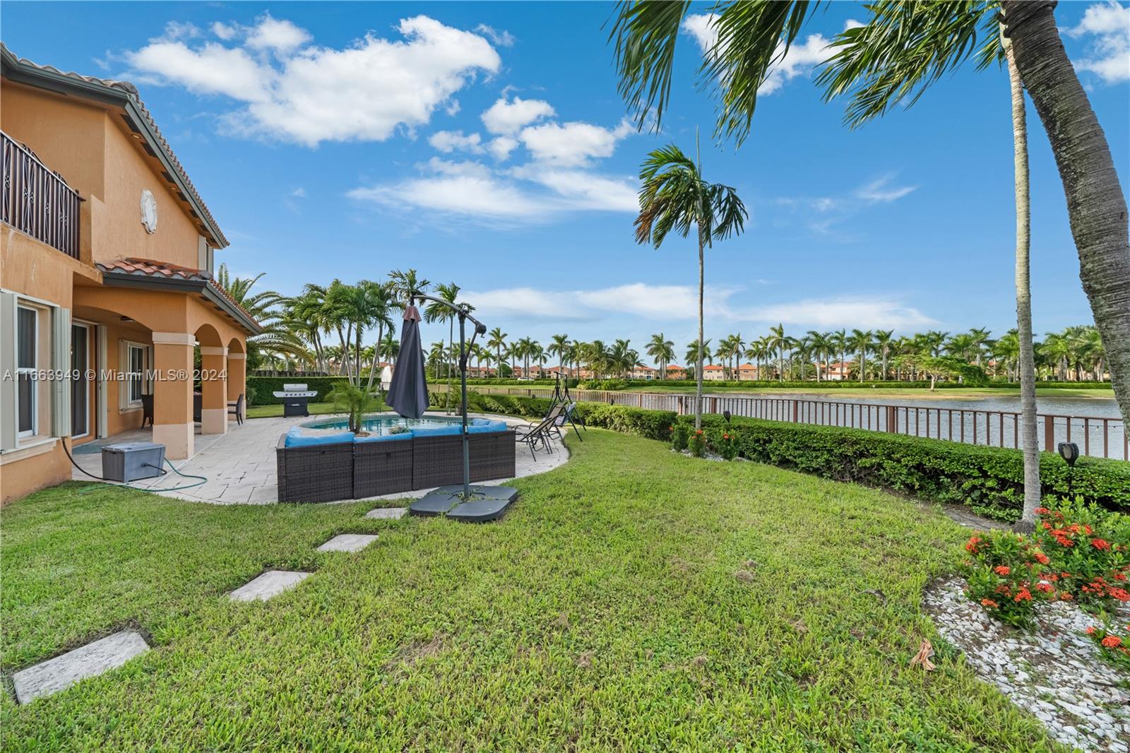 Expansive 8,109 s/f lot, offering breathtaking lake views, palm-lined surroundings, 2-car garage and an extended paver driveway. With 5 bedrooms and 4 bathrooms across 4,070 total s/f, this is the largest model in the community. The open-concept first floor boasts elegant Italian tile, a convenient laundry area, and a beautifully remodeled kitchen with sleek stainless steel appliances and quartz countertops. Second floor features a cozy living room/den, custom closets, and rich hardwood floors. Enjoy year-round comfort with three independent a/c units. Step outside to a large terrace with a uniquely shaped saltwater pool, complete with a CircuPool salt chlorinator system, all framed by stunning lake views and beautifully manicured ficus hedges and palm trees.