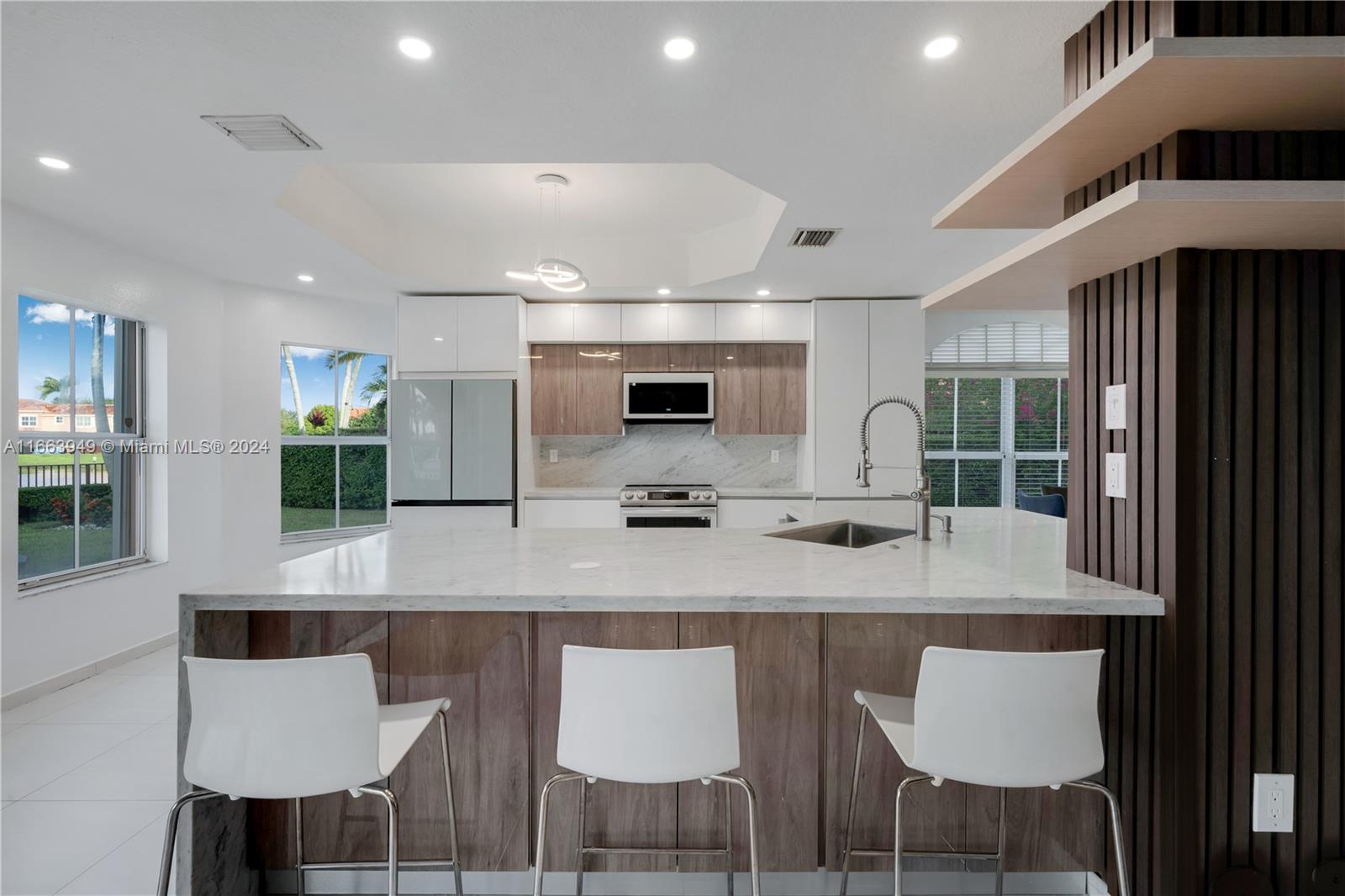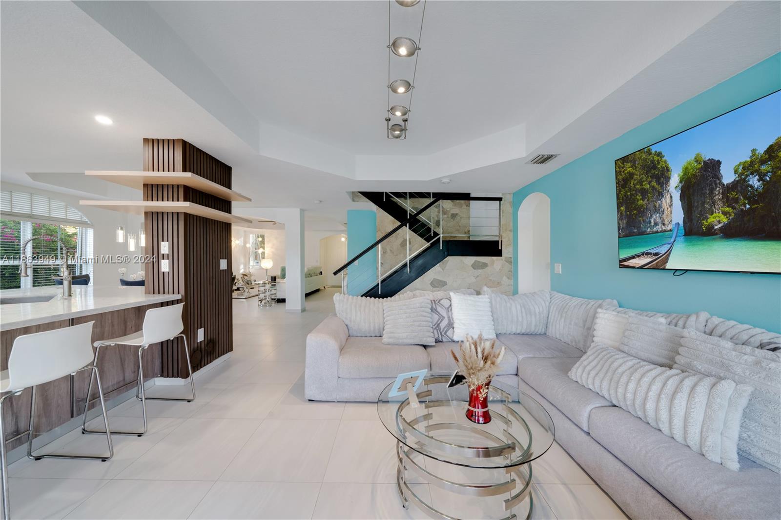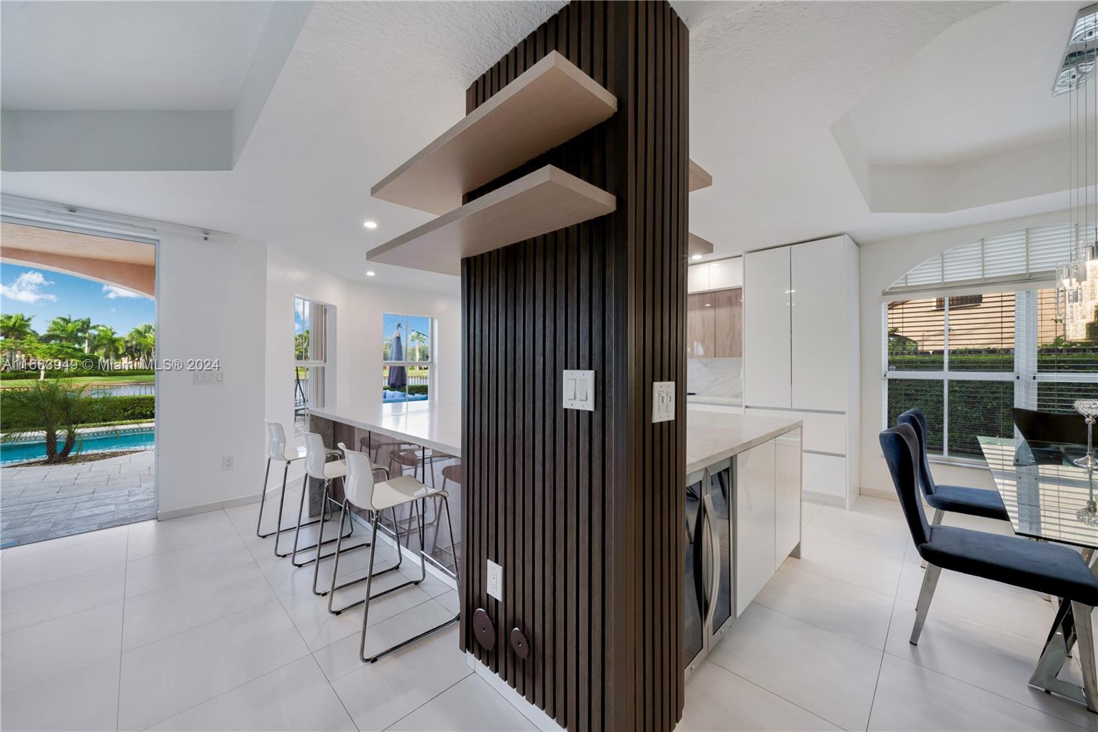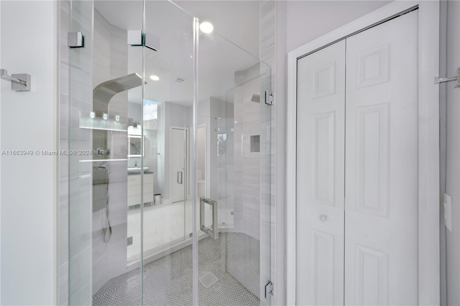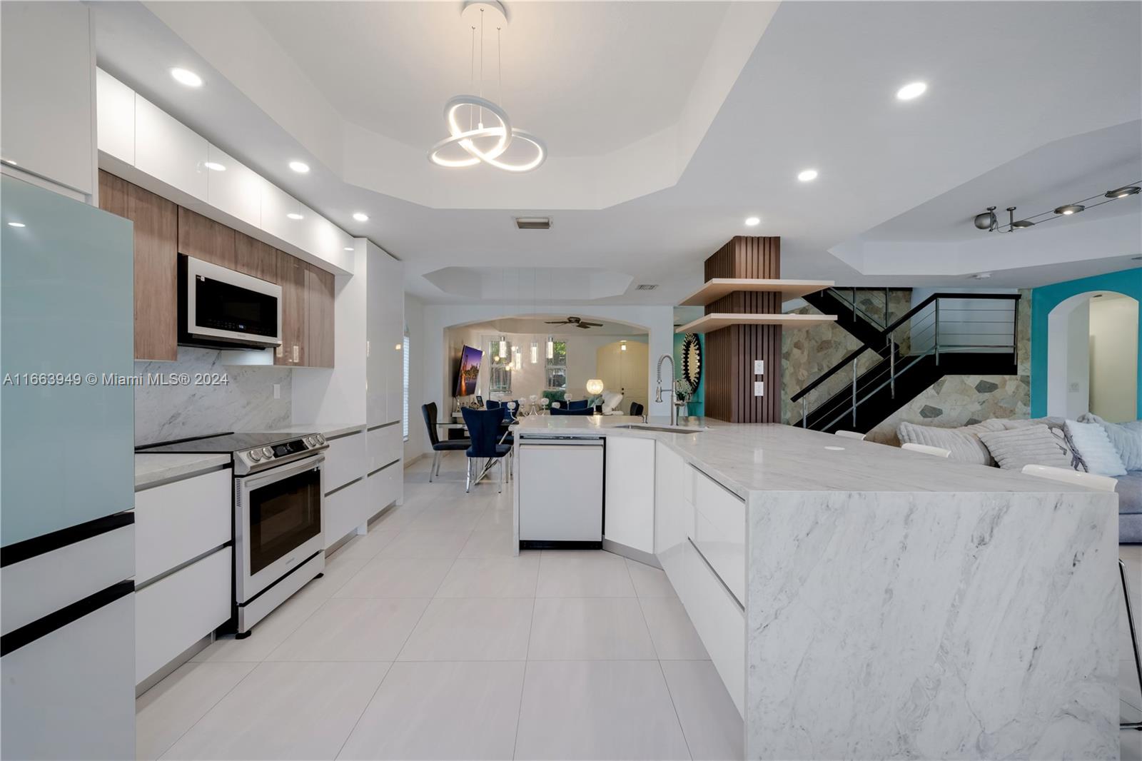 Expansive 8,109 s/f lot, offering breathtaking lake views, palm-lined surroundings, 2-car garage and an extended paver driveway. With 5 bedrooms and 4 bathrooms across 4,070 total s/f, this is the largest model in the community. The open-concept first floor boasts elegant Italian tile, a convenient laundry area, and a beautifully remodeled kitchen with sleek stainless steel appliances and quartz countertops. Second floor features a cozy living room/den, custom closets, and rich hardwood floors. Enjoy year-round comfort with three independent a/c units. Step outside to a large terrace with a uniquely shaped saltwater pool, complete with a CircuPool salt chlorinator system, all framed by stunning lake views and beautifully manicured ficus hedges and palm trees.