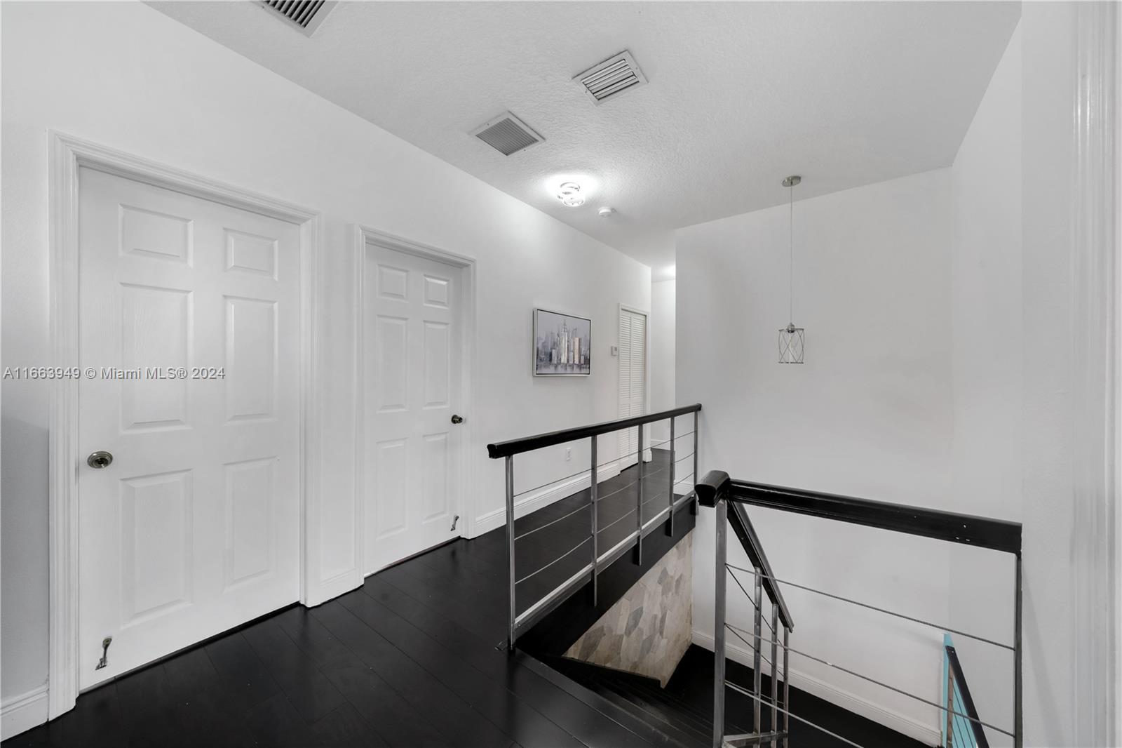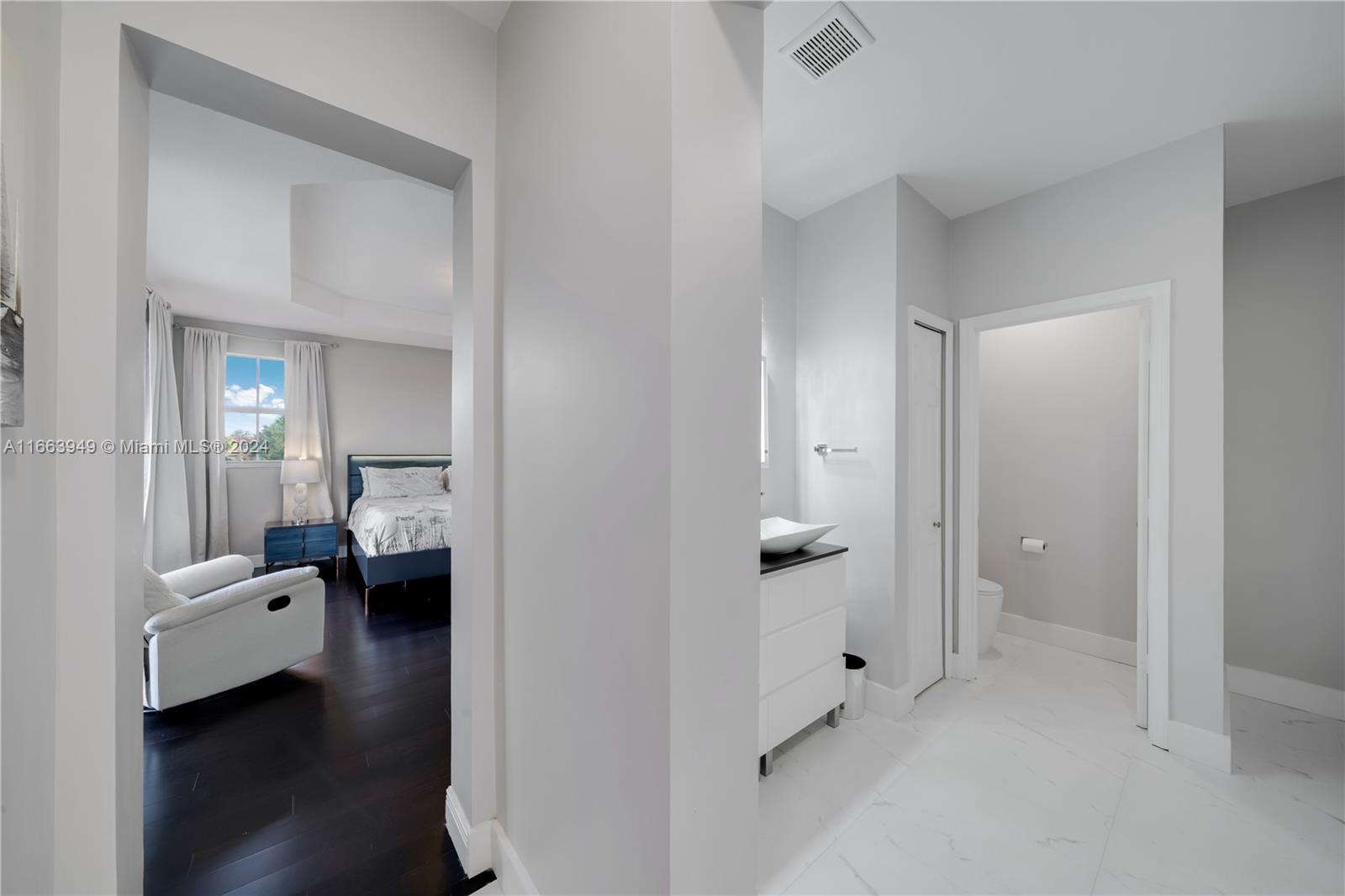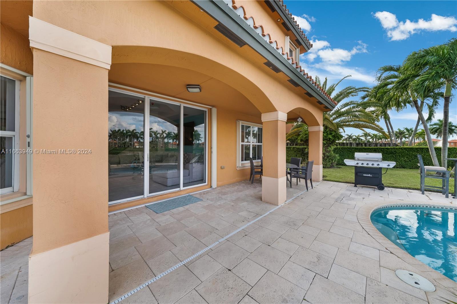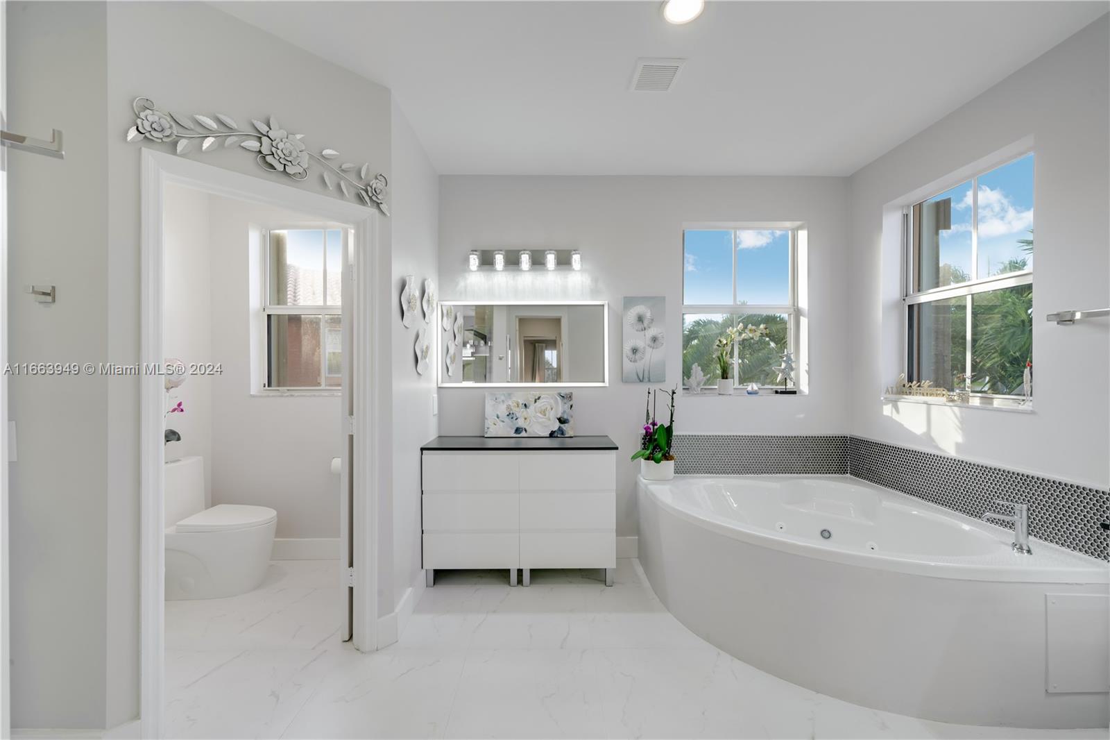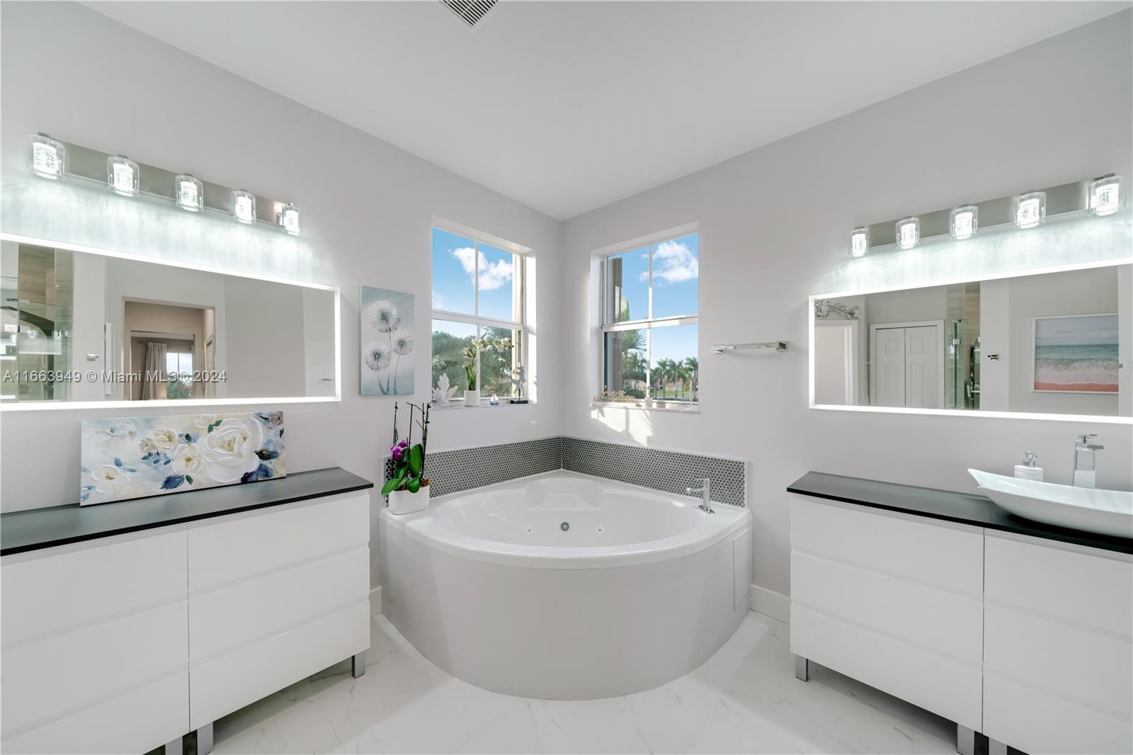 Expansive 8,109 s/f lot, offering breathtaking lake views, palm-lined surroundings, 2-car garage and an extended paver driveway. With 5 bedrooms and 4 bathrooms across 4,070 total s/f, this is the largest model in the community. The open-concept first floor boasts elegant Italian tile, a convenient laundry area, and a beautifully remodeled kitchen with sleek stainless steel appliances and quartz countertops. Second floor features a cozy living room/den, custom closets, and rich hardwood floors. Enjoy year-round comfort with three independent a/c units. Step outside to a large terrace with a uniquely shaped saltwater pool, complete with a CircuPool salt chlorinator system, all framed by stunning lake views and beautifully manicured ficus hedges and palm trees.
