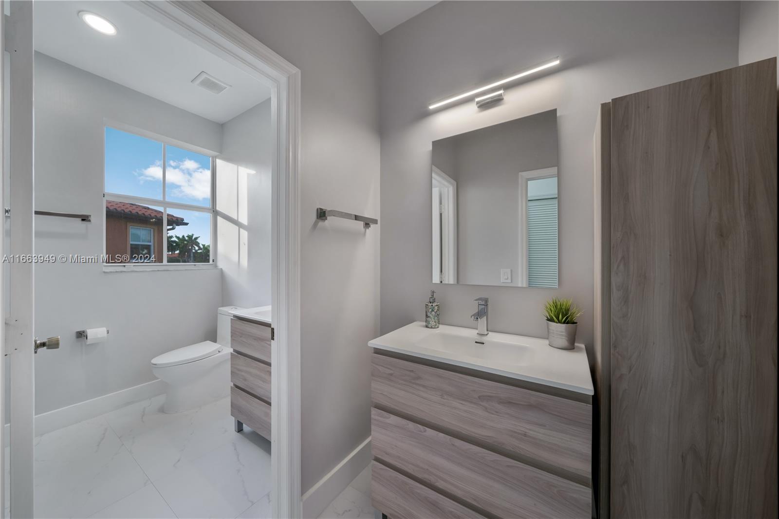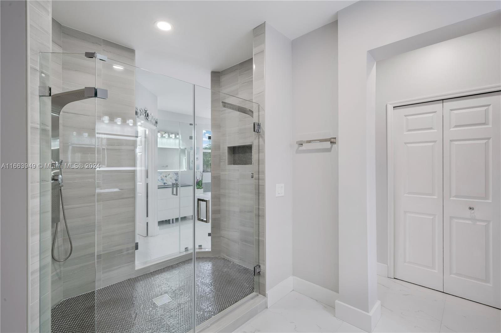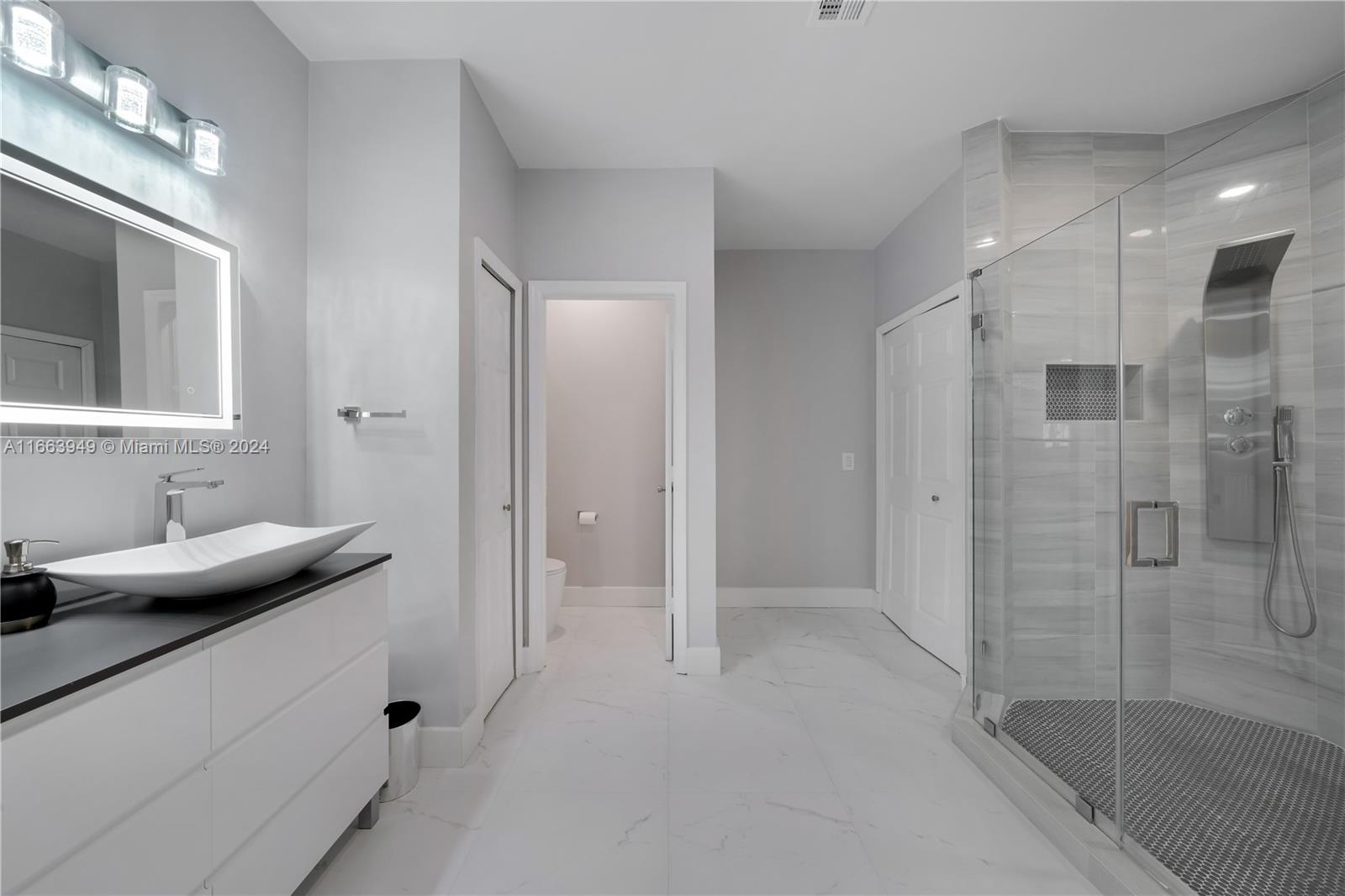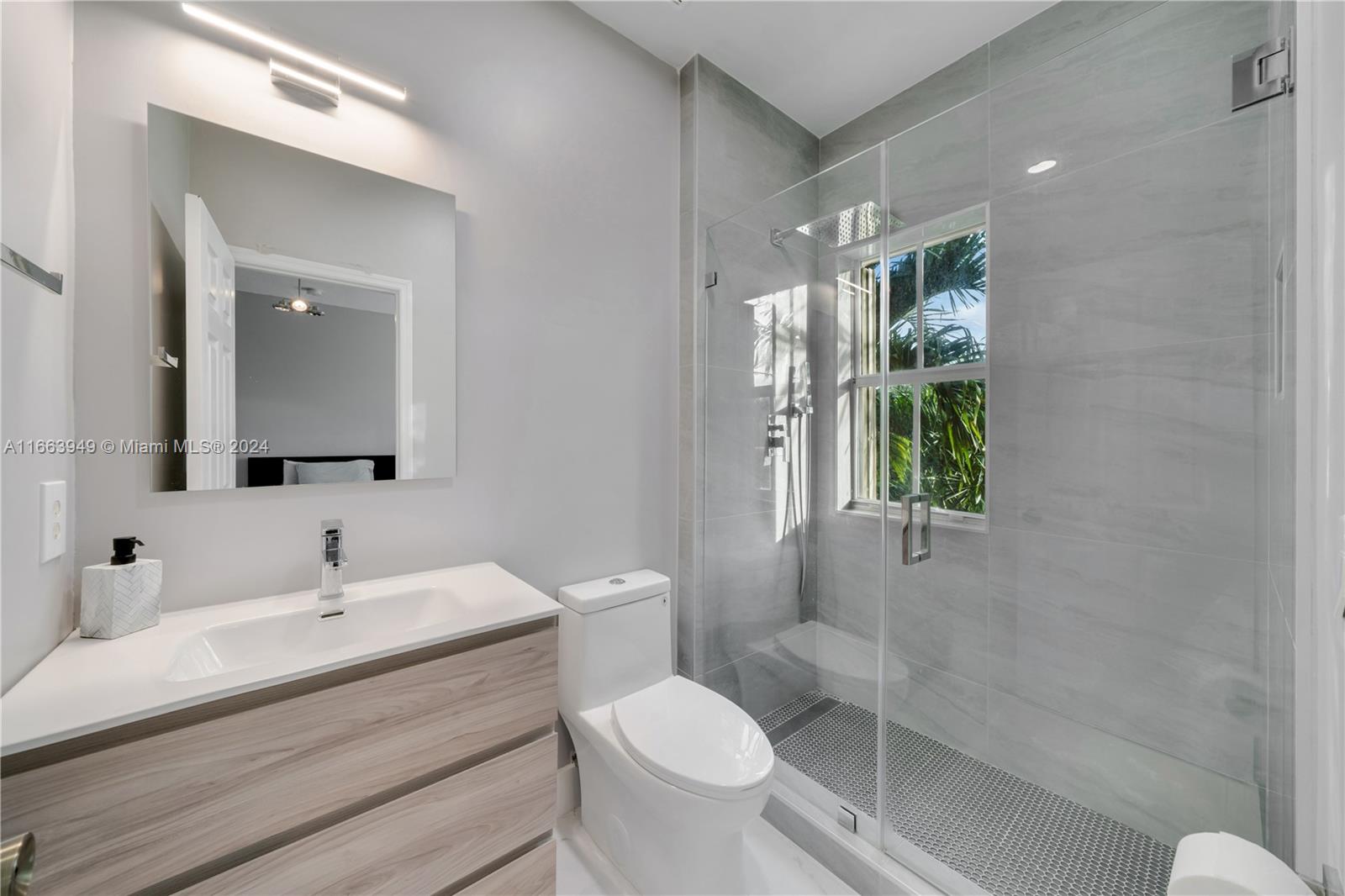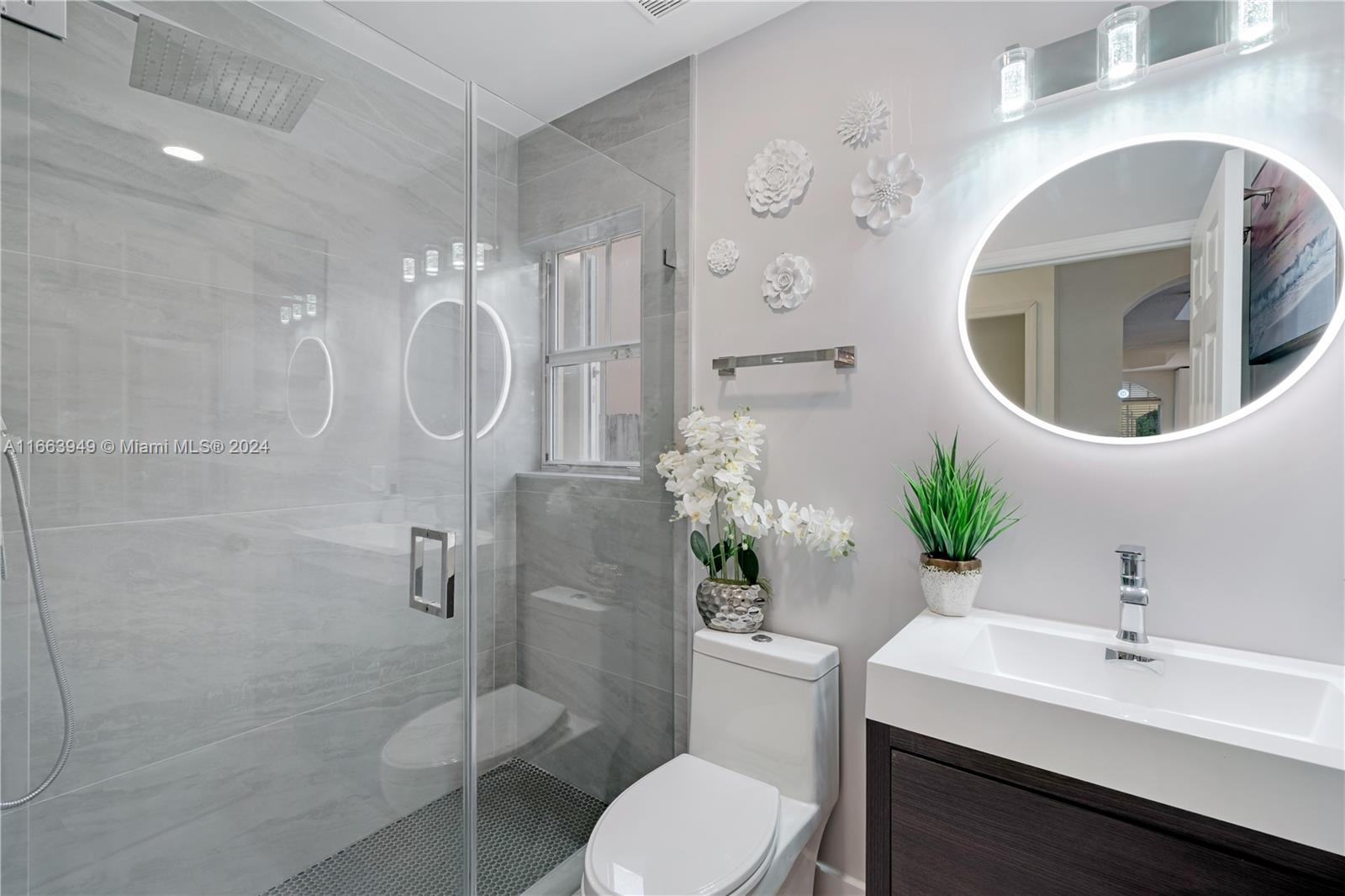 Expansive 8,109 s/f lot, offering breathtaking lake views, palm-lined surroundings, 2-car garage and an extended paver driveway. With 5 bedrooms and 4 bathrooms across 4,070 total s/f, this is the largest model in the community. The open-concept first floor boasts elegant Italian tile, a convenient laundry area, and a beautifully remodeled kitchen with sleek stainless steel appliances and quartz countertops. Second floor features a cozy living room/den, custom closets, and rich hardwood floors. Enjoy year-round comfort with three independent a/c units. Step outside to a large terrace with a uniquely shaped saltwater pool, complete with a CircuPool salt chlorinator system, all framed by stunning lake views and beautifully manicured ficus hedges and palm trees.