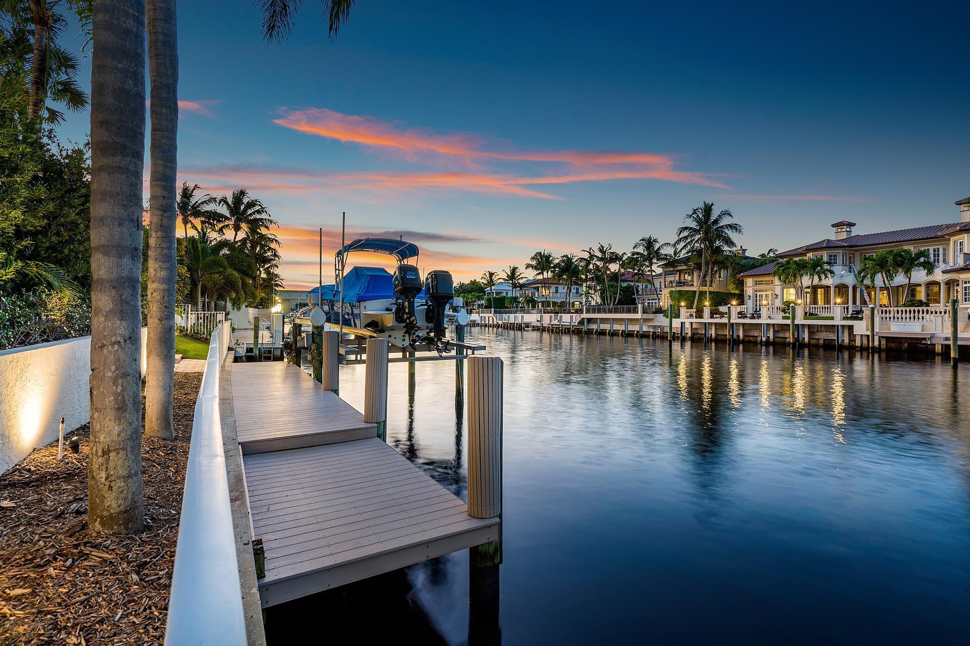 Introducing a waterfront masterpiece designed for those who value privacy and luxury living. This exceptional estate offers 89 feet on the widest canal in Royal Palm Yacht & Country Club and features a private dock with a boat lift, providing direct access to the Intracoastal. With sunny north exposure, the expansive outdoor living area boasts a heated free-form pool and spa surrounded by an elegant paver deck, creating an ideal space for relaxation or entertaining.The large covered patio is perfect for al fresco dining and features a striking spiral staircase leading to the VIP suites and balcony, offering serene water views. Inside, the gourmet eat-in kitchen with a spacious island and walk-in pantry meets the culinary needs of any chef, while the formal dining room, highlighted