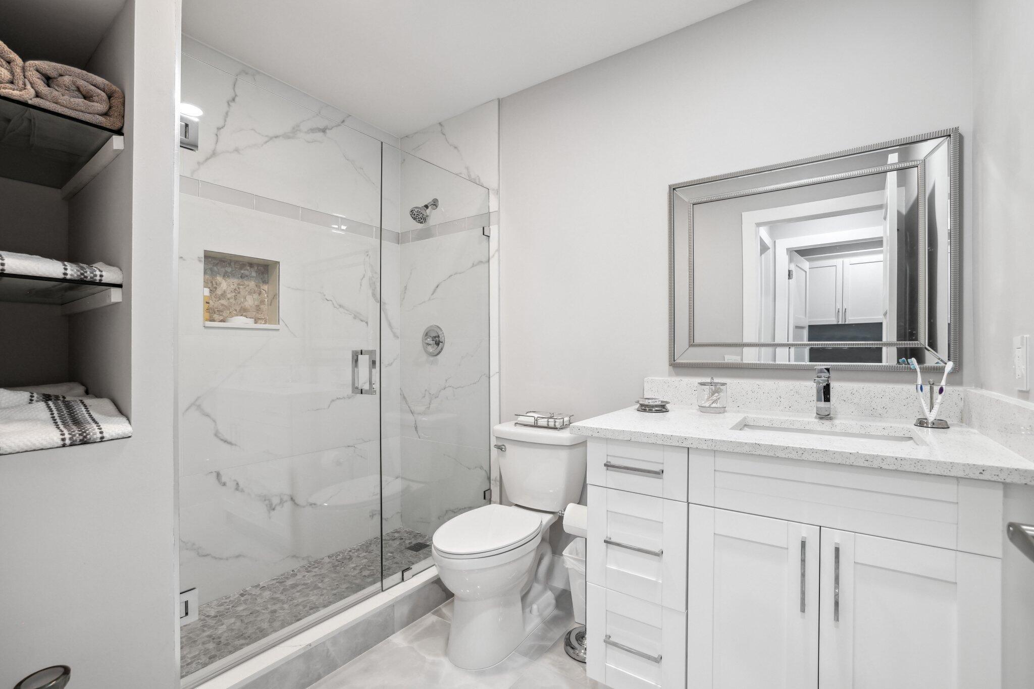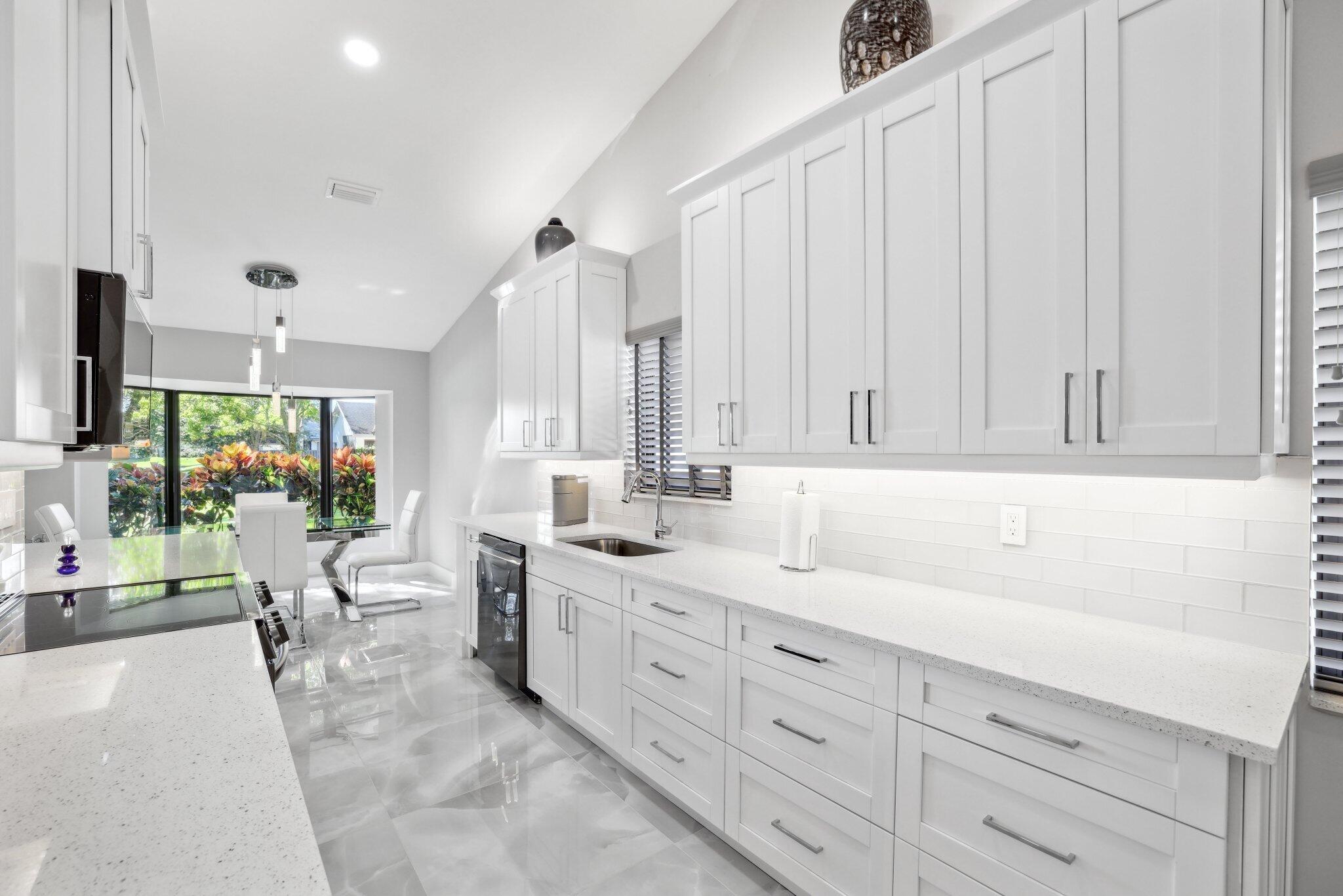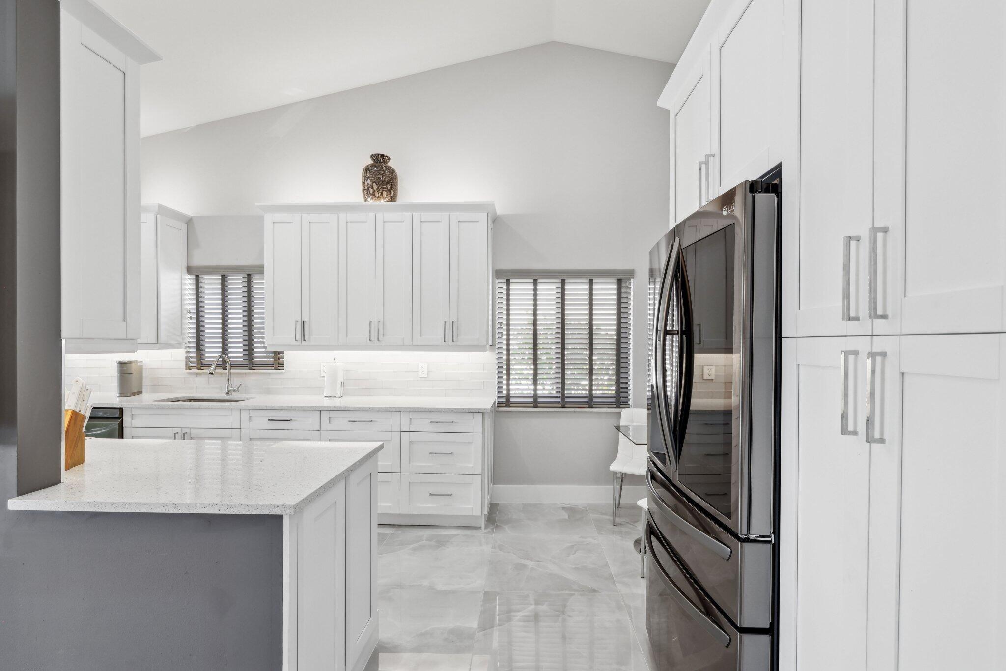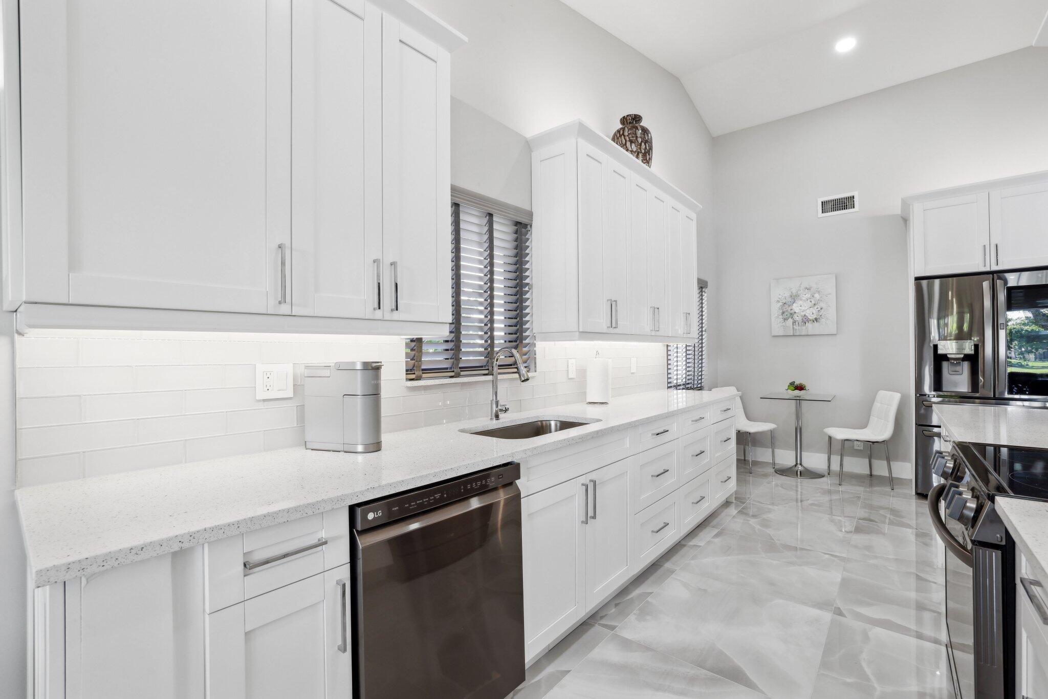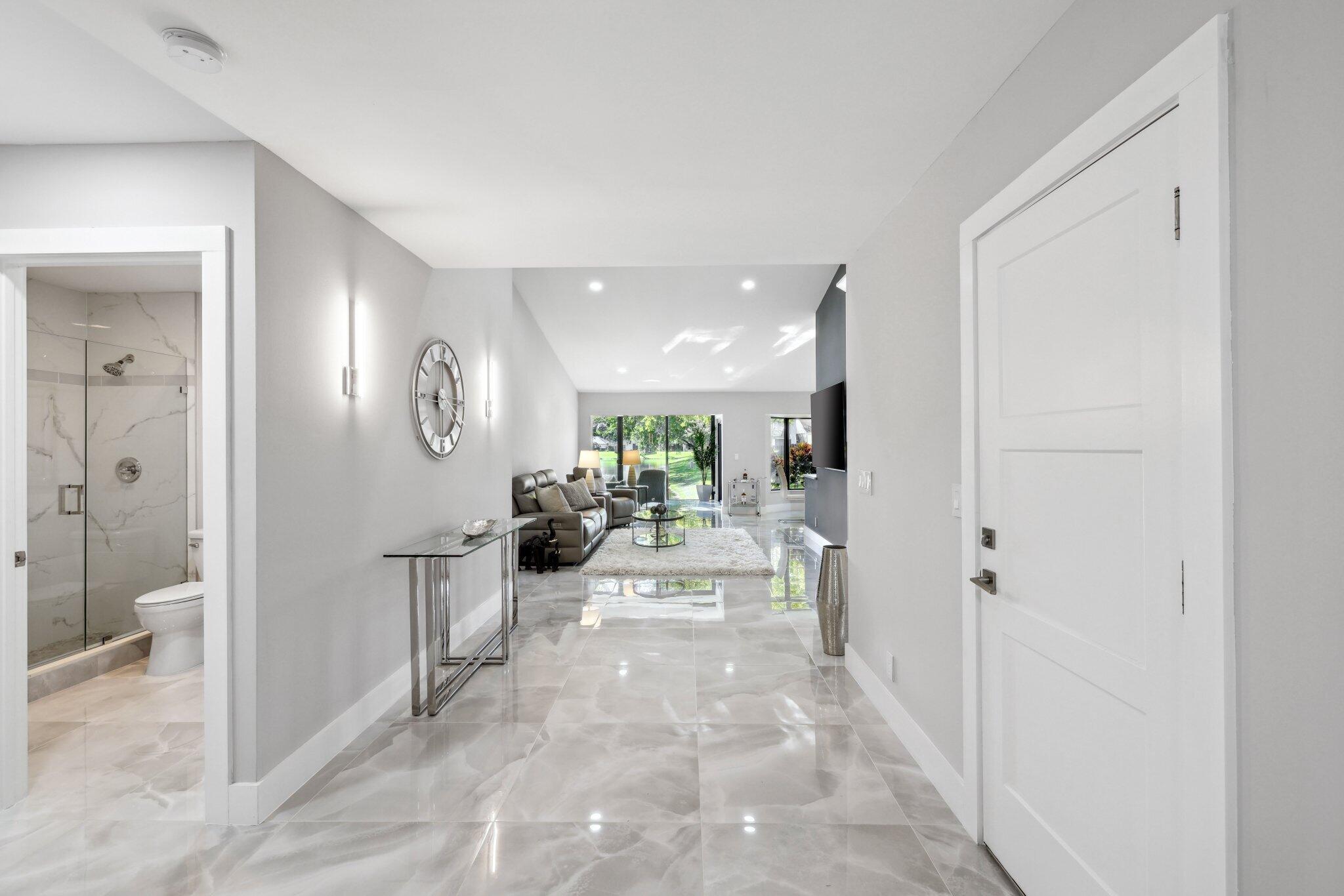 Best value in the area! This immaculately renovated home offers stunning lake views and luxurious finishes in a prestigious gated 55+ community with one of the lowest HOA fees there is. The brand-new renovation features full-impact, panel-less glass throughout, large-format tile flooring, white shaker cabinetry, quartz countertops, and all-new LG appliances. Smooth-finish walls and ceilings, LED high-hat lighting, and a fresh, modern aesthetic make this home completely move-in ready. The spacious split floor plan includes an open living area, oversized primary suite with walk-in closet, and beautifully updated bathrooms with high-end designer finishes. Enjoy serene lakeside living and access to top-tier amenities like a clubhouse, pool, and tennis, with a location close to famous beaches!