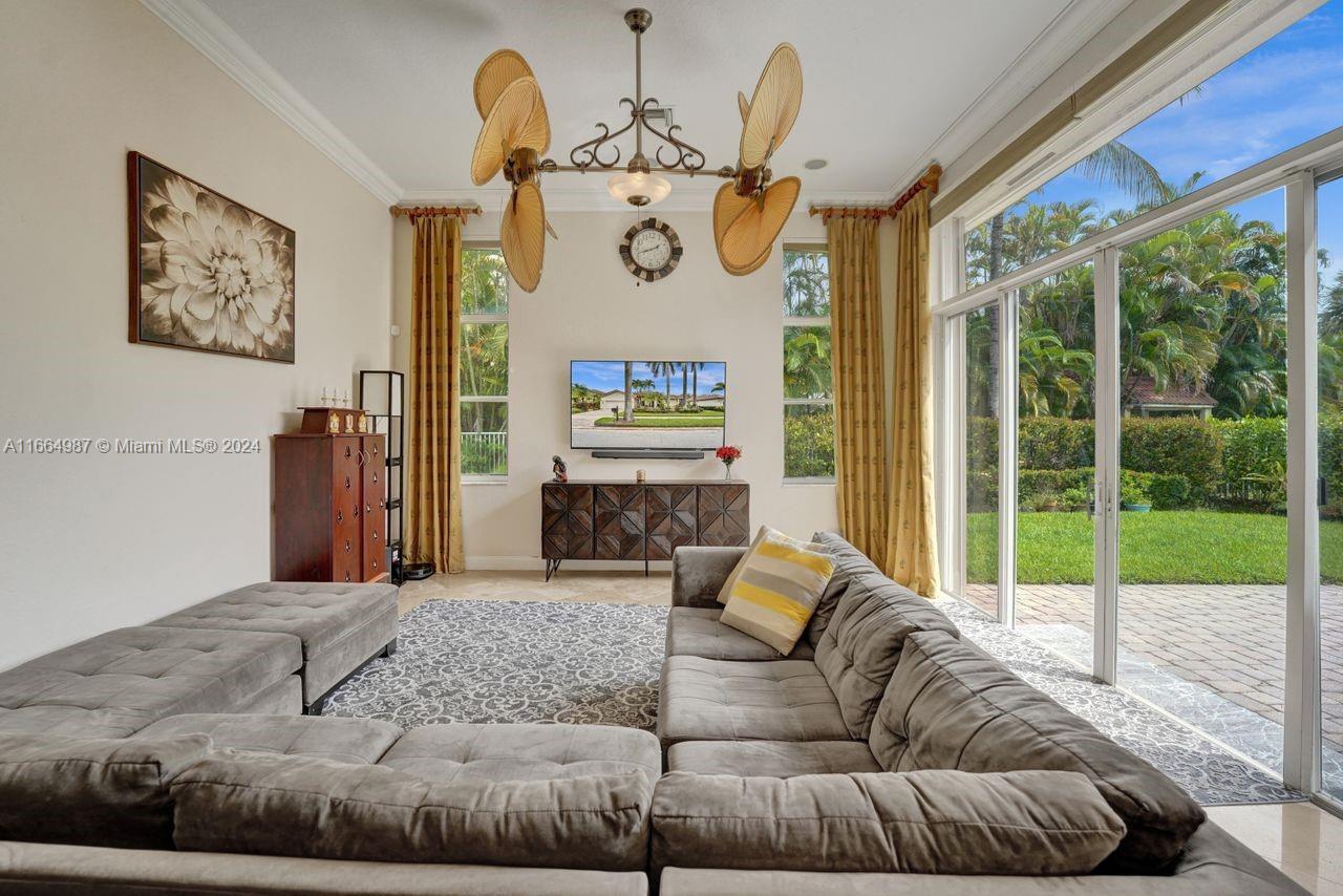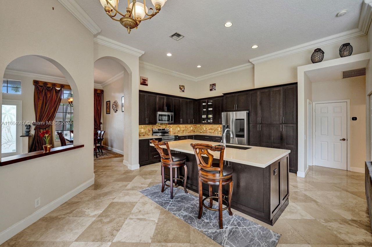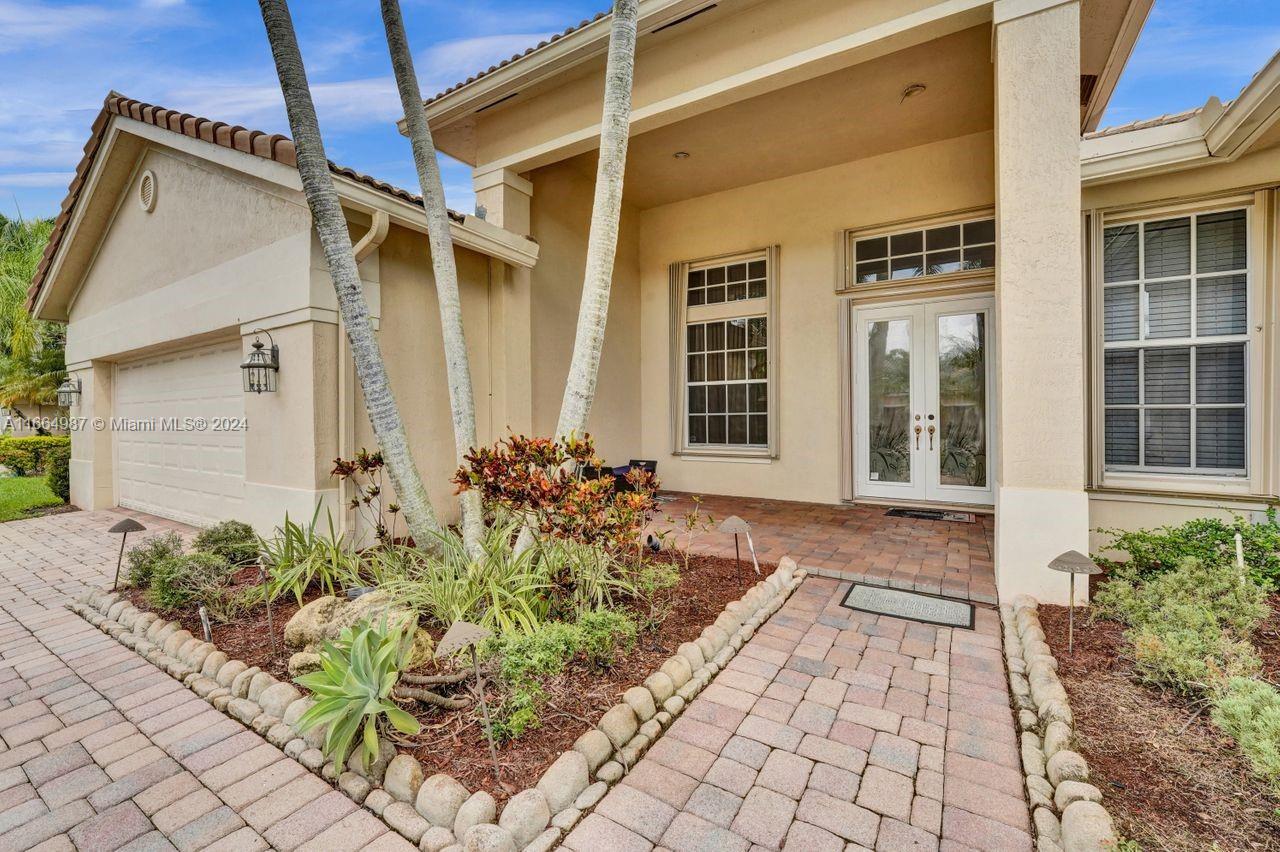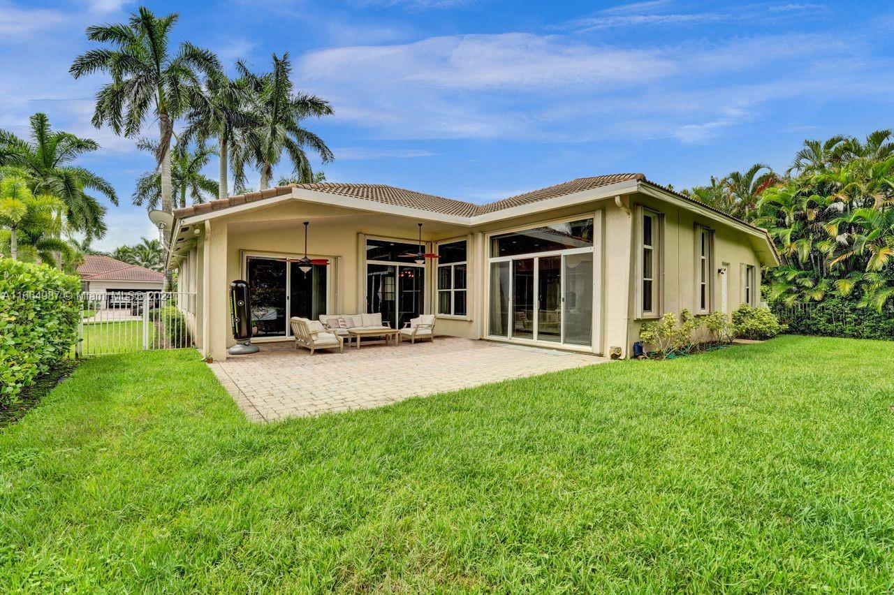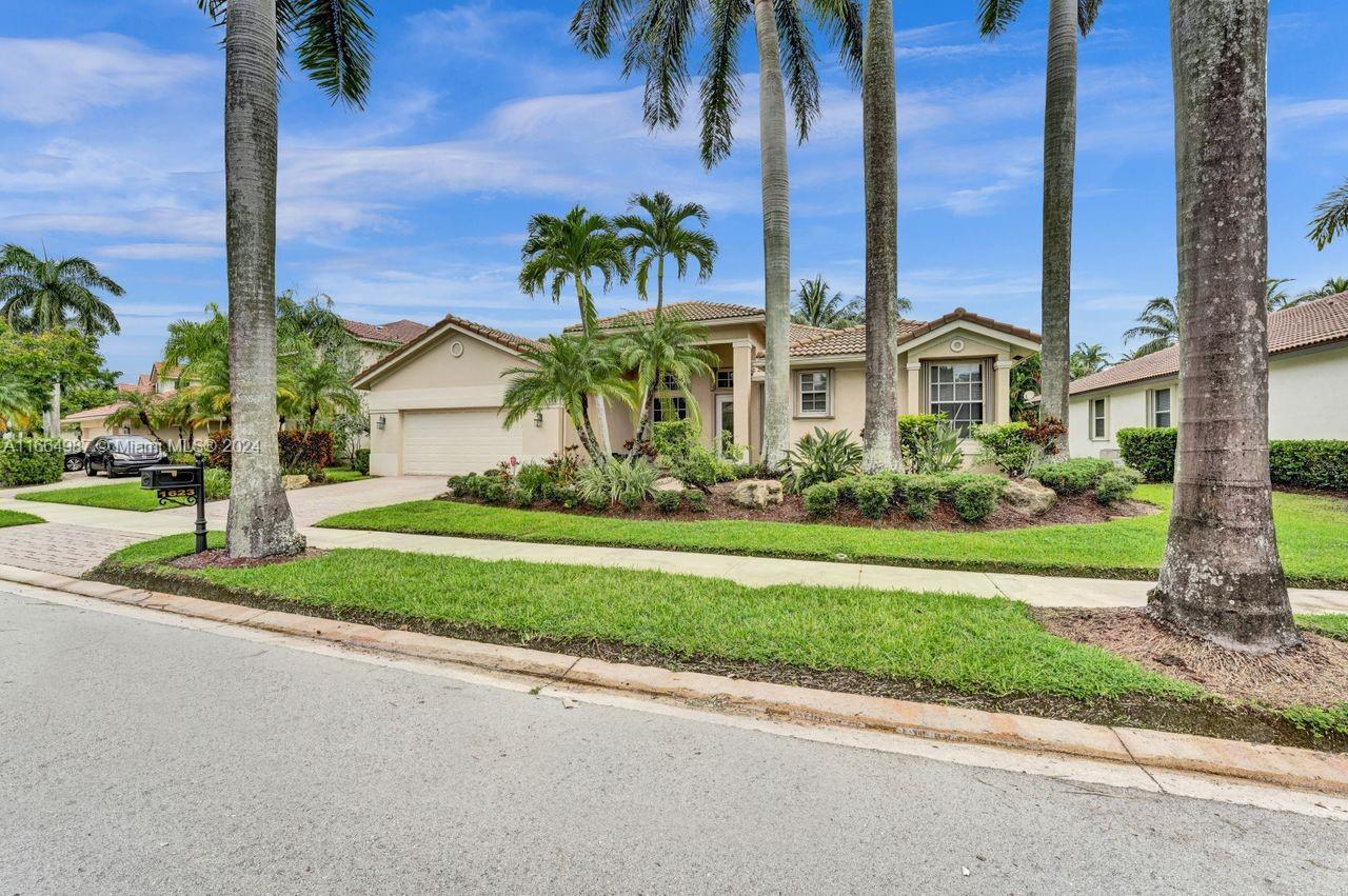 This beautiful house in Weston Hills Country Club features five bedrooms and three bathrooms in a split floor plan. The home boasts a spacious oversized lot with lush landscaping, creating an inviting entryway. The primary bedroom is generously sized with vaulted ceilings and hardwood flooring that accentuates the abundant natural light throughout the interior. The elegant decor and spacious layout provide a welcoming ambiance, with ample countertops and cabinetry in the kitchen, which is equipped with stainless steel and modern appliances, offering ample storage. Elegant architectural details and a covered patio lead to a spacious outdoor living area with a brick-paved patio, lush tropical landscaping, and a nice spacious yard.
