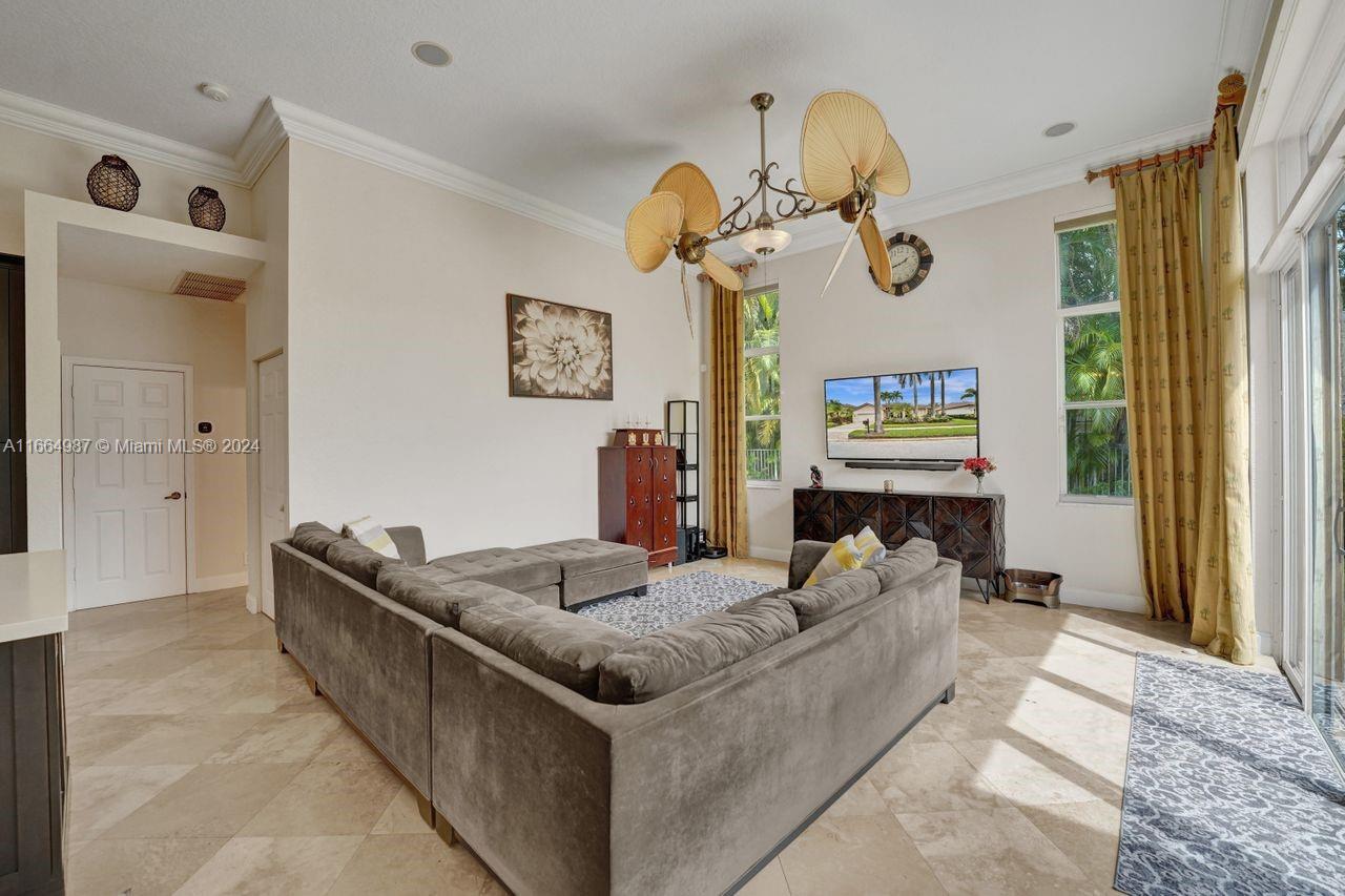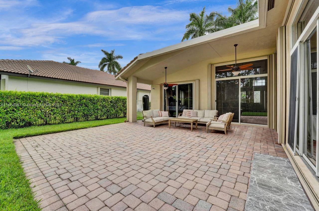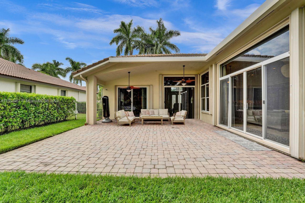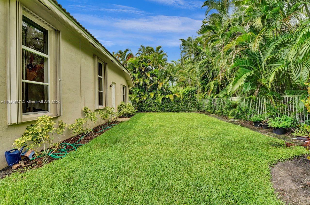 This beautiful house in Weston Hills Country Club features five bedrooms and three bathrooms in a split floor plan. The home boasts a spacious oversized lot with lush landscaping, creating an inviting entryway. The primary bedroom is generously sized with vaulted ceilings and hardwood flooring that accentuates the abundant natural light throughout the interior. The elegant decor and spacious layout provide a welcoming ambiance, with ample countertops and cabinetry in the kitchen, which is equipped with stainless steel and modern appliances, offering ample storage. Elegant architectural details and a covered patio lead to a spacious outdoor living area with a brick-paved patio, lush tropical landscaping, and a nice spacious yard.