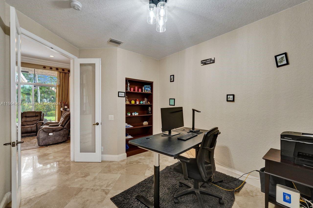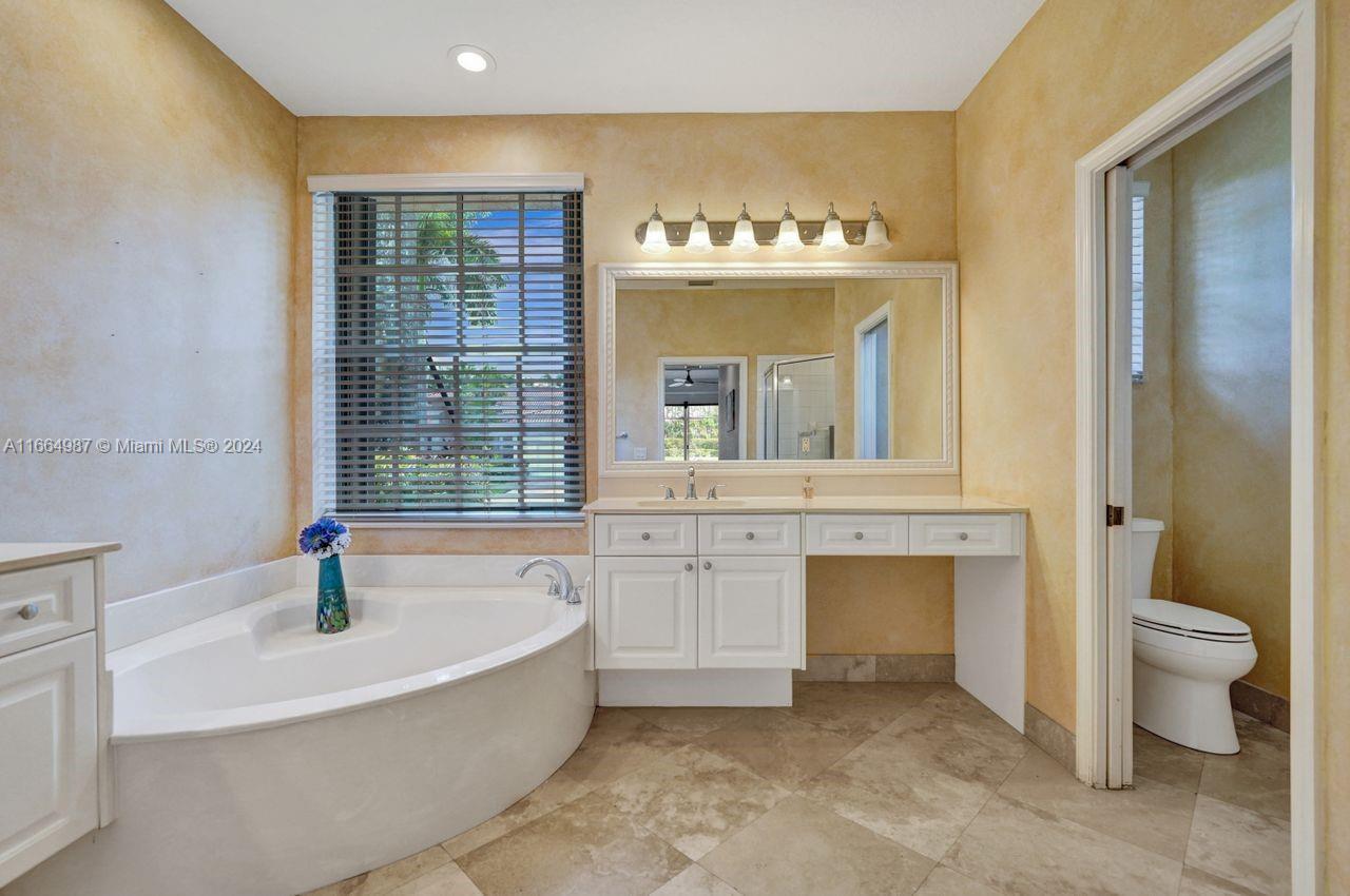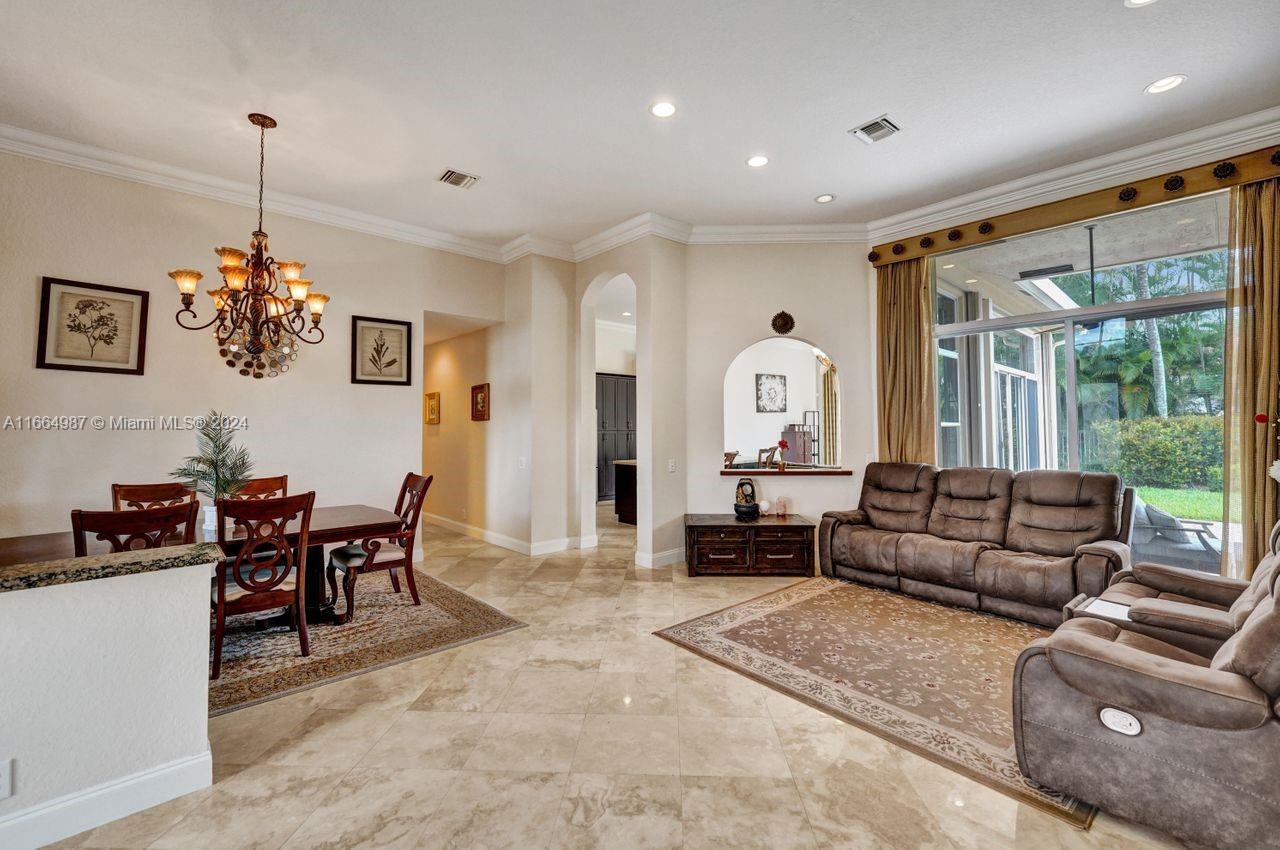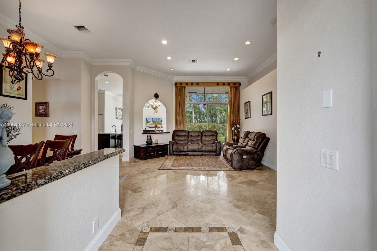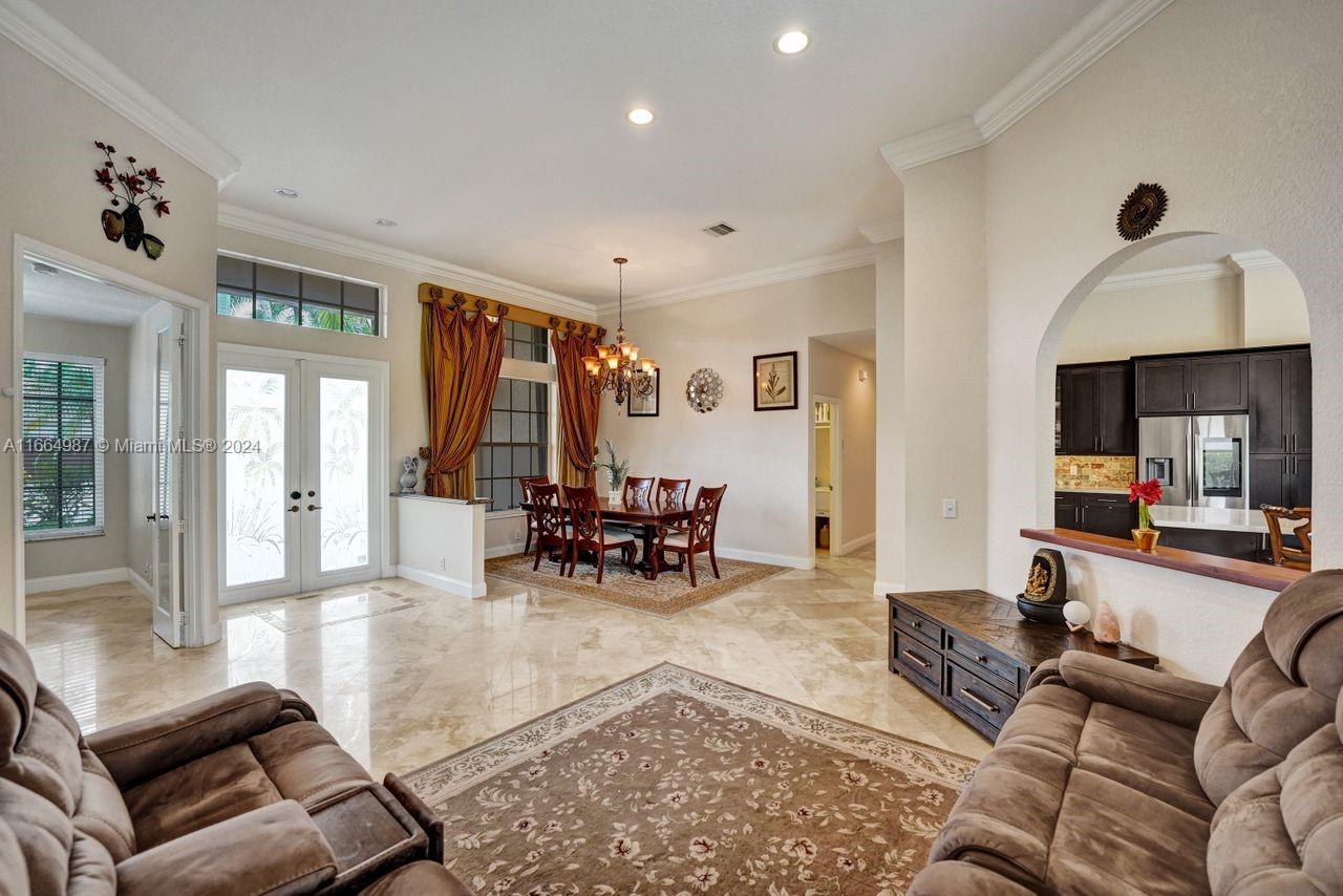 This beautiful house in Weston Hills Country Club features five bedrooms and three bathrooms in a split floor plan. The home boasts a spacious oversized lot with lush landscaping, creating an inviting entryway. The primary bedroom is generously sized with vaulted ceilings and hardwood flooring that accentuates the abundant natural light throughout the interior. The elegant decor and spacious layout provide a welcoming ambiance, with ample countertops and cabinetry in the kitchen, which is equipped with stainless steel and modern appliances, offering ample storage. Elegant architectural details and a covered patio lead to a spacious outdoor living area with a brick-paved patio, lush tropical landscaping, and a nice spacious yard.
