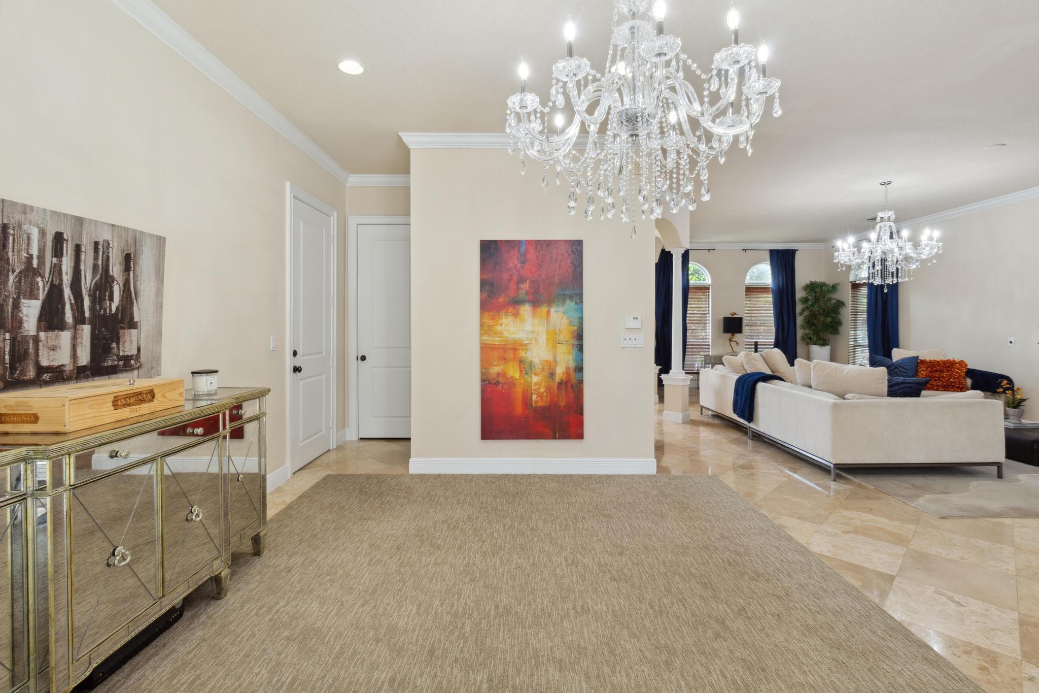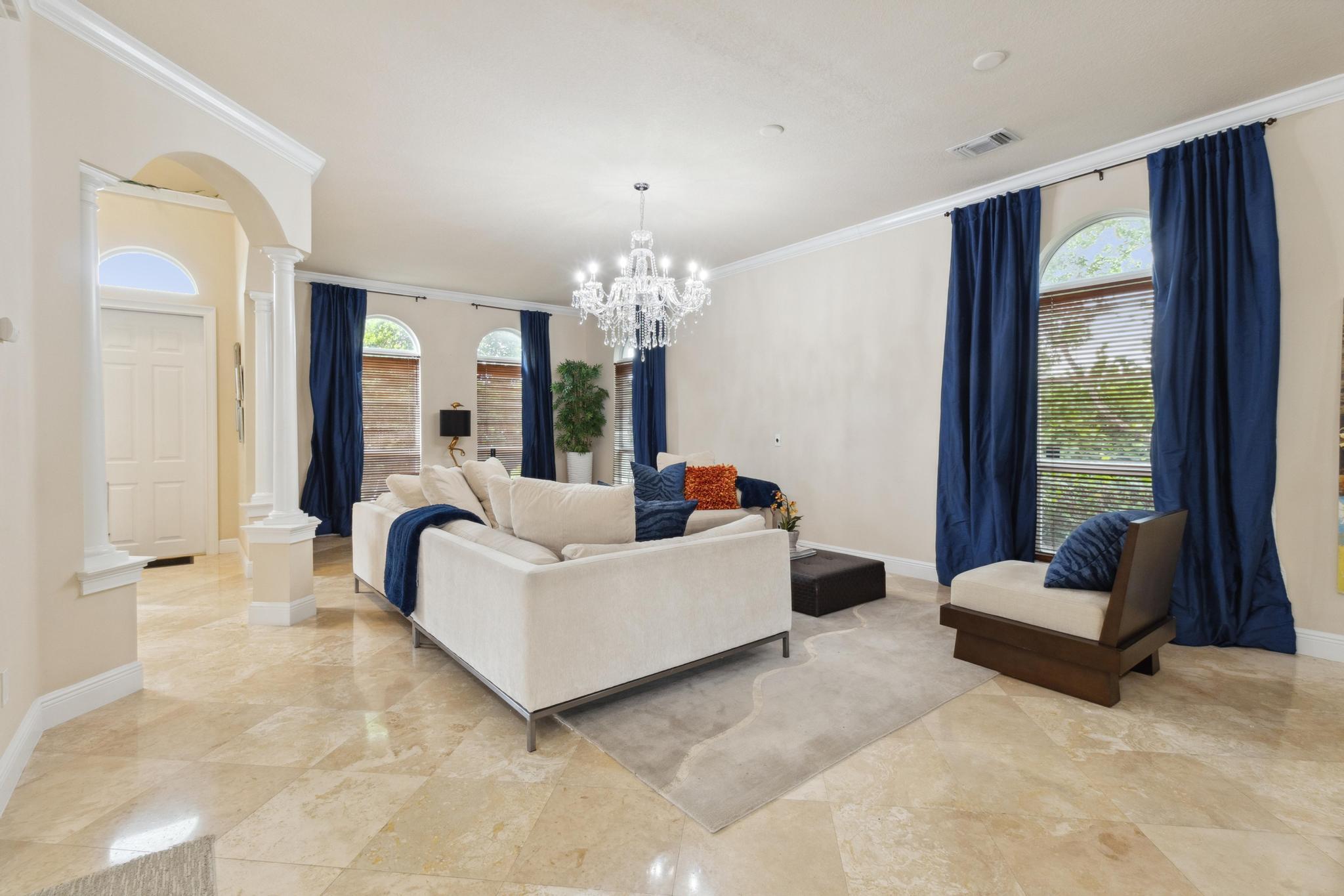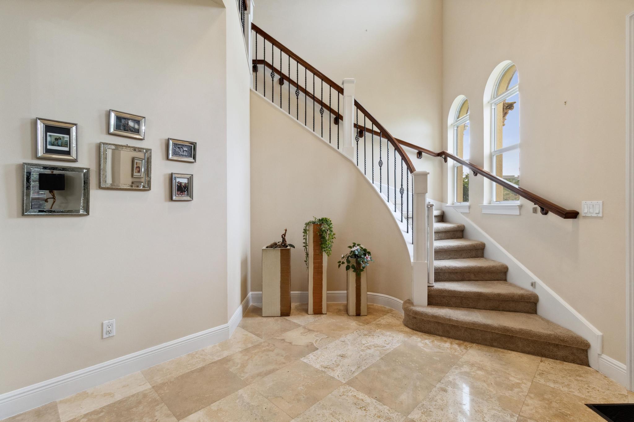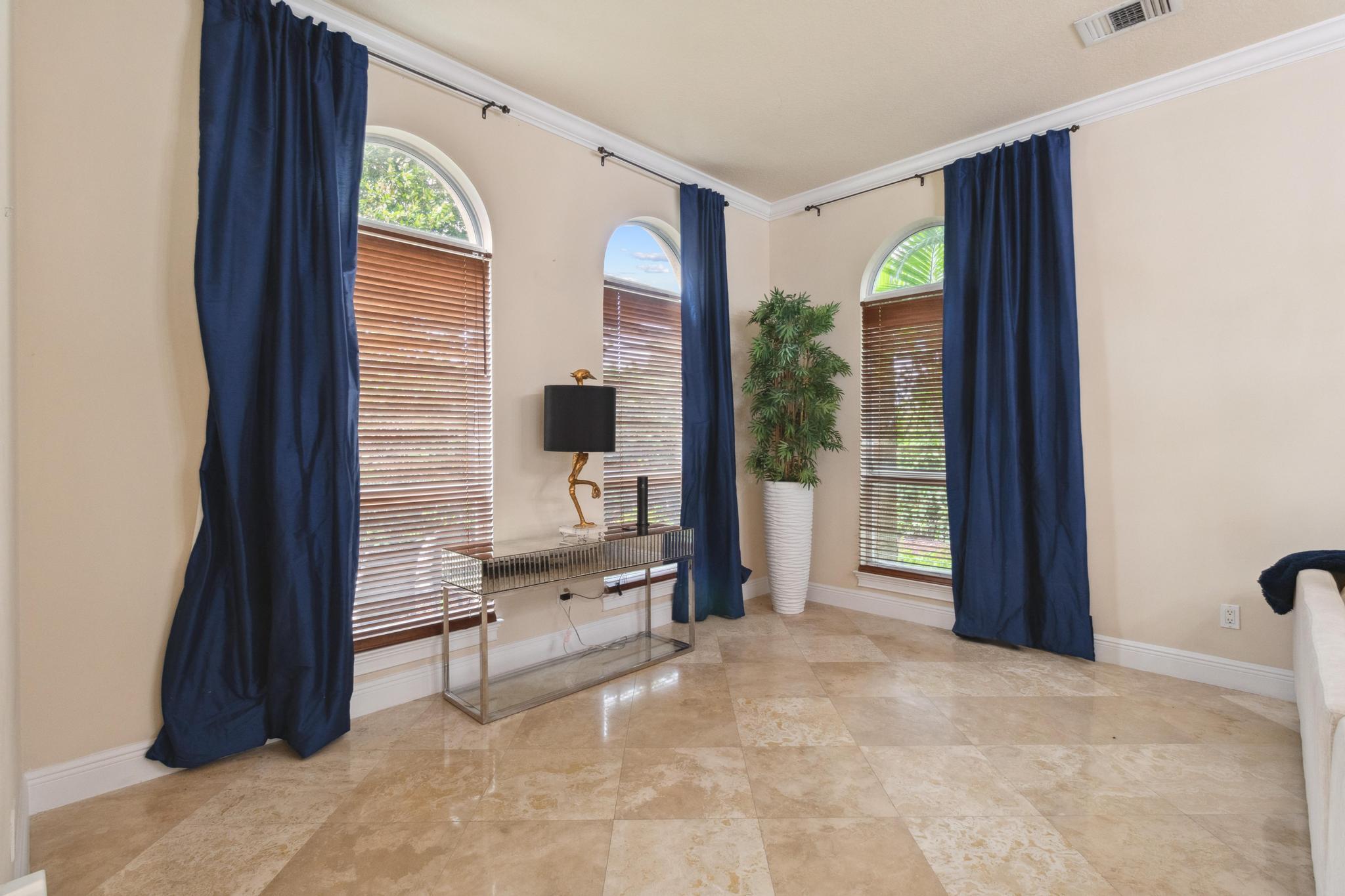 Inspired Spanish Mediterranean townhome in the highly sought-after gated community of Royal Poinciana in East Boca Raton featuring paver walkways/driveways with lush landscaping and resort style pool. Elevate your lifestyle in this 3 bed/2.5 bath townhome featuring dramatic entry with gorgeous staircase and volume ceilings and open concept living with no shared walls--only attached by garages. Travertine flooring throughout, walk in custom closets and large Master suite with French doors to the upper sundeck. Complete with hurricane impact windows and doors, WiFi lighting throughout, chandeliers convey, A Rated Schools. Located close to Atlantic Avenue, Mizner Park, and the beautiful beaches of Delray Beach and Boca Raton, this home offers the perfect balance of convenience and relaxation.
