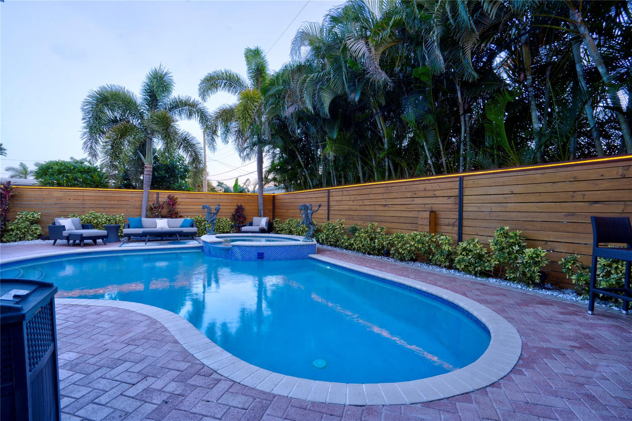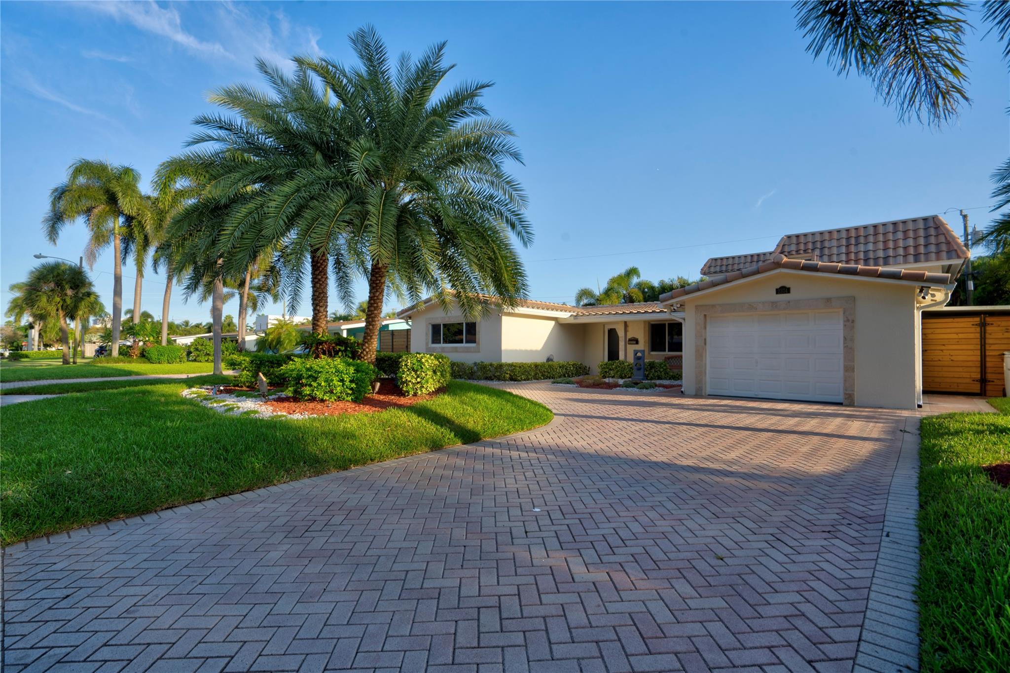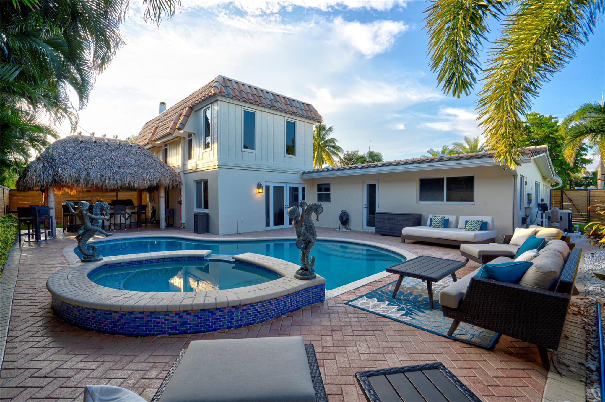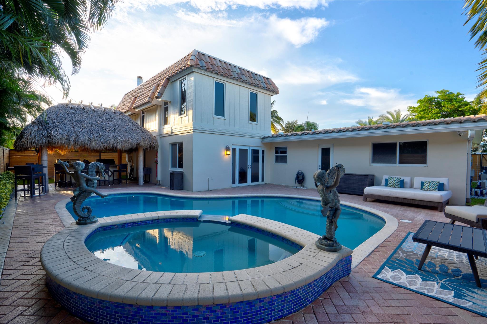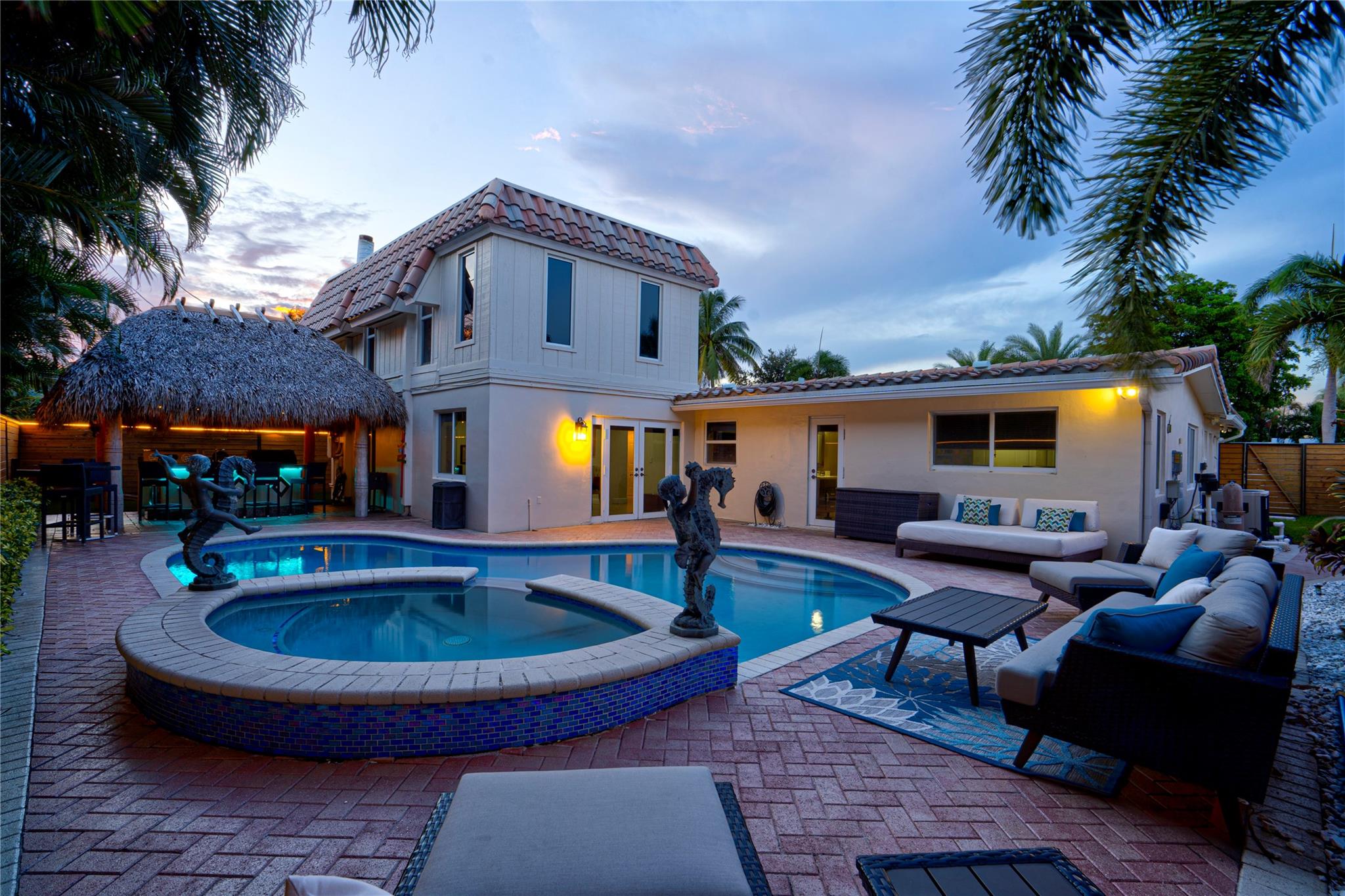 Luxurious, completely renovated, spacious (2,745 sq. ft.), 5/3.5 Single-Family Home in desirable Beachway Estates, Pompano Beach! Walking distance to beach & nearby Pompano Beach Amphitheater. Amenities: high-tech smart, heated pool spa w/ large patio, Tike Hut w/ wet bar for BBQ. High Impact Windows, Doors & Locks throughout entire home. Recessed Lighting, blackout blinds through all bedrooms. Second story master retreat w/ remodeled bath & shower, designed for privacy and sense of retreat; huge breakfast bar w/ granite countertops & stainless-steel appliances; formal dining area; fireplace; 25 kW Generator; tankless water heater on natural gas. New Smart Washer/Dryer, Nest Internet AC, 3-Split AC units. Roof 2-years old. Golf cart garage w/ laundry facilities and plenty of storage.