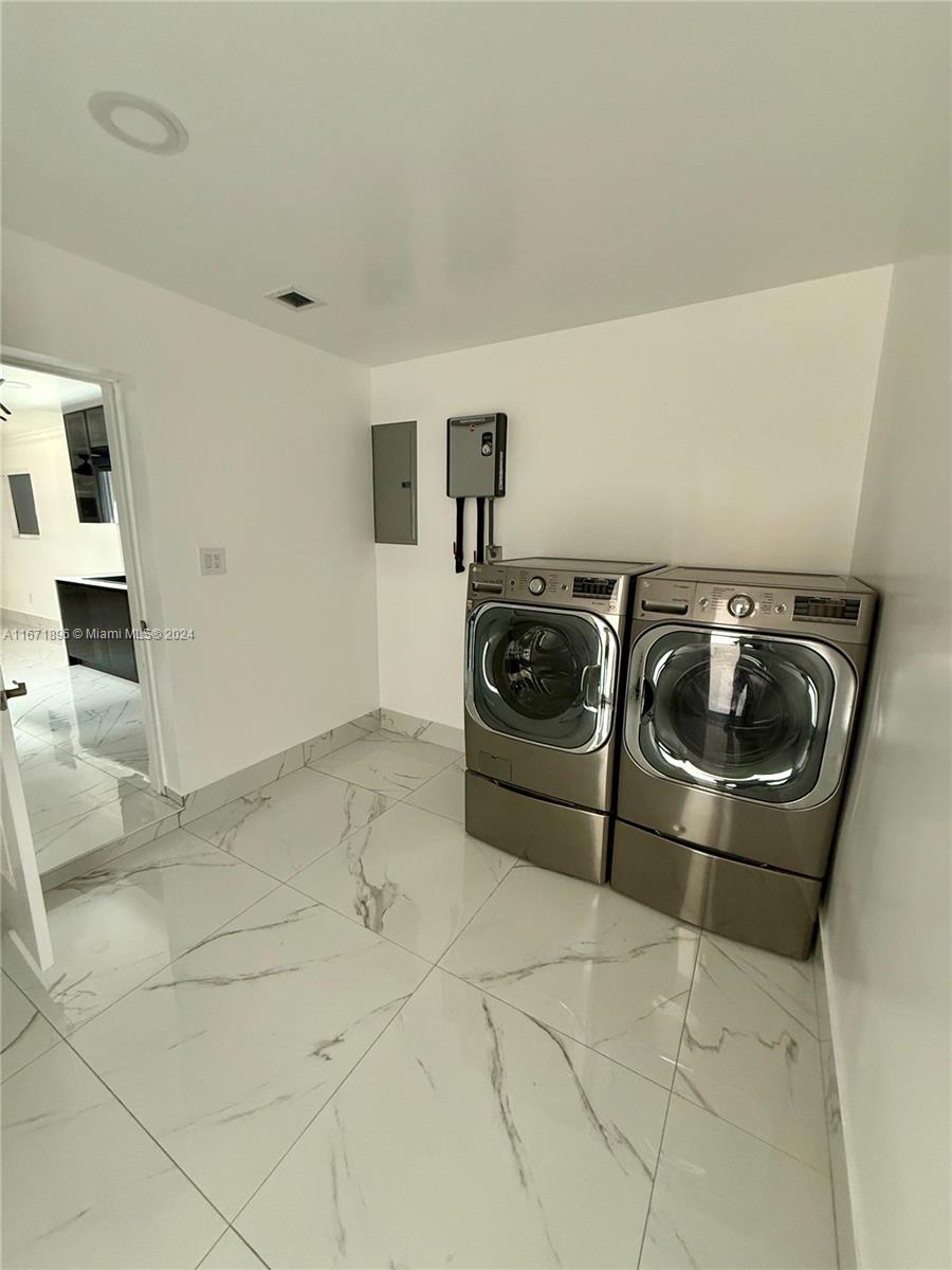 Welcome to 6750 Cleveland St – a beautifully renovated 4-bed, 2-bath home showcasing modern luxury and thoughtful upgrades. This home features impact-resistant doors and windows, elegant porcelain flooring, and a sleek new kitchen with brand-new appliances, including a washer and dryer. Outdoors, enjoy a private fenced yard with a pergola on a concrete deck and a spacious shed, equipped with a 3-ton mini-split AC system installed in 2023, ideal for storage or a workshop. The electrical system has been fully upgraded with a 250-amp exterior panel and a 200-amp interior sub-panel. The home also boasts a brand-new AC system, ductwork, insulation, new electrical system and more, making it truly move-in ready. Perfect for families or investors seeking a modern home with no detail overlooked!