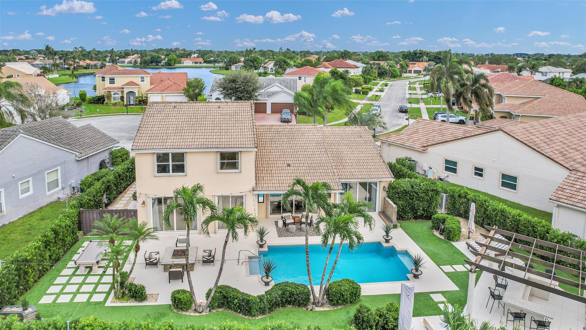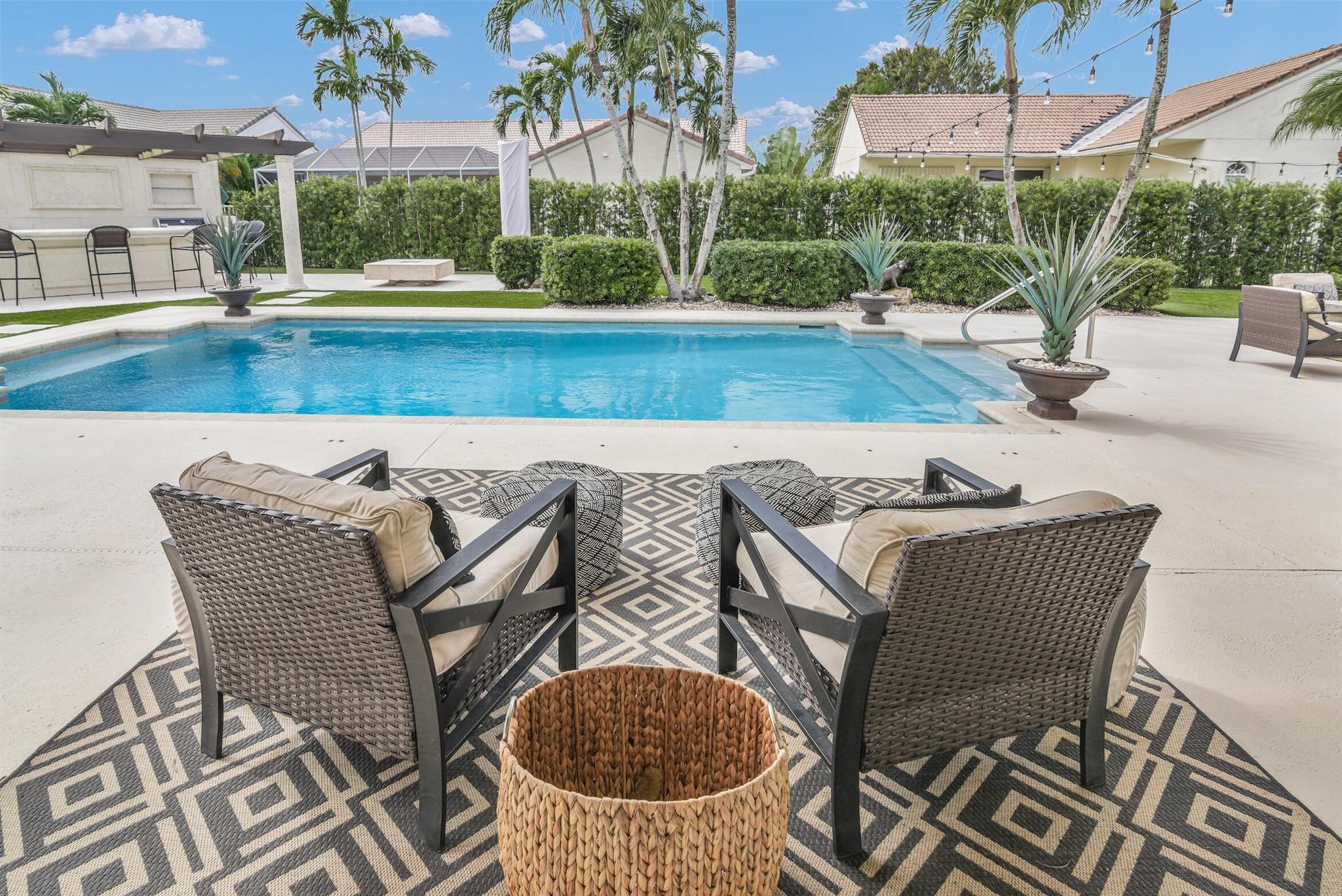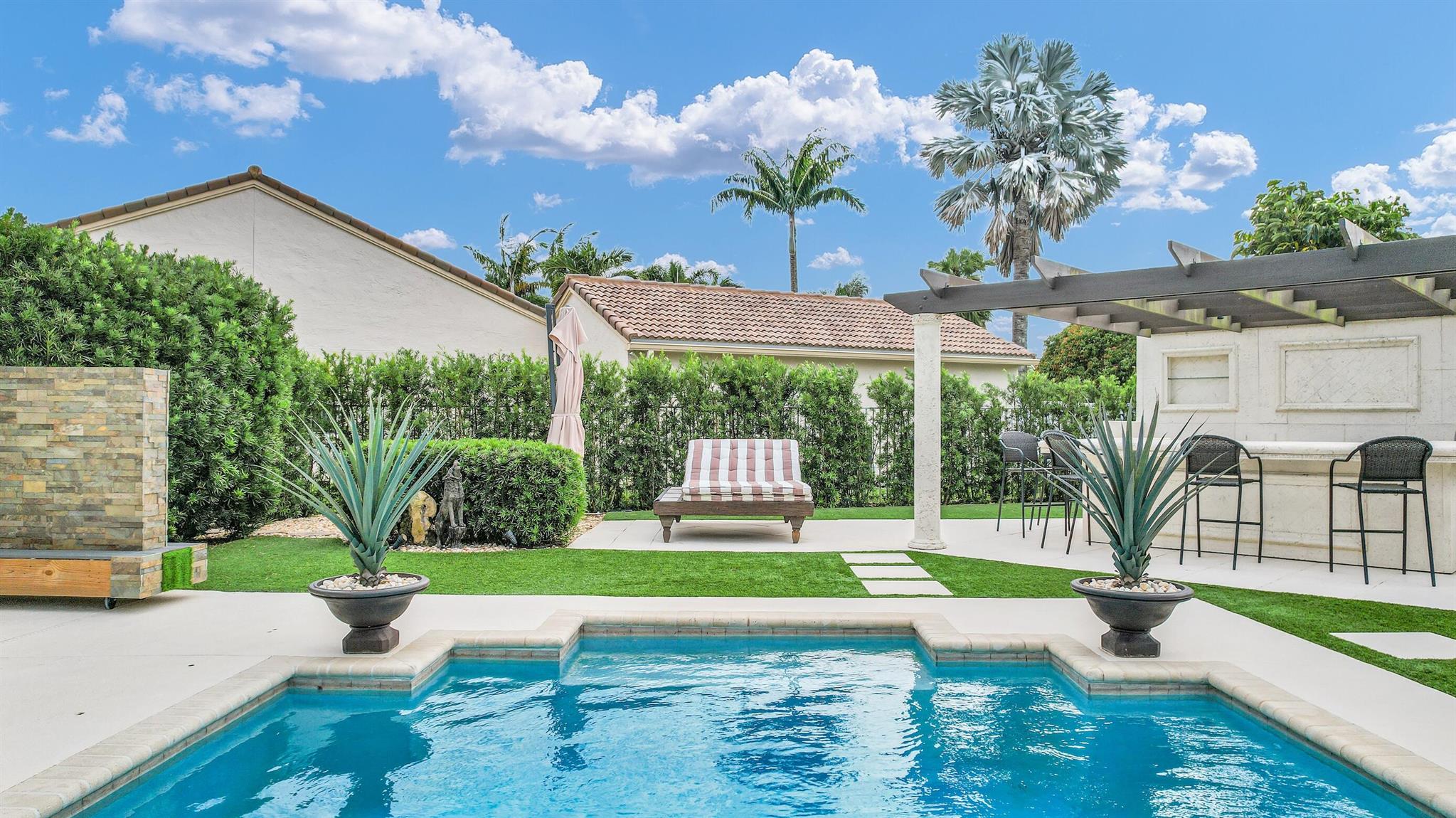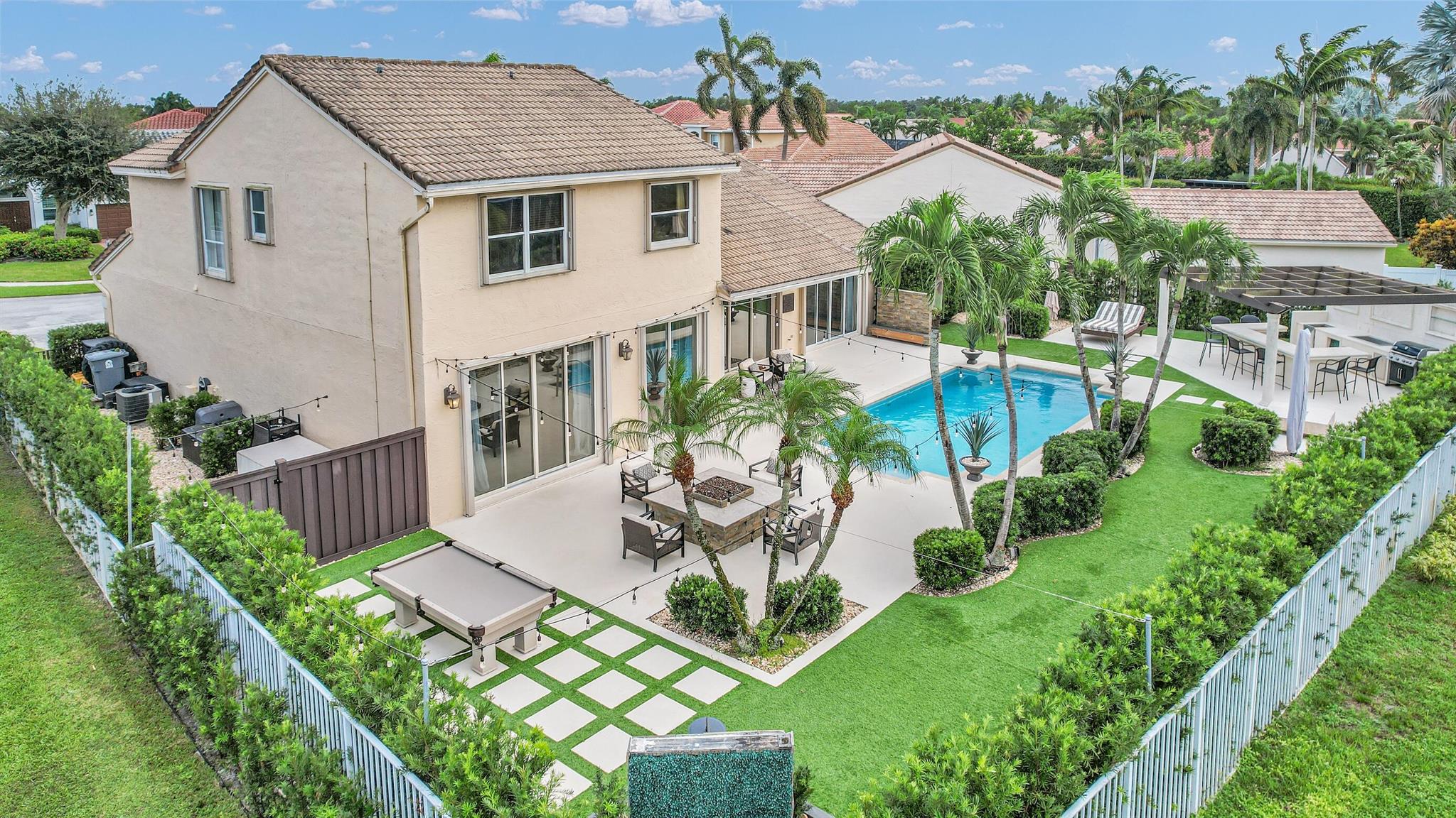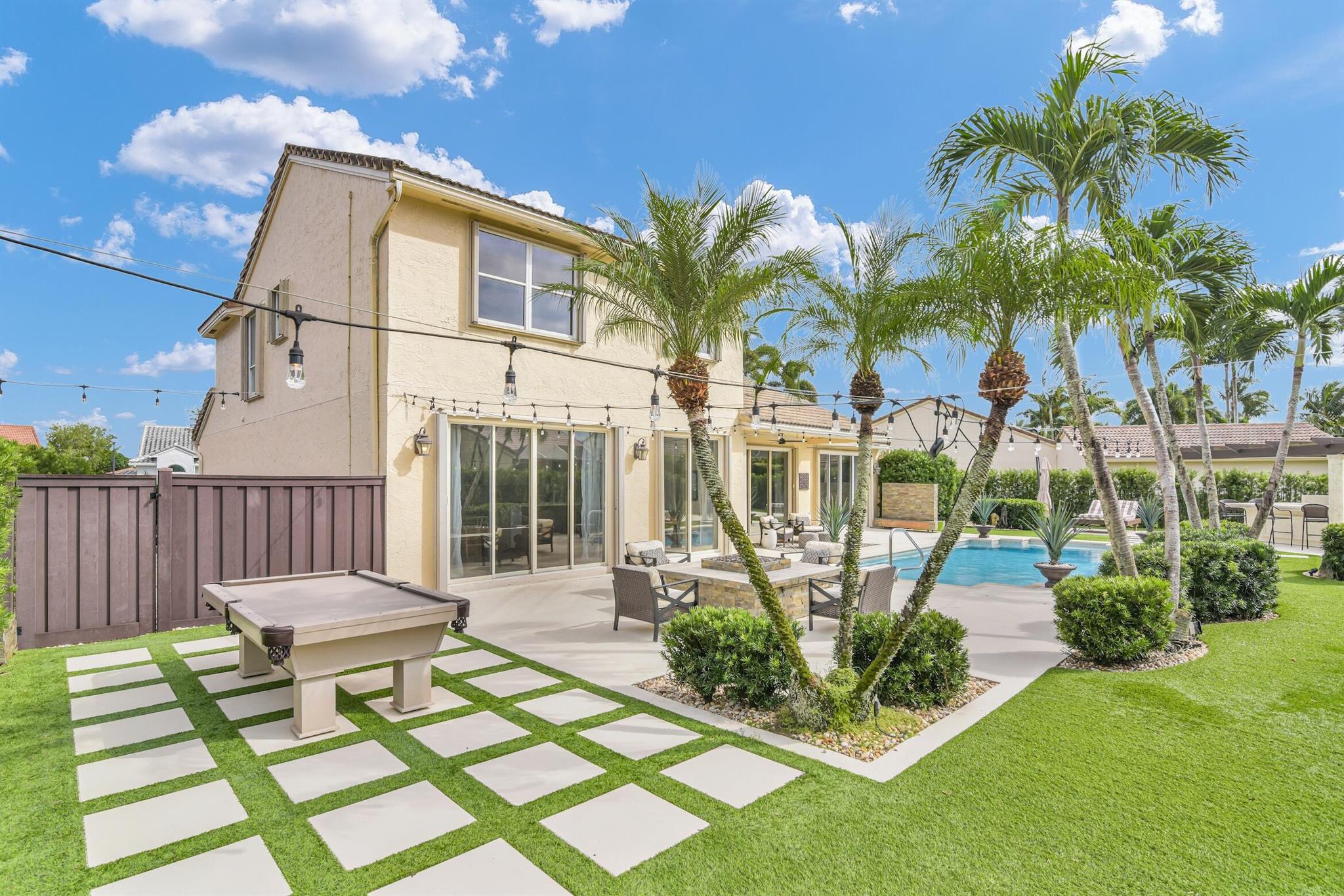 Magazine worthy 5 bed 2.5 bath spectacular home located in a Cul-de-Sac. Quiet and peaceful with no thru traffic! This home exudes elegance and decorator ambience in and out! Neutral light and bright. Large porcelain tiles wall to wall on main area with wood look on stairs and 2nd level - No Carpets here! Recently remodeled and expanded kitchen with tons of storage, pull outs, large Island, leather look Taj Mahal granite counters and marble backsplash. All 3 bathrooms have been beautifully remodeled. Fully fenced Resort style yard with artificial turf, a beautiful pool, outdoor shower (hot & cold H2O) Pergola bar/cook area, this is an entertainment paradise.! Accordion shutters, AC units are 2023 & 2018, Roof 2011. pool re-marcite apprx. 5 years Low HOA fees include Cable & Wi-F...