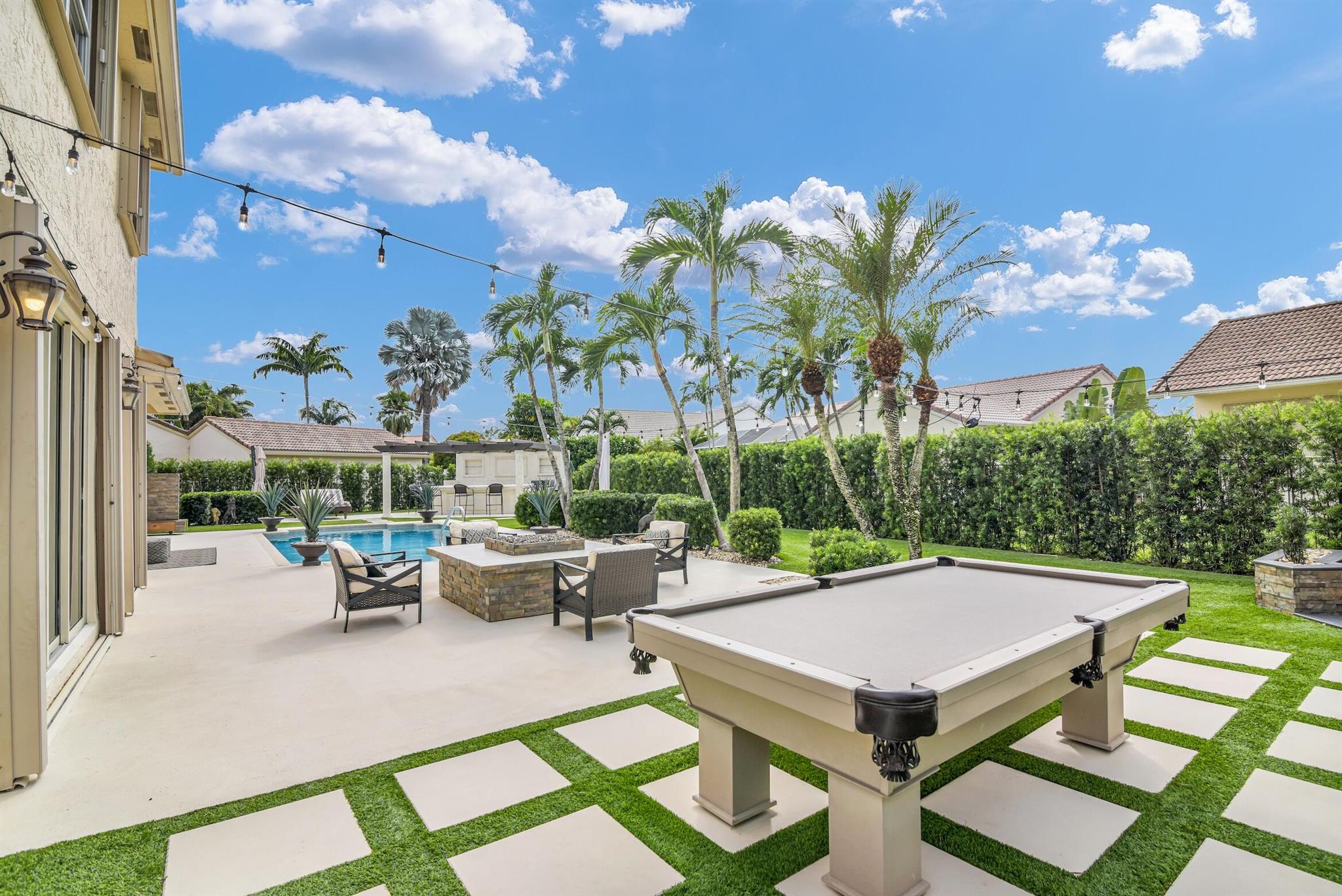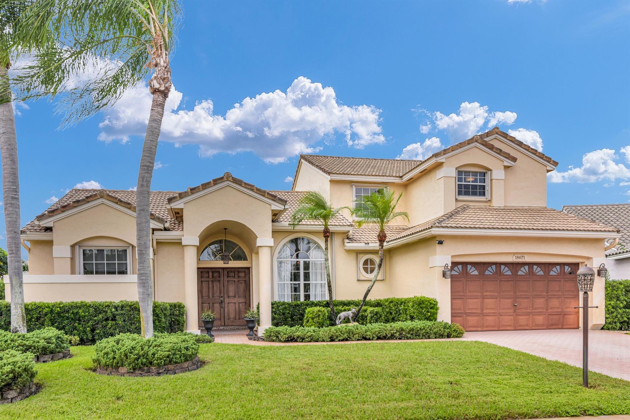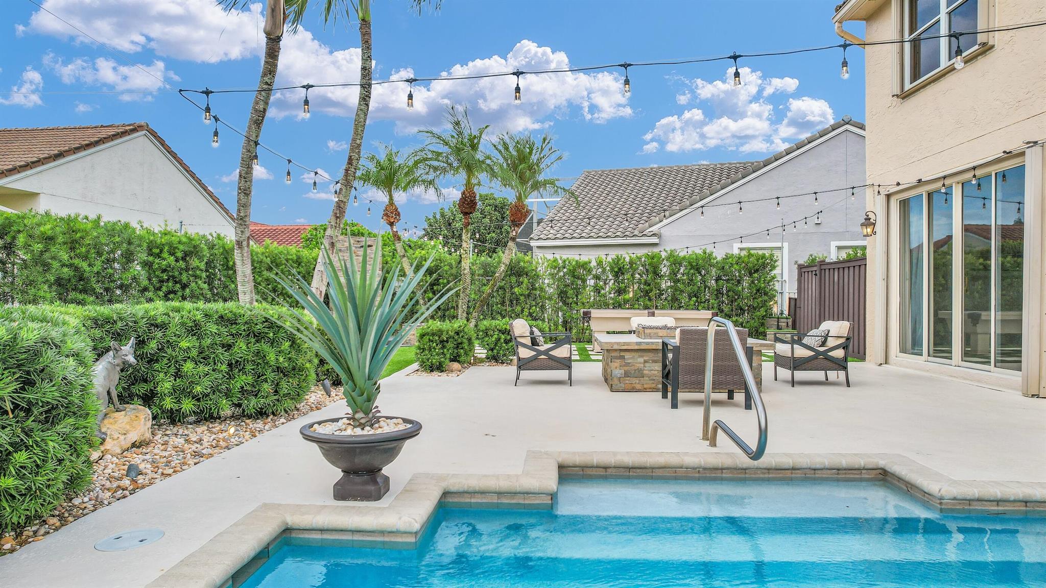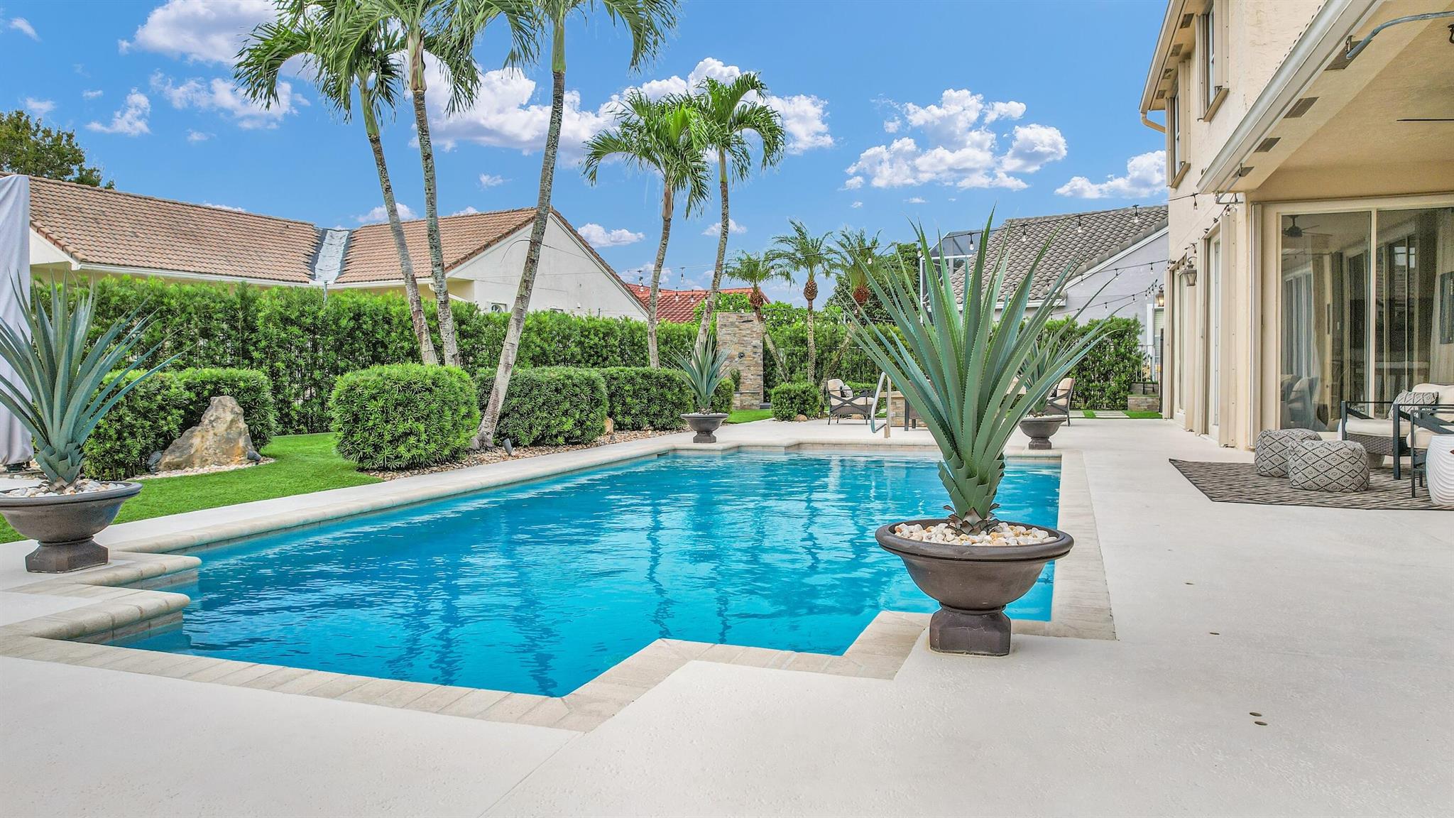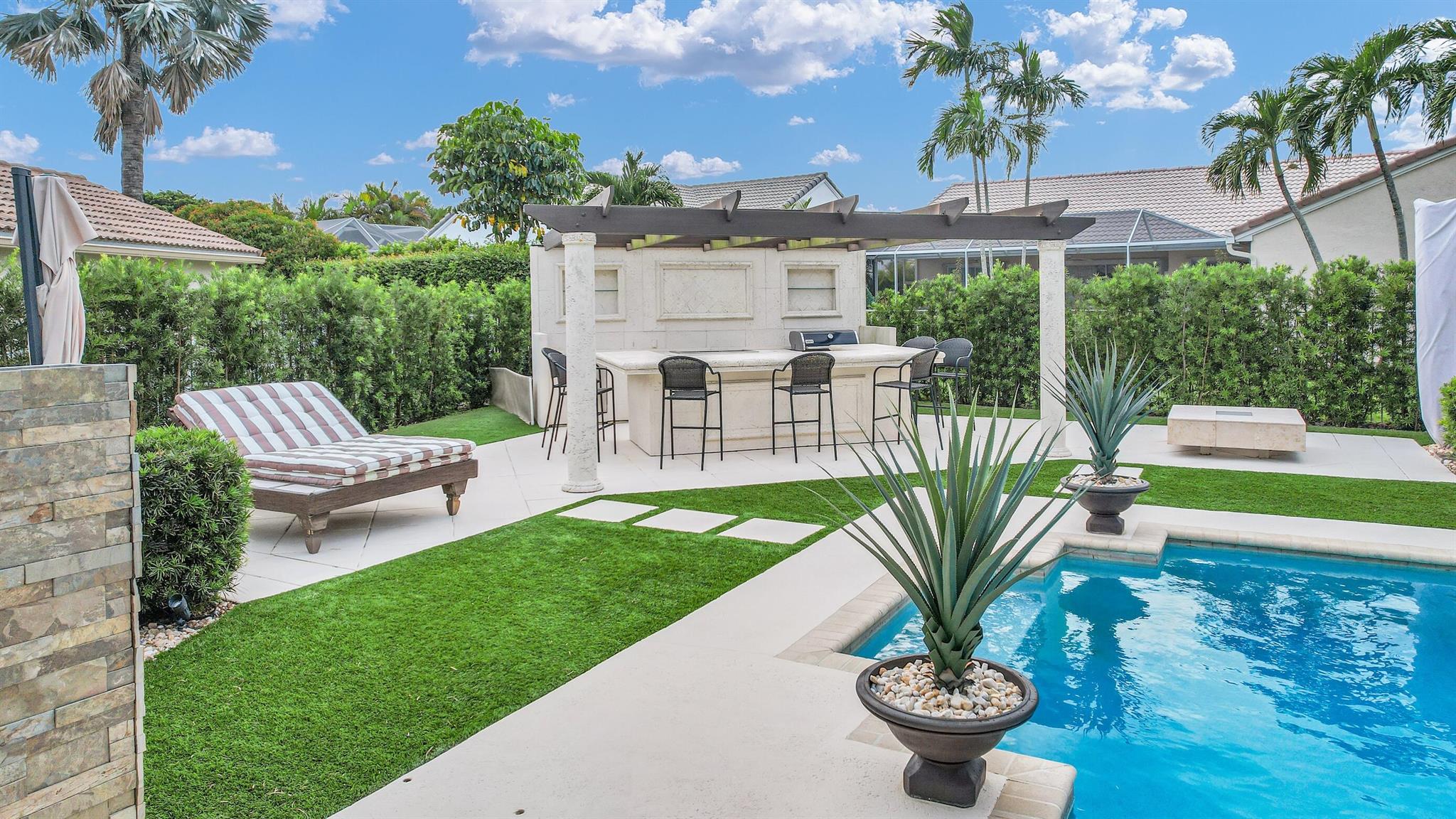 Magazine worthy 5 bed 2.5 bath spectacular home located in a Cul-de-Sac. Quiet and peaceful with no thru traffic! This home exudes elegance and decorator ambience in and out! Neutral light and bright. Large porcelain tiles wall to wall on main area with wood look on stairs and 2nd level - No Carpets here! Recently remodeled and expanded kitchen with tons of storage, pull outs, large Island, leather look Taj Mahal granite counters and marble backsplash. All 3 bathrooms have been beautifully remodeled. Fully fenced Resort style yard with artificial turf, a beautiful pool, outdoor shower (hot & cold H2O) Pergola bar/cook area, this is an entertainment paradise.! Accordion shutters, AC units are 2023 & 2018, Roof 2011. pool re-marcite apprx. 5 years Low HOA fees include Cable & Wi-F...