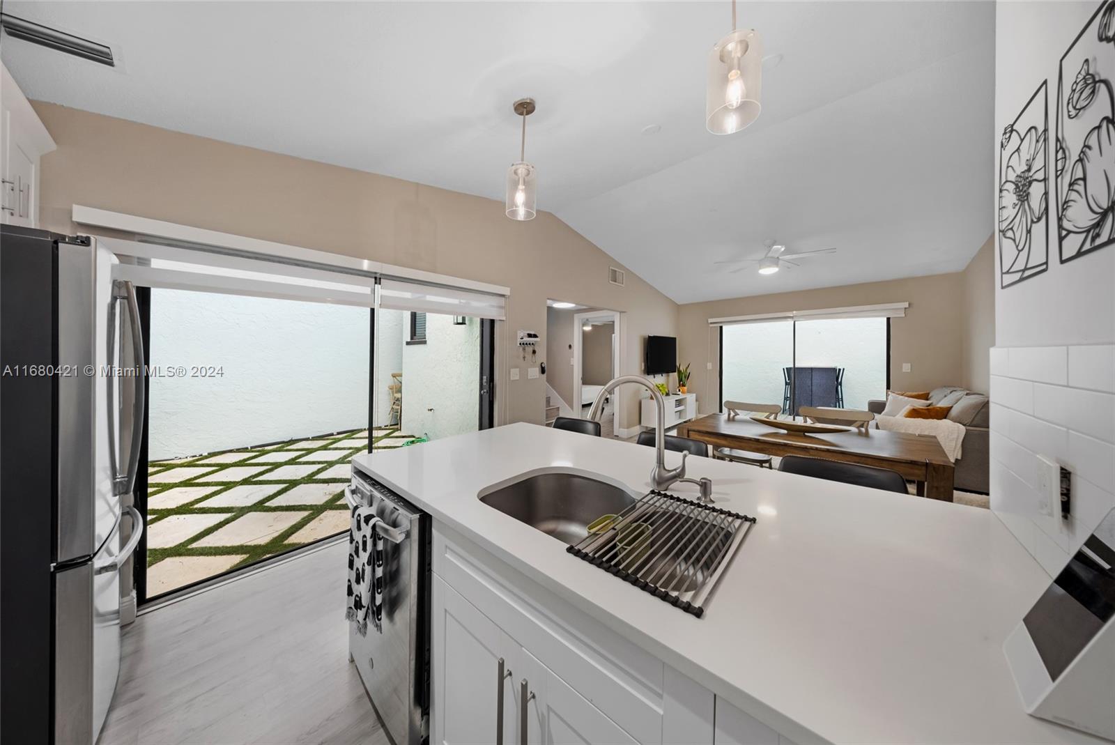Enjoy an open-concept layout that maximizes space and natural light. The heart of the home features stainless steel appliances new washer and dryer and countertops, ample cabinetry making it a chef's delight. A generously sized master bedroom with an ensuite bathroom, complete with a walk-in closet, provides a peaceful retreat. Step outside to your private front-yard made with travertine stones, ideal for summer barbecues or cozy evenings under the stars. Fleshly painted Community with new roof. Assigned and guest parking. This address qualifies you to the top rated 10/10 Del Prado Elementary School. Only a 5 minutes walk to Gardens Shop where Publix, Skillets, Kosher Market and variety of medical offices and restaurants are located, with easy access to major highways. Easy to show.