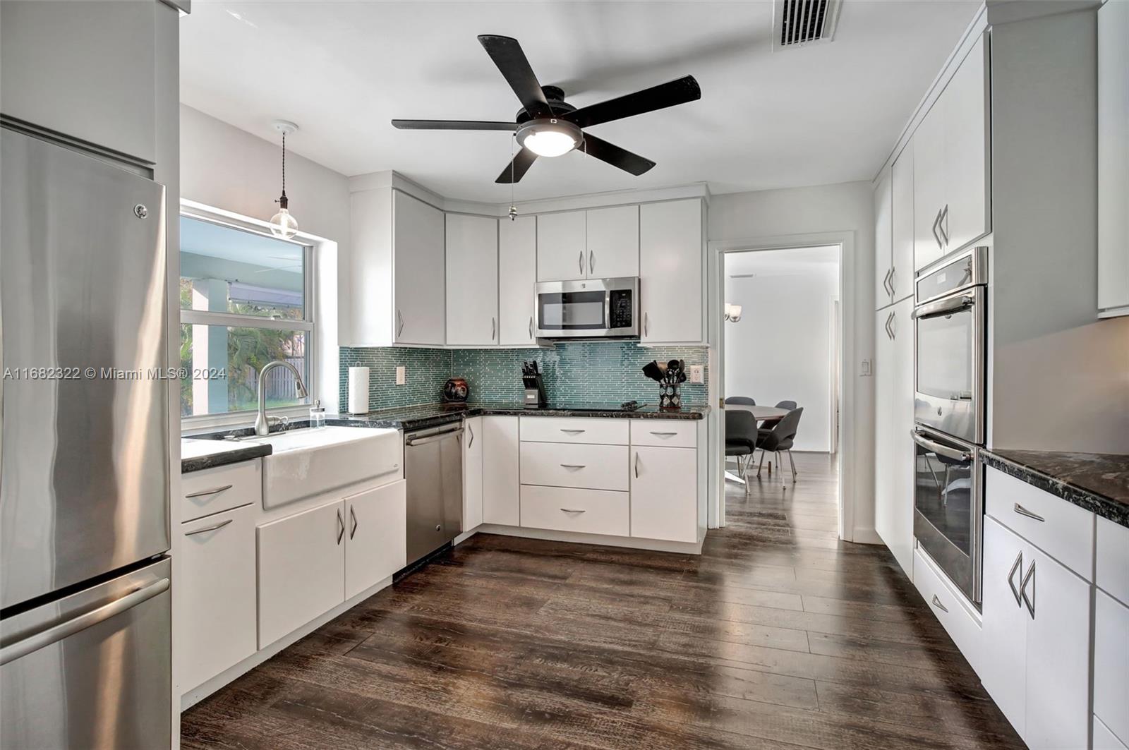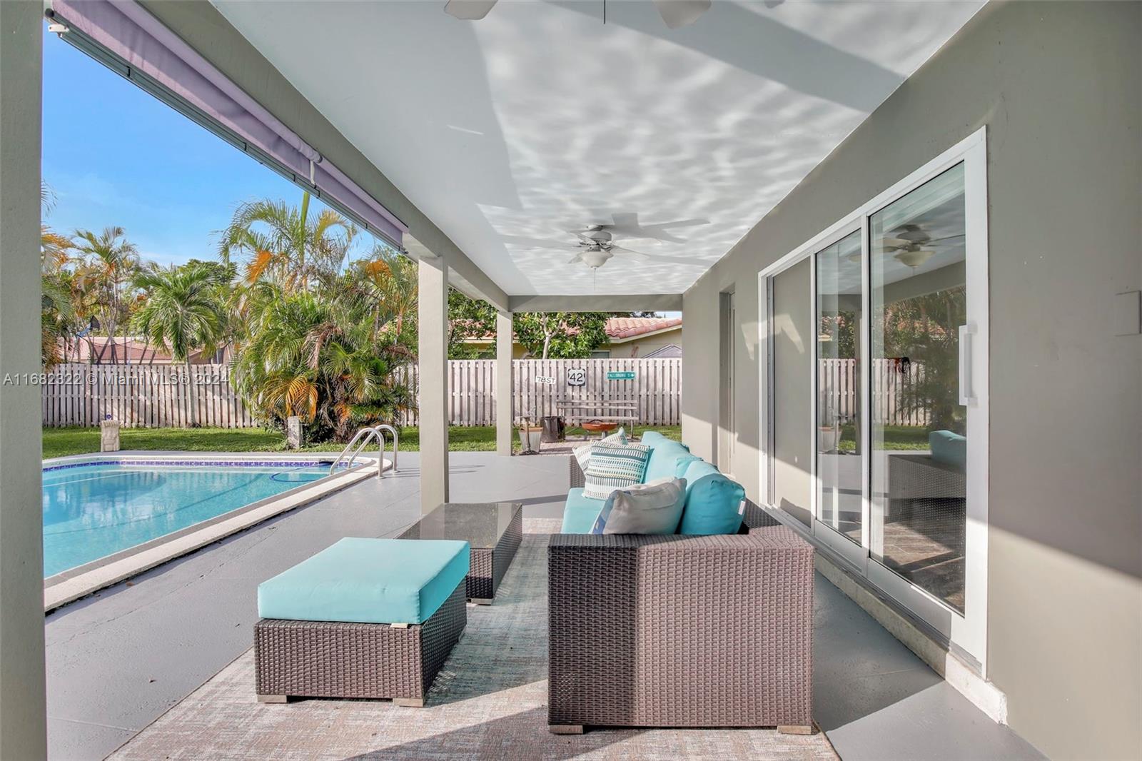 Move right into this spacious split floor plan on a quiet street with a well-manicured large private interior fenced lot. This carpet-free home is freshly painted & offers smooth flat ceilings, modern reveal baseboards,impact glass doors & windows, an updated kitchen with solid wood white cabinetry, granite counters, stainless appliances, double ovens, great storage, a pantry & nice pass-through window to a large covered patio making it great for entertaining... complete with wet bar. Enjoy Updated baths, & a cabana bath which is complete with a jetted soaking tub, PVC pipes throughout, an indoor laundry room, a great oversized private yard, & a full-size open pool. This location offers Easy access to 595, Broward Mall, Midtown Shops, The Fountains, Plantation Walk and so much more.