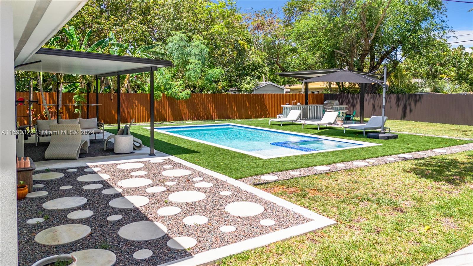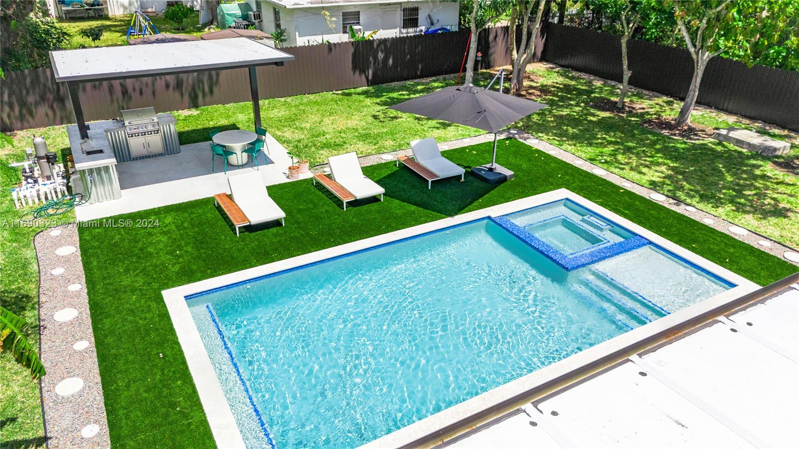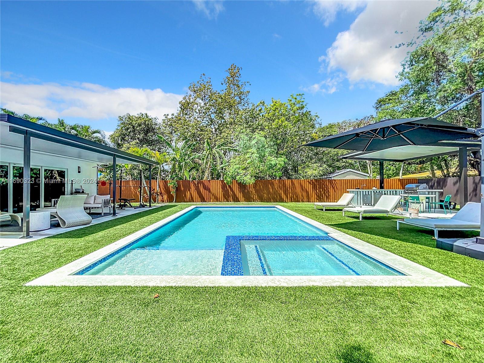Nestled in a desirable North Miami neighborhood, this beautiful 4-bedroom newly rebuilt in year 2022 & renovated house, boasts an impressive array of features, upgrades and amenities. As you enter, you are greeted by an open floor plan that lends an airy and spacious feel to the living space. No expenses spared!One-of-a-kind kitchen with custom cabinets, Samsung appliances and quartz countertops. The home is equipped with recessed lighting, window treatments, smart home tech, built-in closets and large tile floors.The exterior is equally impressive with an oversized salt-water swimming pool, well-manicured landscape, built-in barbecue area and outdoor gym. Large concrete driveways with enough space to park several cars. Centrally located, minutes from Bal Harbor shops, Mimo and Whole Foods