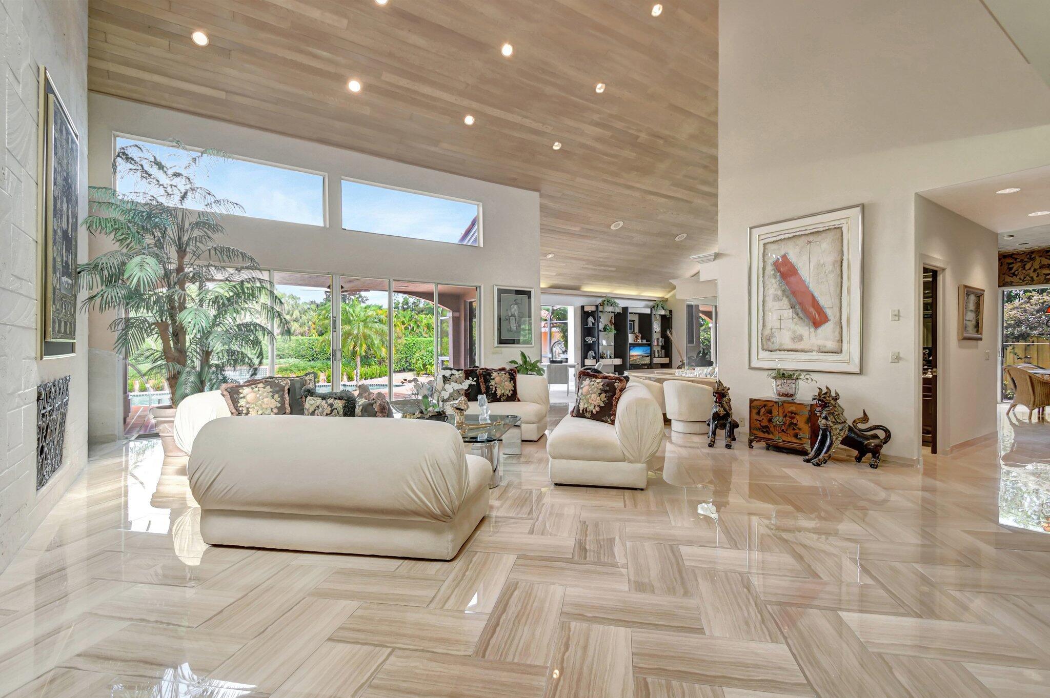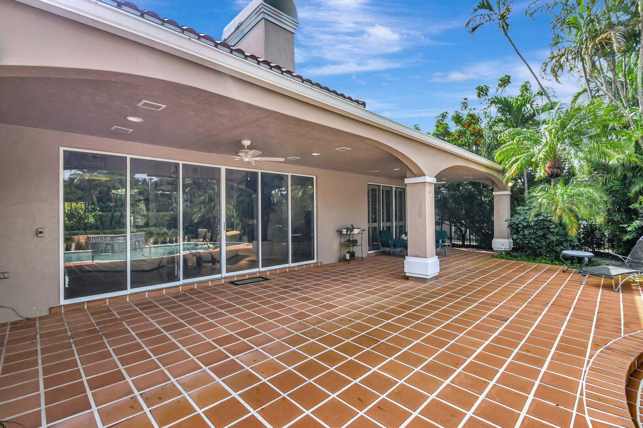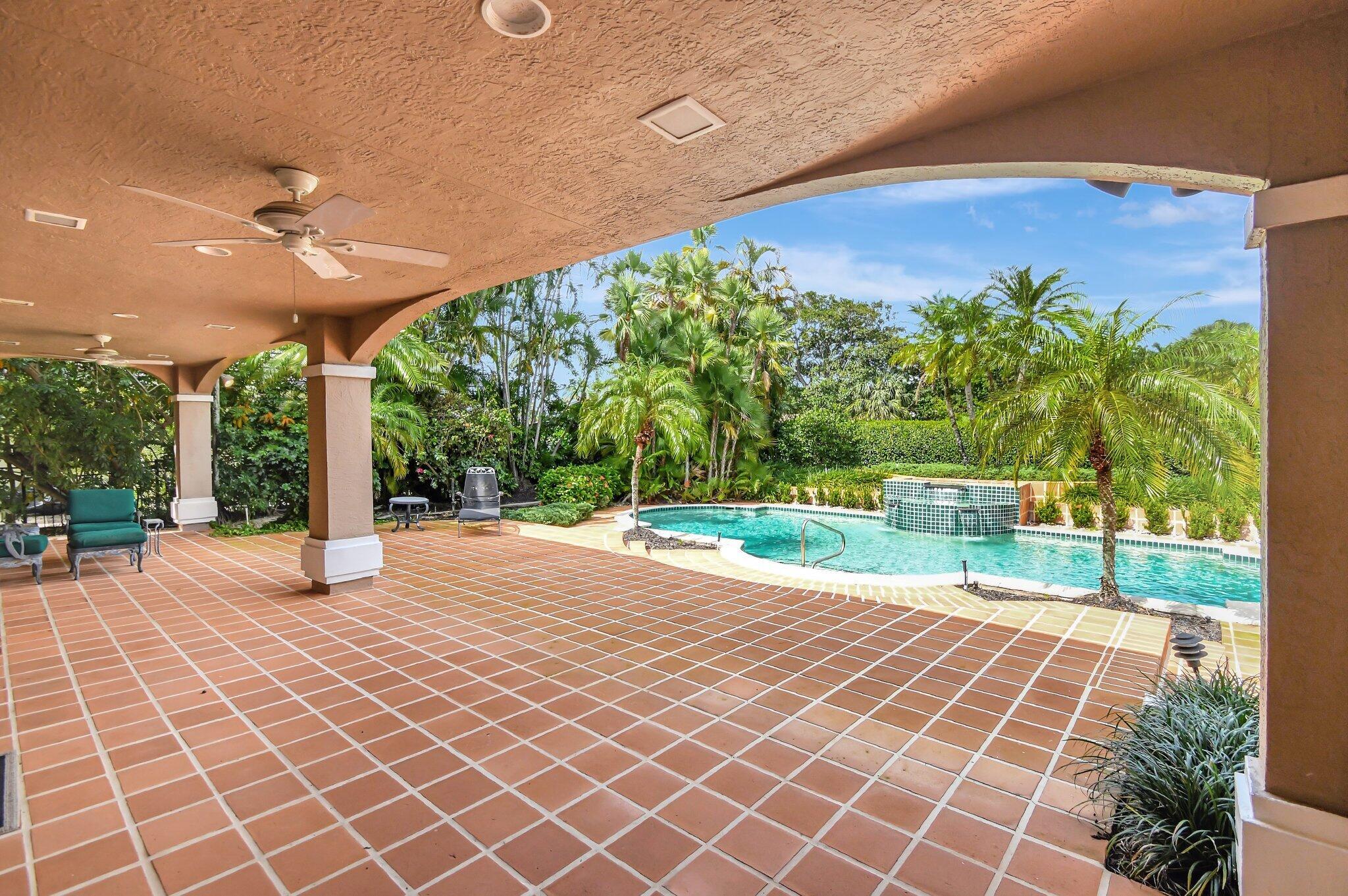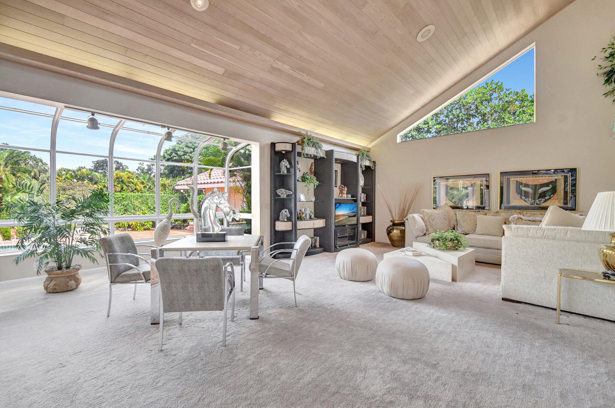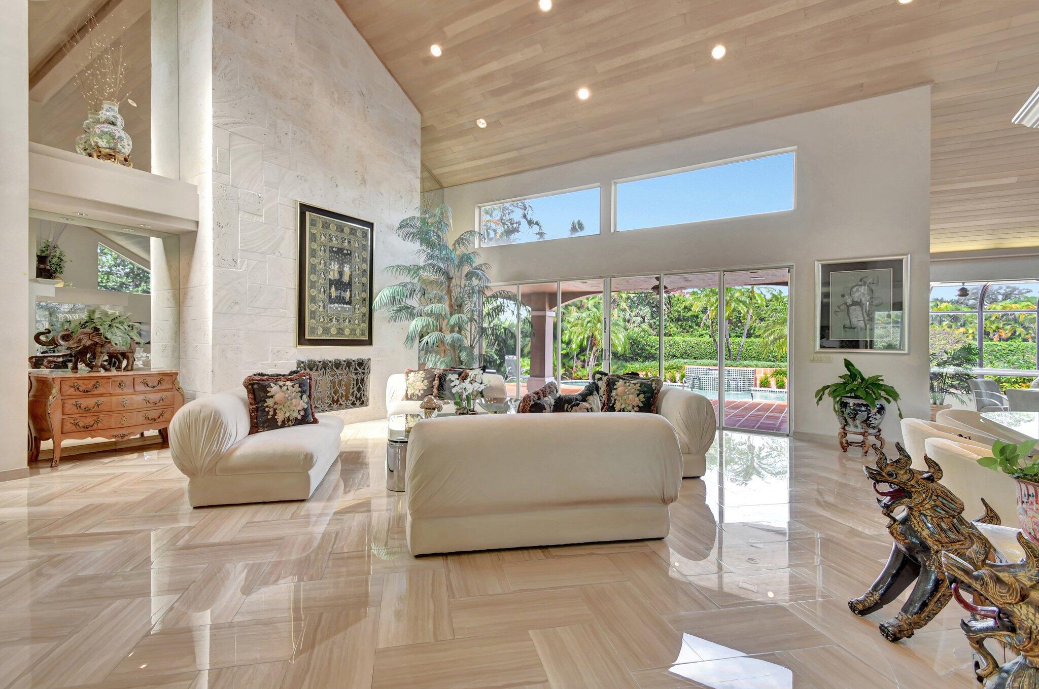 Located on over half an acre in a peaceful cul-de-sac within the exclusive, members-only Boca Grove Country Club, this elegant estate blends classic charm with contemporary design. The home features vaulted cedar ceilings, herringbone Serpengente marble floors, and a towering coral rock fireplace. A unique interior greenhouse flows seamlessly onto the Italian terra cotta patio, creating an inviting space for indoor-outdoor living. The backyard features a beautiful pool with a two-tiered waterfall, surrounded by Mediterranean-inspired details. With 3 bedrooms, 2.5 baths, and a cabana/guest house, this home offers resort-style living in one of Boca Raton's most desirable neighborhoods.