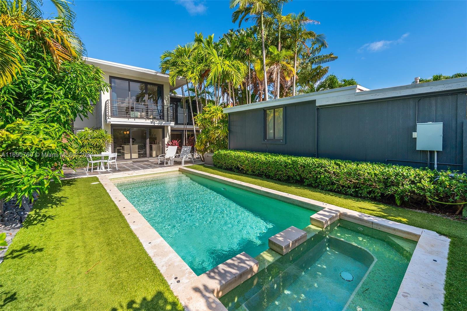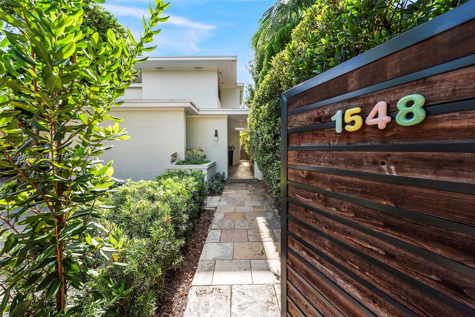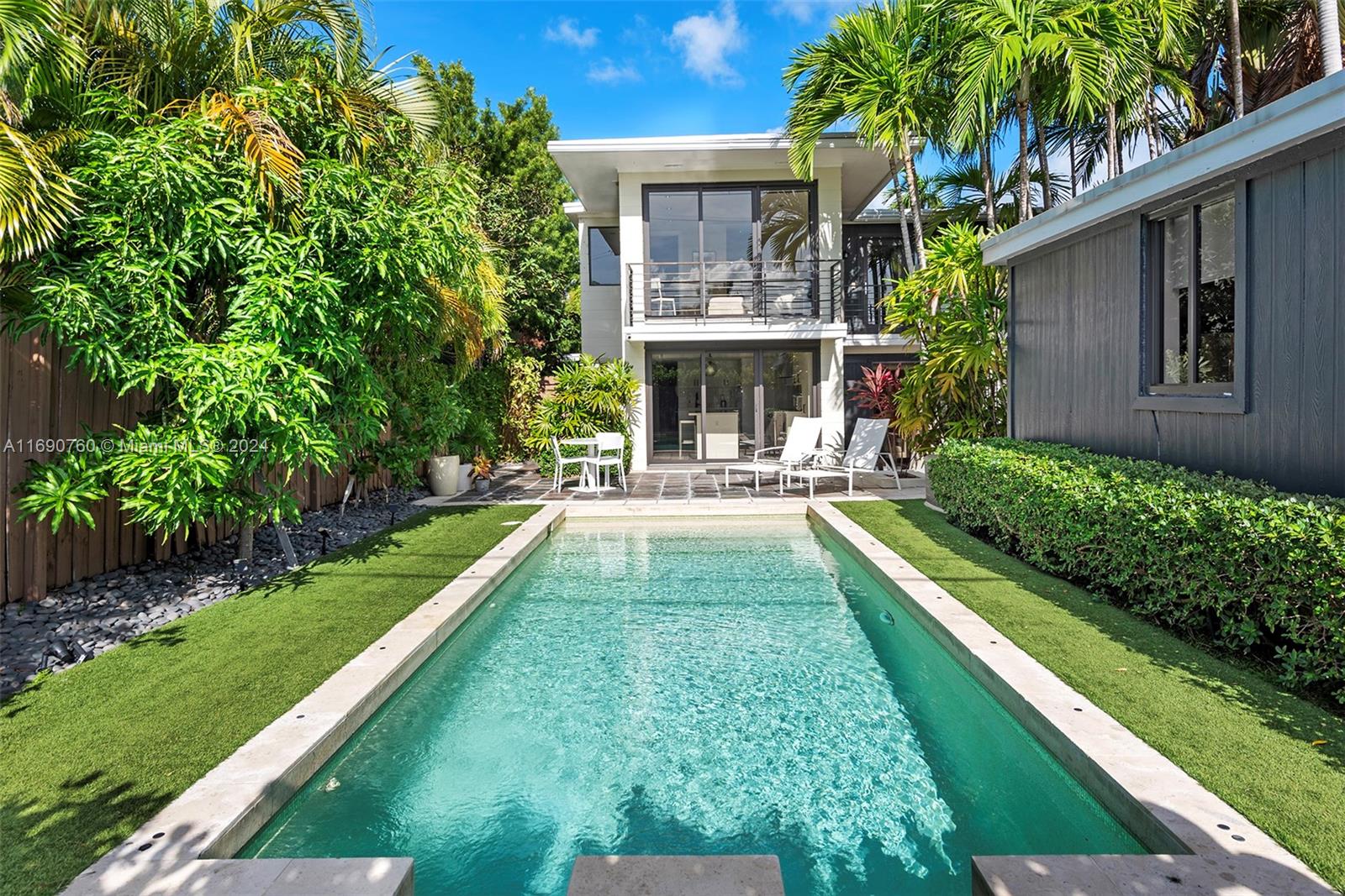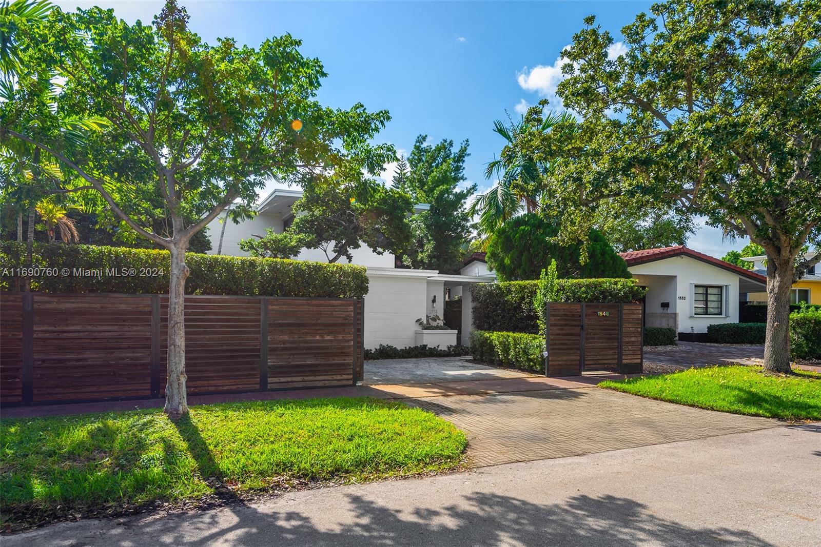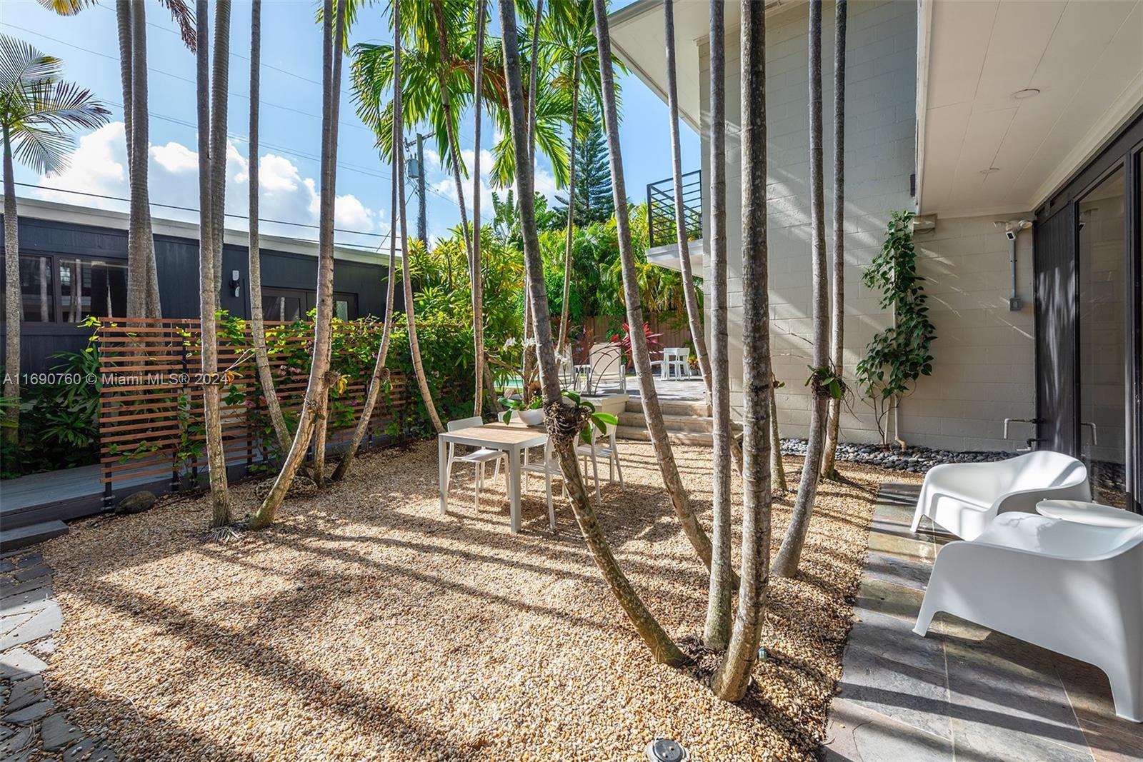 Impeccably crafted, zen-chic home built by a Frank Lloyd Wright protégé and upgraded by Nuhouse Design to amplify the quintessential Miami Beach lifestyle. An expansive entry and open staircase set the stage for the sophisticated interior. Spanning over 2,400 SF of refined living space, the main house encompasses a gourmet kitchen, a modern wood-paneled living room, 3 designer-quality baths and 3 generous bedrooms -including a decadent, spa-like primary ensuite with a spacious walk-in closet. The detached guest house (1 bed/1 bath) adds an additional 600 SF of privacy for guests, nanny or even an income producing tenant. Low-maintenance, landscaped grounds include a large, gated carpark for multiple cars, a sun-drenched pool+spa, and a tropical palm-shaded courtyard for alfresco dining.