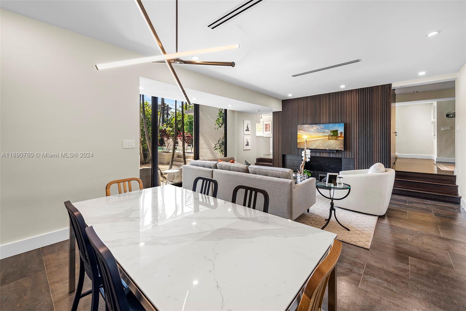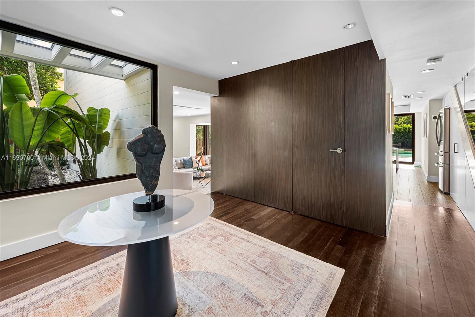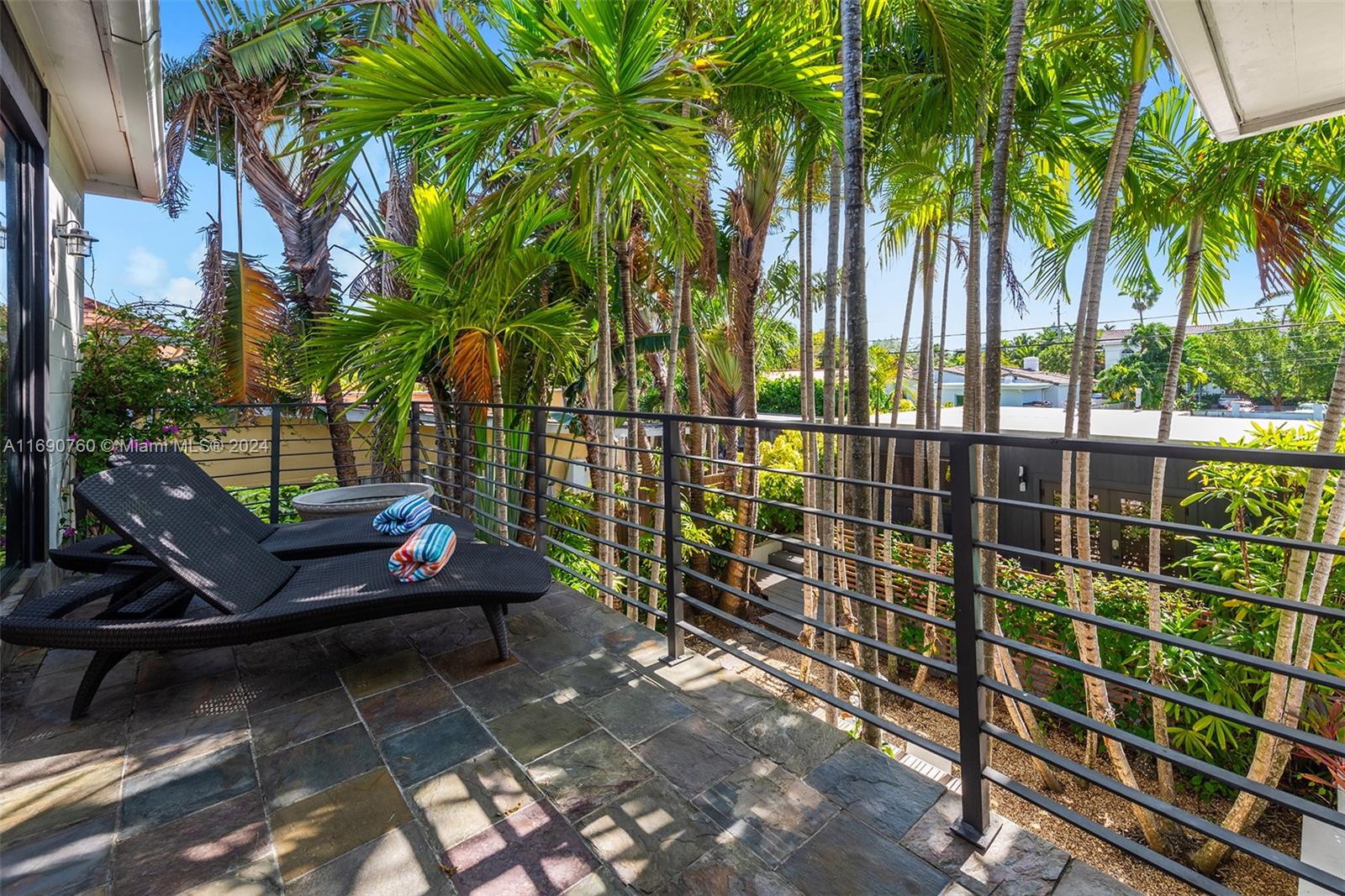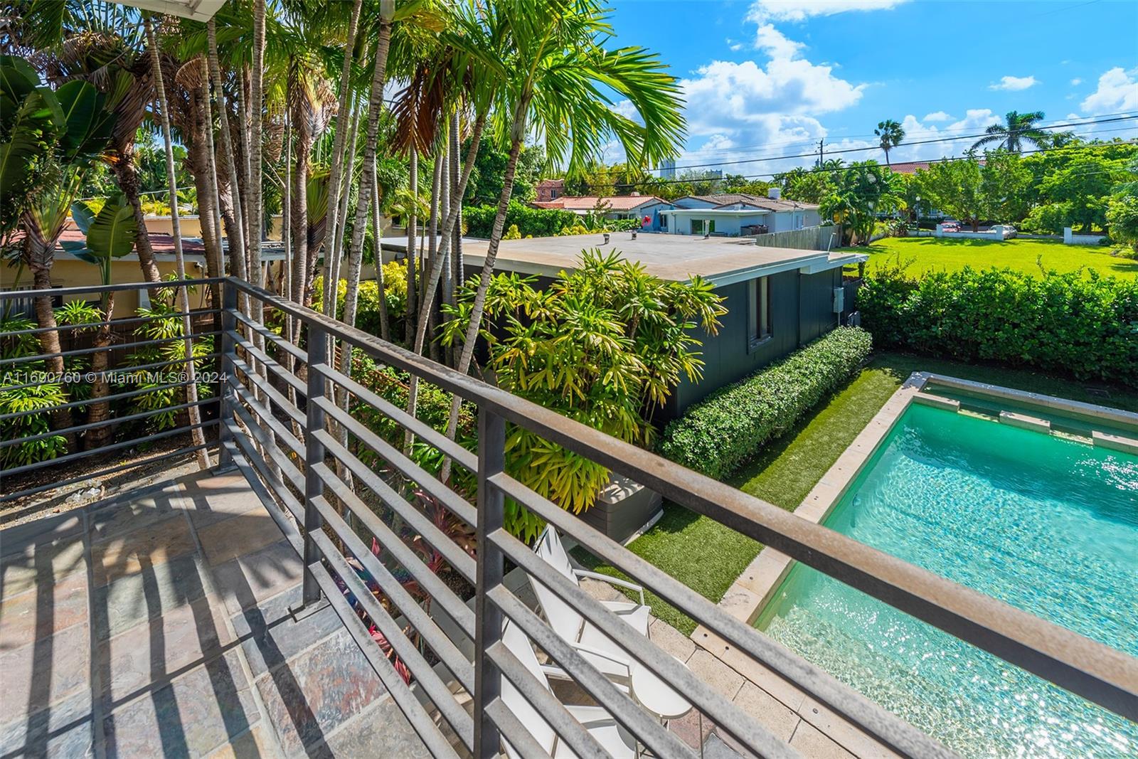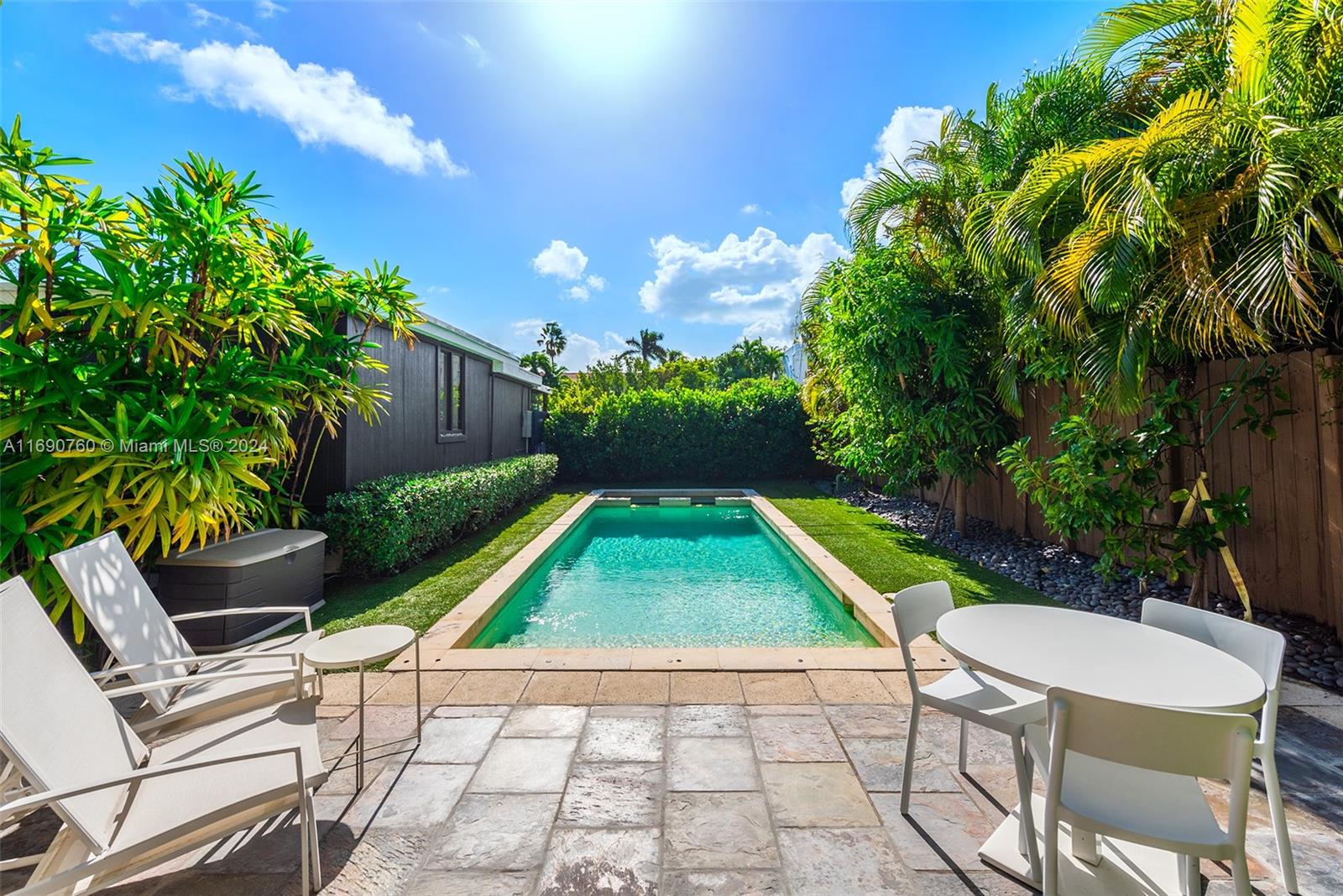 Impeccably crafted, zen-chic home built by a Frank Lloyd Wright protégé and upgraded by Nuhouse Design to amplify the quintessential Miami Beach lifestyle. An expansive entry and open staircase set the stage for the sophisticated interior. Spanning over 2,400 SF of refined living space, the main house encompasses a gourmet kitchen, a modern wood-paneled living room, 3 designer-quality baths and 3 generous bedrooms -including a decadent, spa-like primary ensuite with a spacious walk-in closet. The detached guest house (1 bed/1 bath) adds an additional 600 SF of privacy for guests, nanny or even an income producing tenant. Low-maintenance, landscaped grounds include a large, gated carpark for multiple cars, a sun-drenched pool+spa, and a tropical palm-shaded courtyard for alfresco dining.