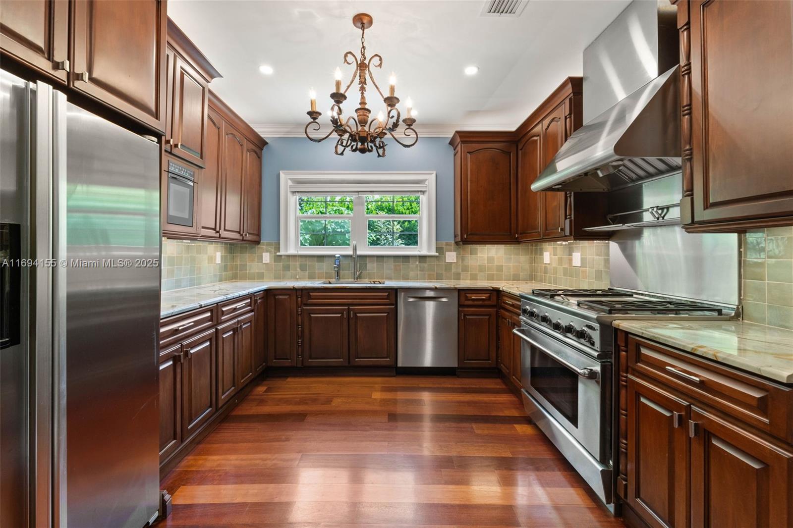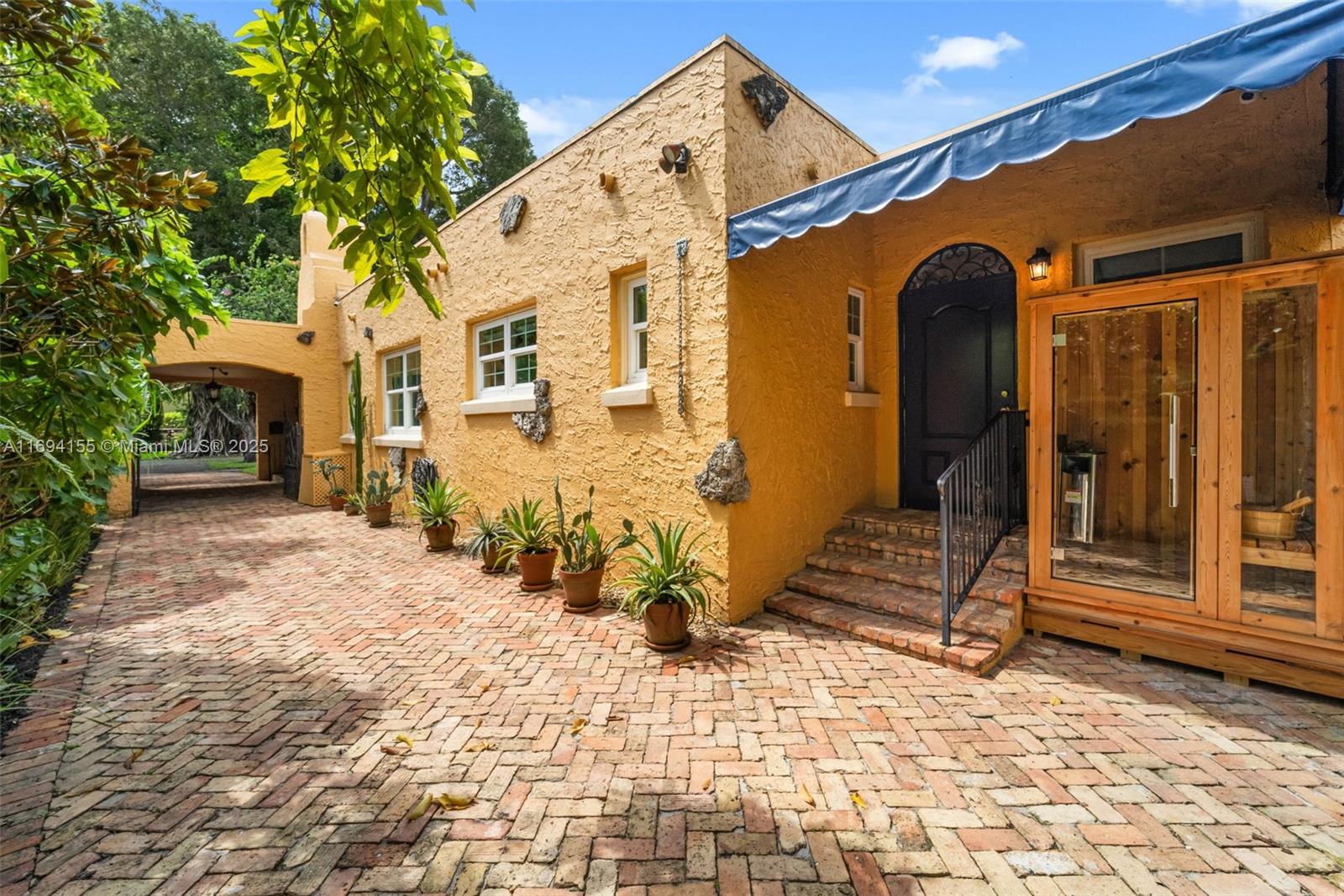 Adjusted Area living area 1,999 Sq.Ft Spanish Mediterranean revival architecture, an elegantly curated home; 3 bedrooms / 2 baths in the main house and a 1 bed / 1 bath detached guest cottage. Located in the heart of Coral Gables, on a tree-lined street and walking distance to Giralda Plaza and Miracle mile. This home features striking cherry wood floors throughout; all bathrooms have been updated; renovated and spacious kitchen with gas stove; hurricane impact windows; Fully functional fireplace. Chicago brick driveway leads to the porte-cochere, back to the cottage and around to the backyard. Digitally controlled sprinkler system, and many other enhancements. Mature landscape.