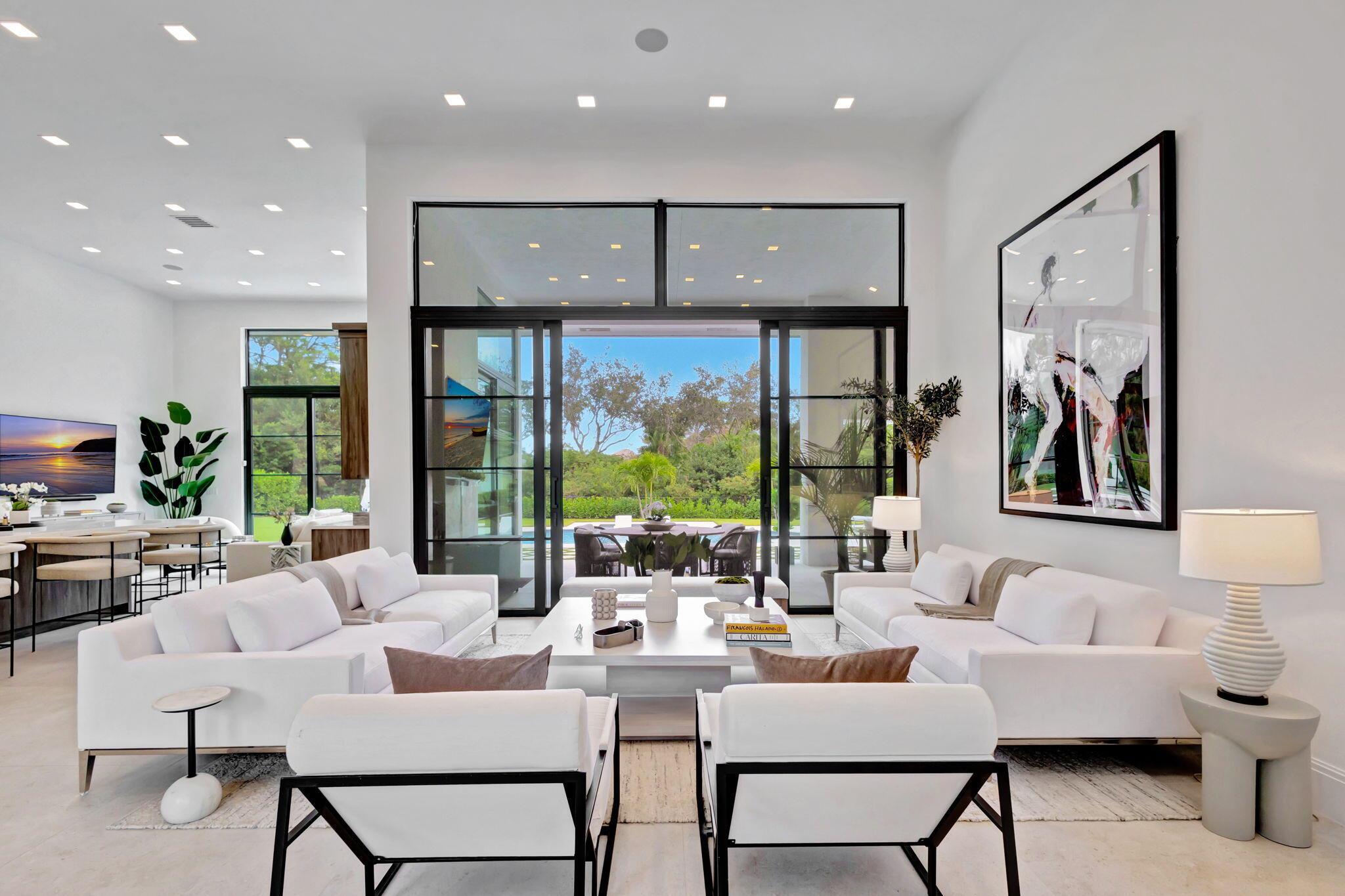 Stunning, chic renovated contemporary home nestled on a lush, half-acre lot, offering a perfect blend of style and sophistication. Upon entering this home you'll be immediately captivated by the abundant natural light streaming through 16-foot floor-to-ceiling windows. The home exudes striking beauty and suburb meticulous design of every room. High-end finishes and thoughtful details abound, including porcelain tile flooring throughout, hurricane-impact glass windows, Brazilian walnut cabinetry, Thermador appliances, a wet bar, and a 2020 roof. The home also features an integrated indoor/outdoor Sonos sound system and elegant architectural details at every turn. Covered loggias offer serene views of the salt water heated pool and meticulously landscaped gardens in the spacious private