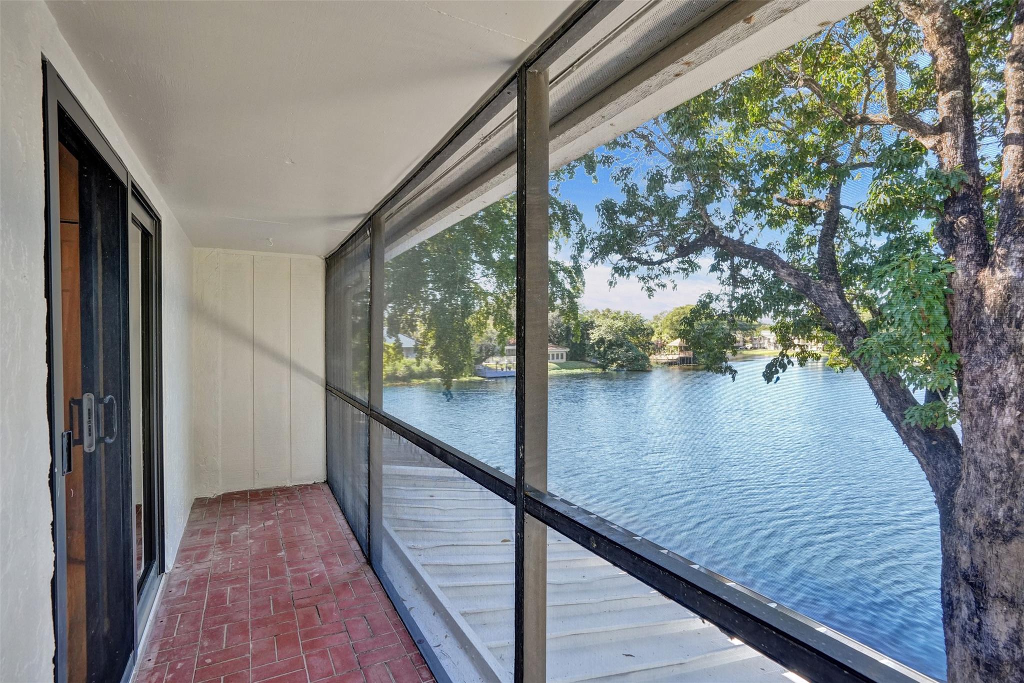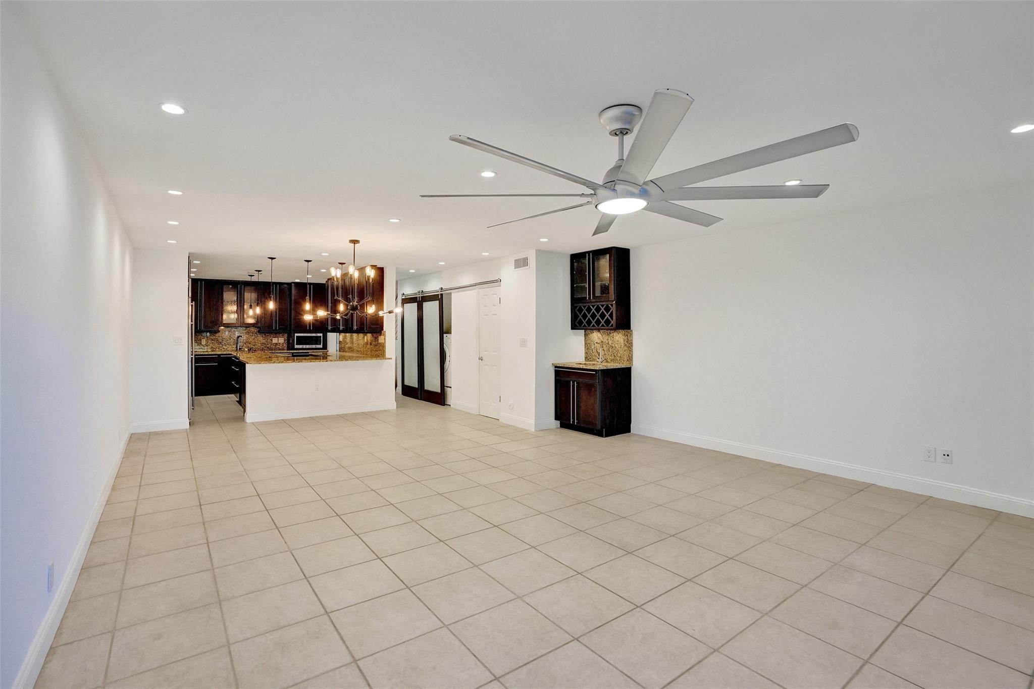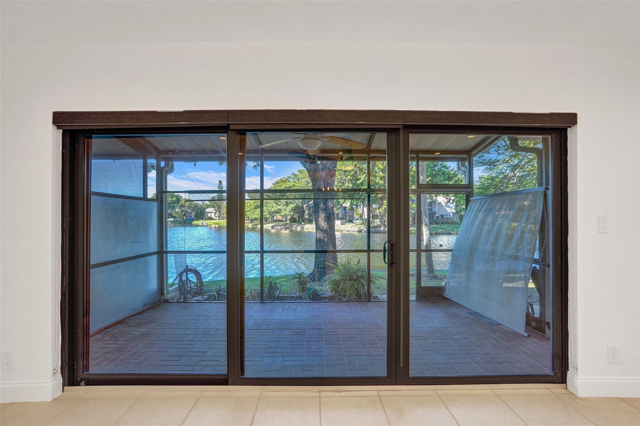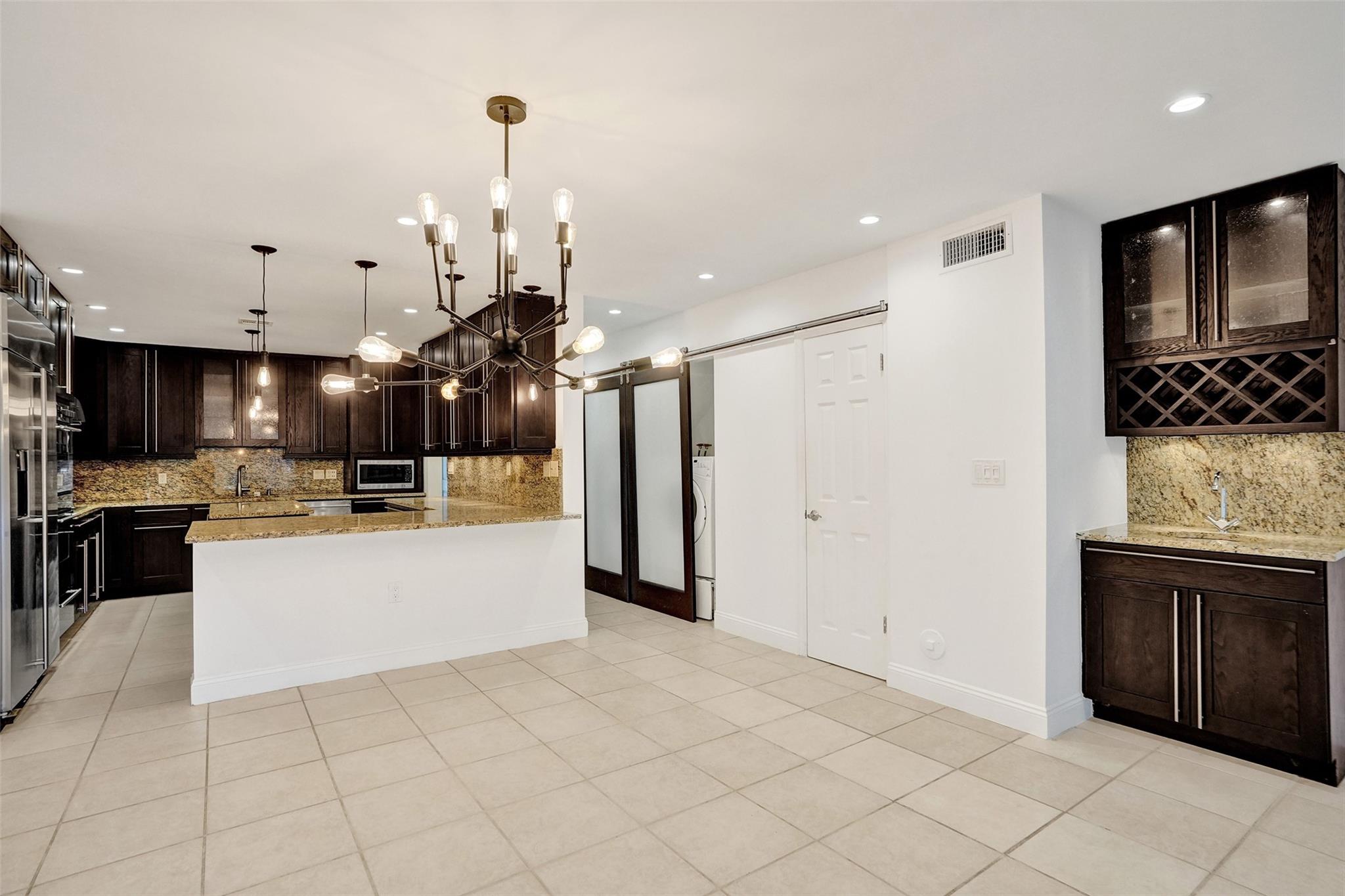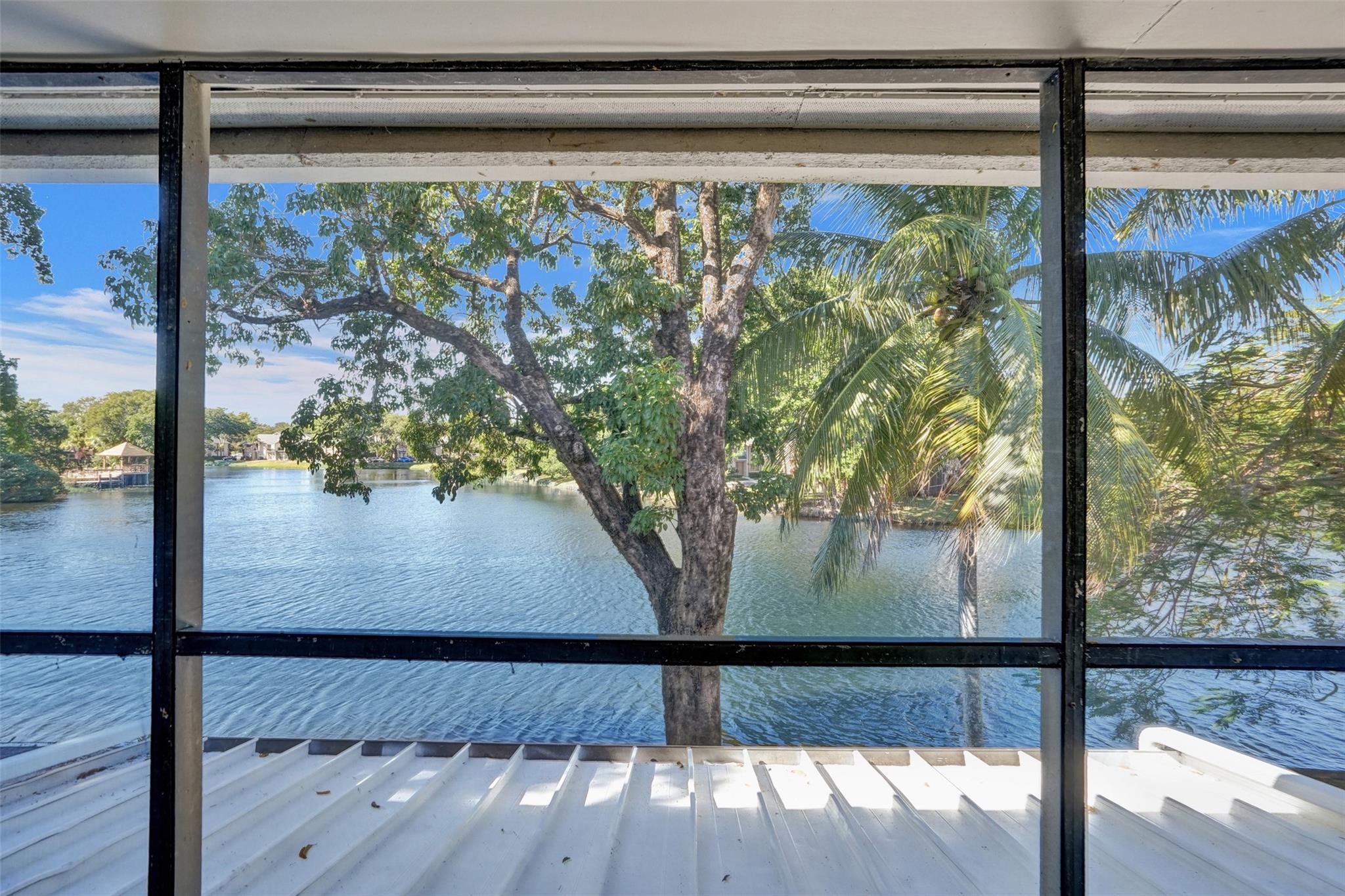 Foyer entry leads into a spectacular remodeled kitchen featuring beautiful Thomasville cabinets, granite counters and backsplash. Upgraded stove with double ovens and a warmer. Beautiful range hood, oversize stainless steel GE Monogram refrigerator, microwave conveniently located at the corner of the kitchen. Center island for your prep work. Wine cooler built in, lots of light and all open to the spacious family living area. Downstairs bedroom. Large tile throughout. Living area w/sunscreen window covers for energy efficiency. Screened patio with beautiful lake view. Upstairs are 2 bedrooms w/remodeled bathrooms. Another screened patio and roof deck. Washer/dryer. Thick impact windows and doors throughout. Two car parking space with guest parking close to the unit.