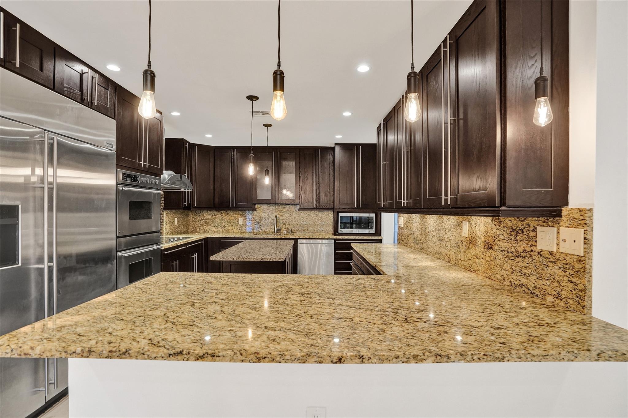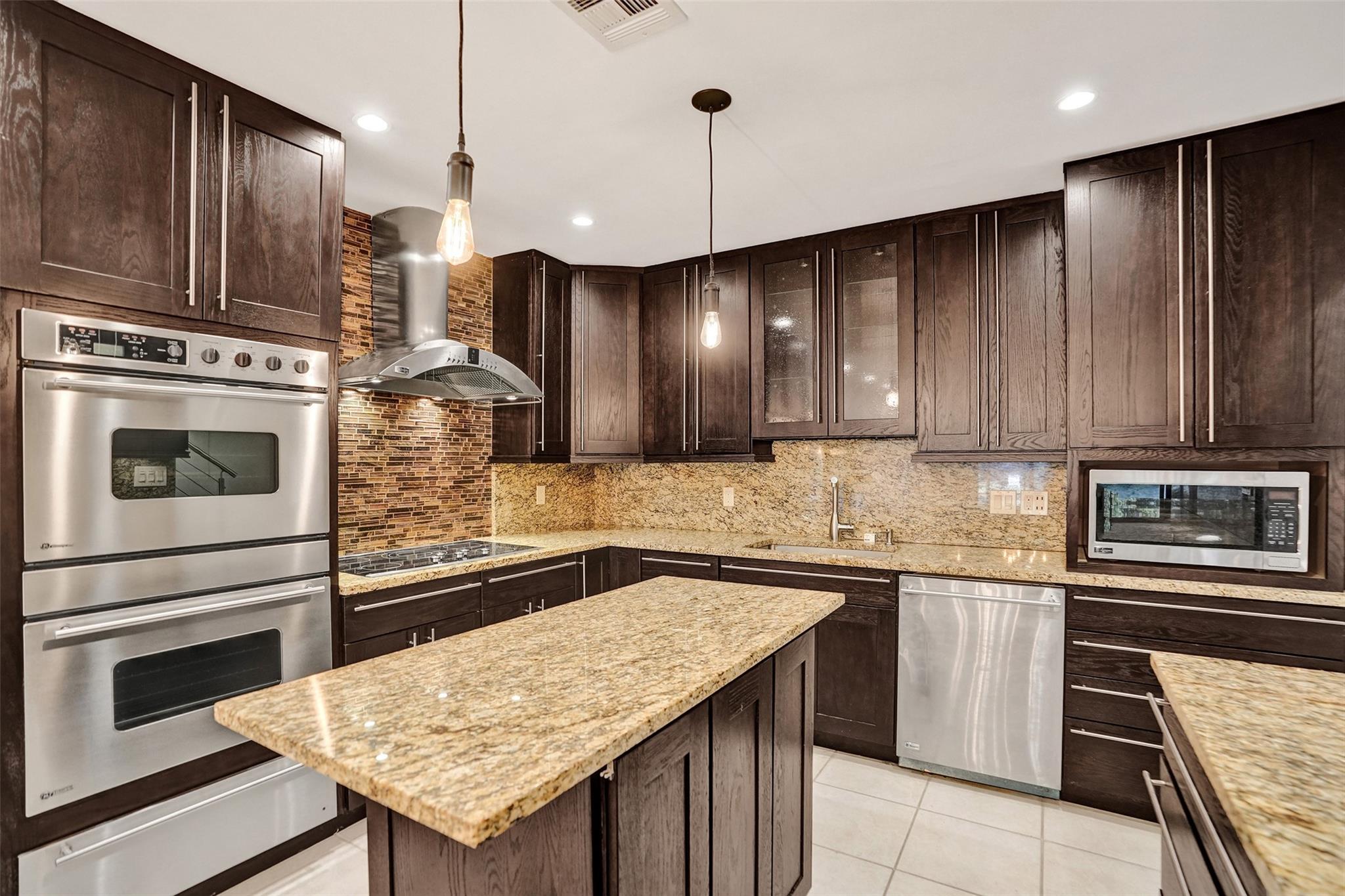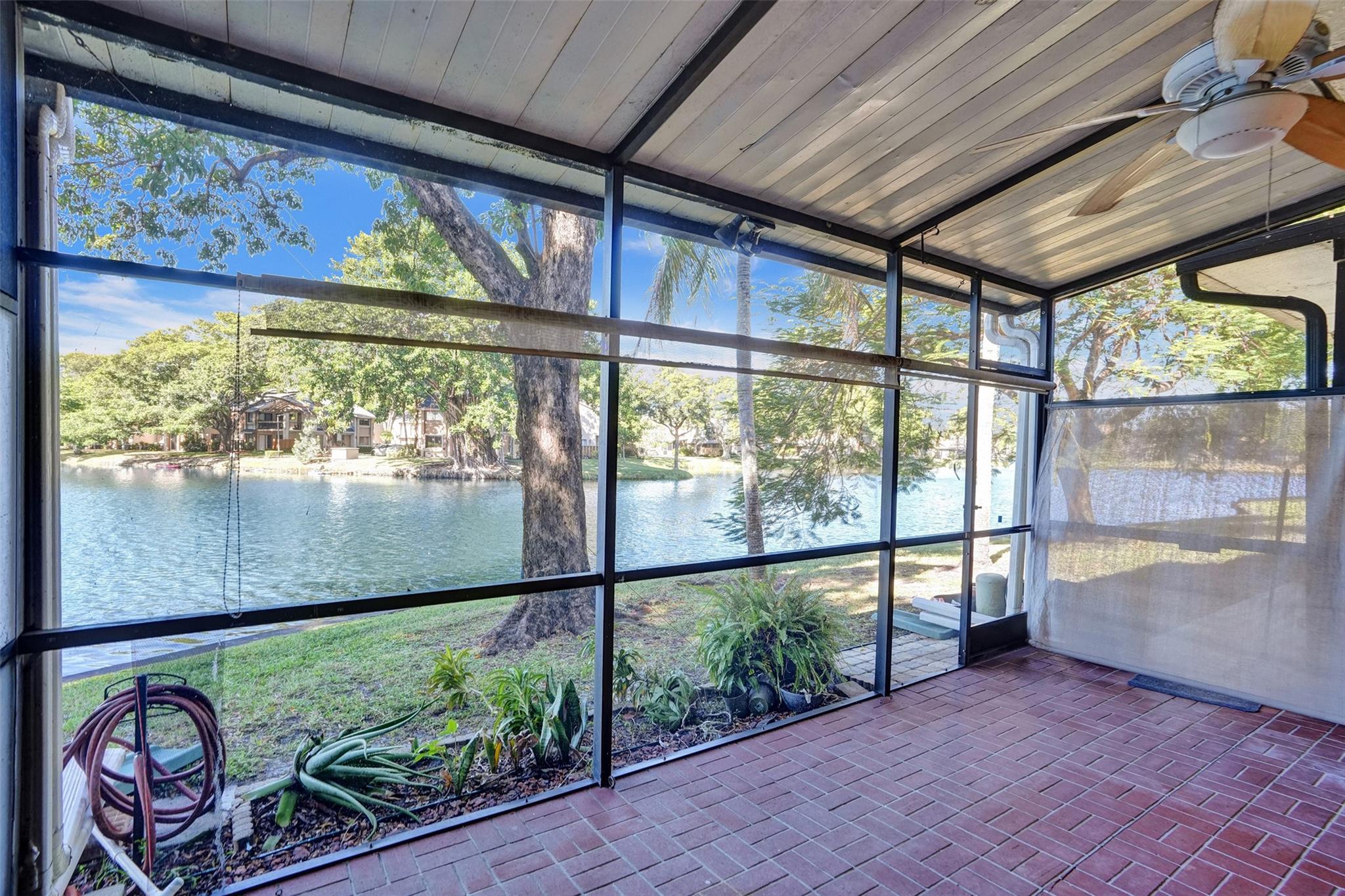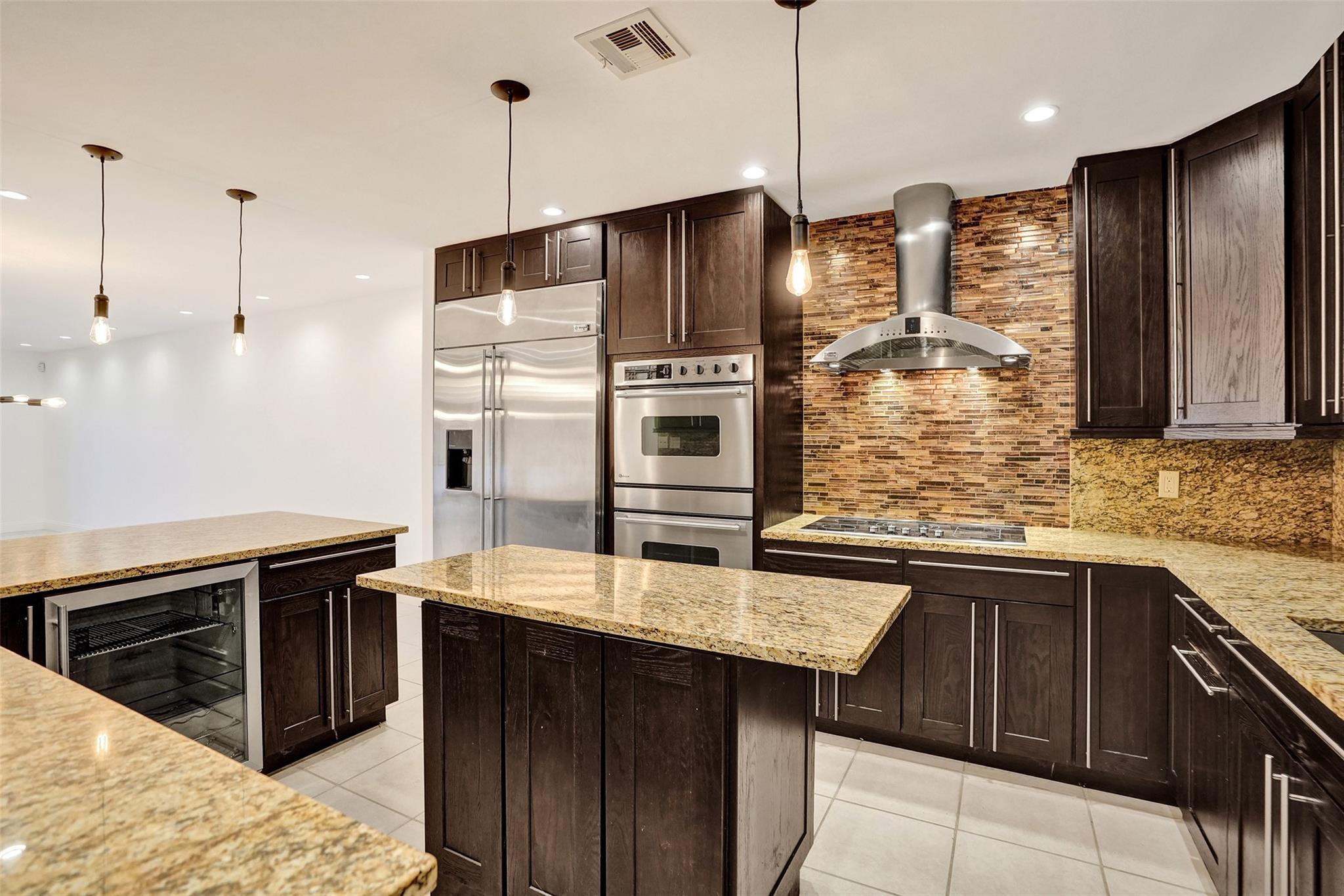 Foyer entry leads into a spectacular remodeled kitchen featuring beautiful Thomasville cabinets, granite counters and backsplash. Upgraded stove with double ovens and a warmer. Beautiful range hood, oversize stainless steel GE Monogram refrigerator, microwave conveniently located at the corner of the kitchen. Center island for your prep work. Wine cooler built in, lots of light and all open to the spacious family living area. Downstairs bedroom. Large tile throughout. Living area w/sunscreen window covers for energy efficiency. Screened patio with beautiful lake view. Upstairs are 2 bedrooms w/remodeled bathrooms. Another screened patio and roof deck. Washer/dryer. Thick impact windows and doors throughout. Two car parking space with guest parking close to the unit.