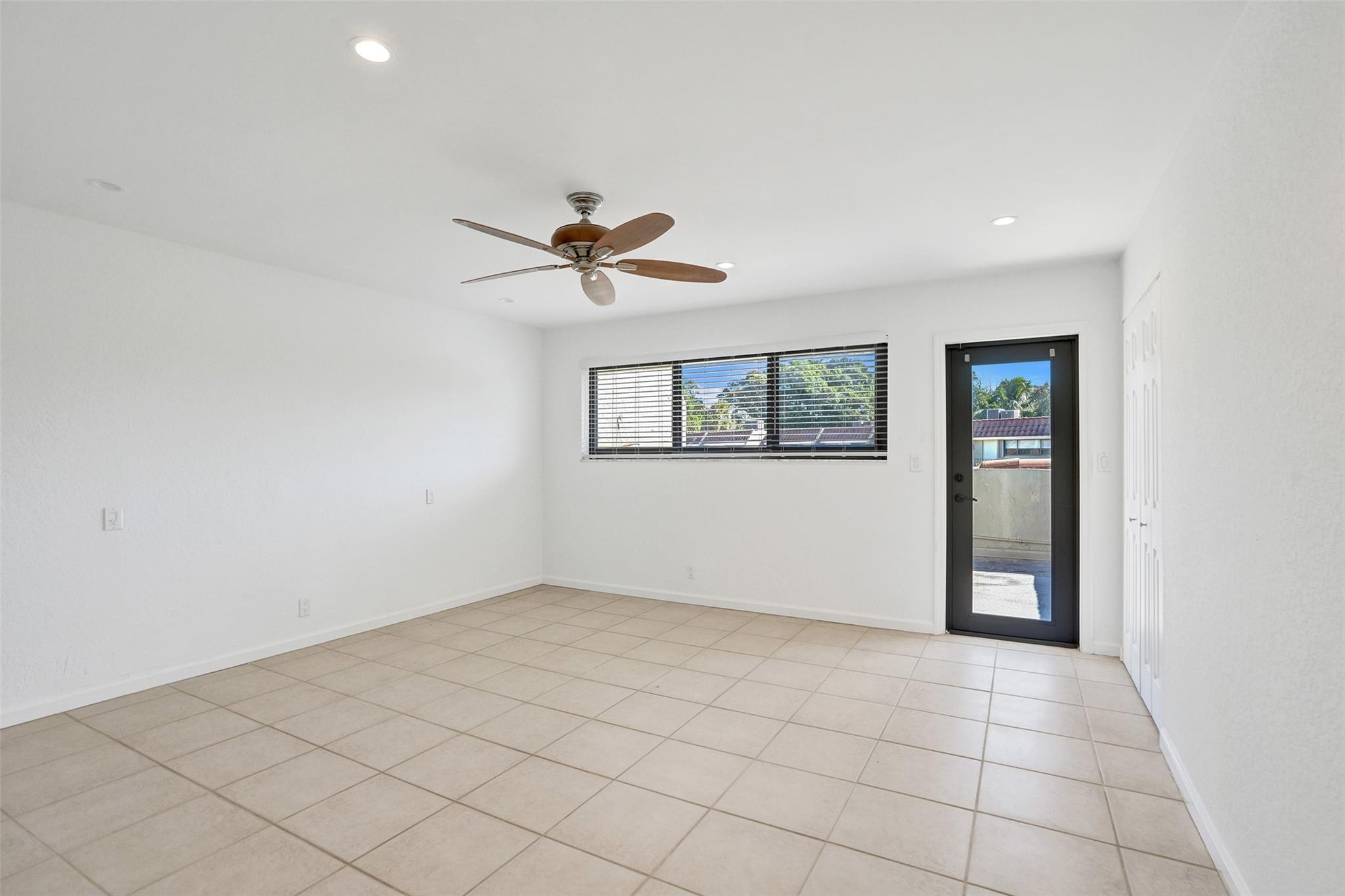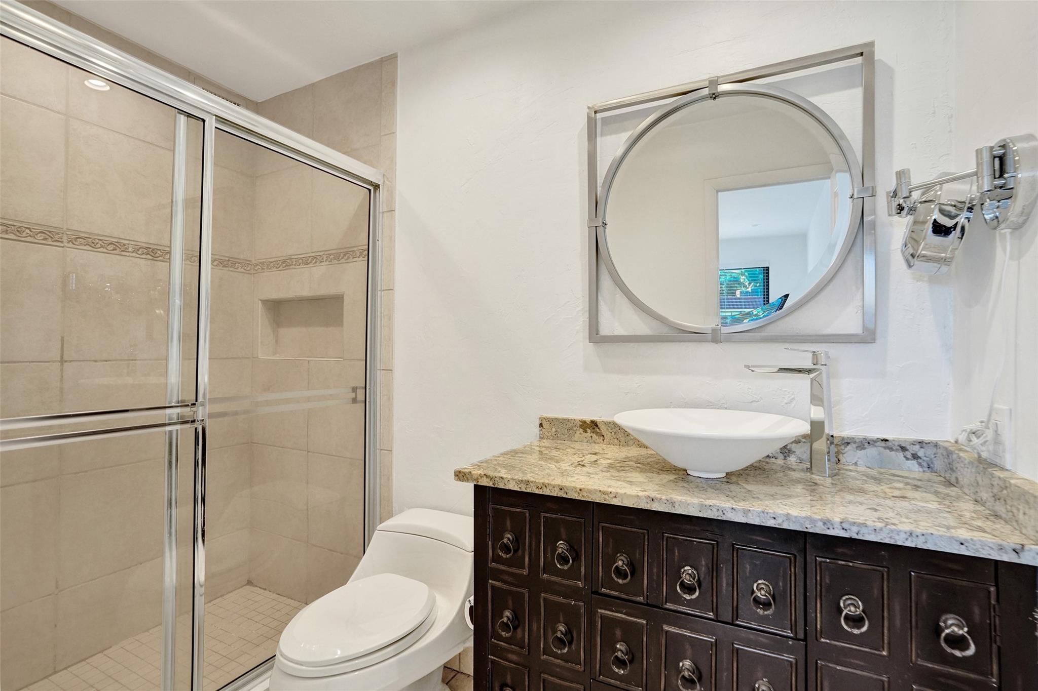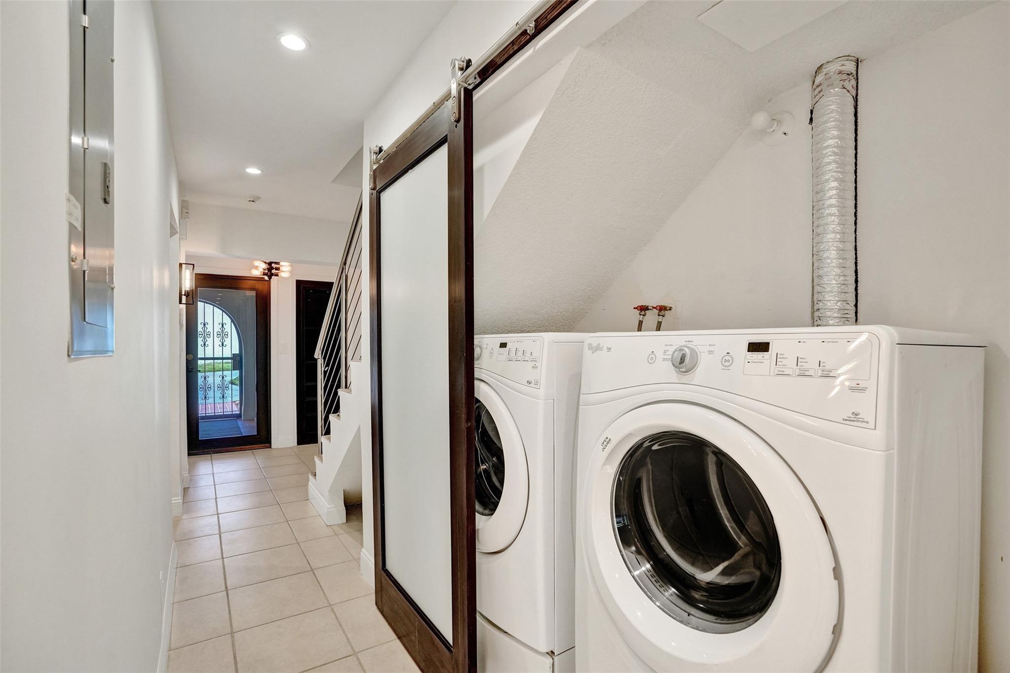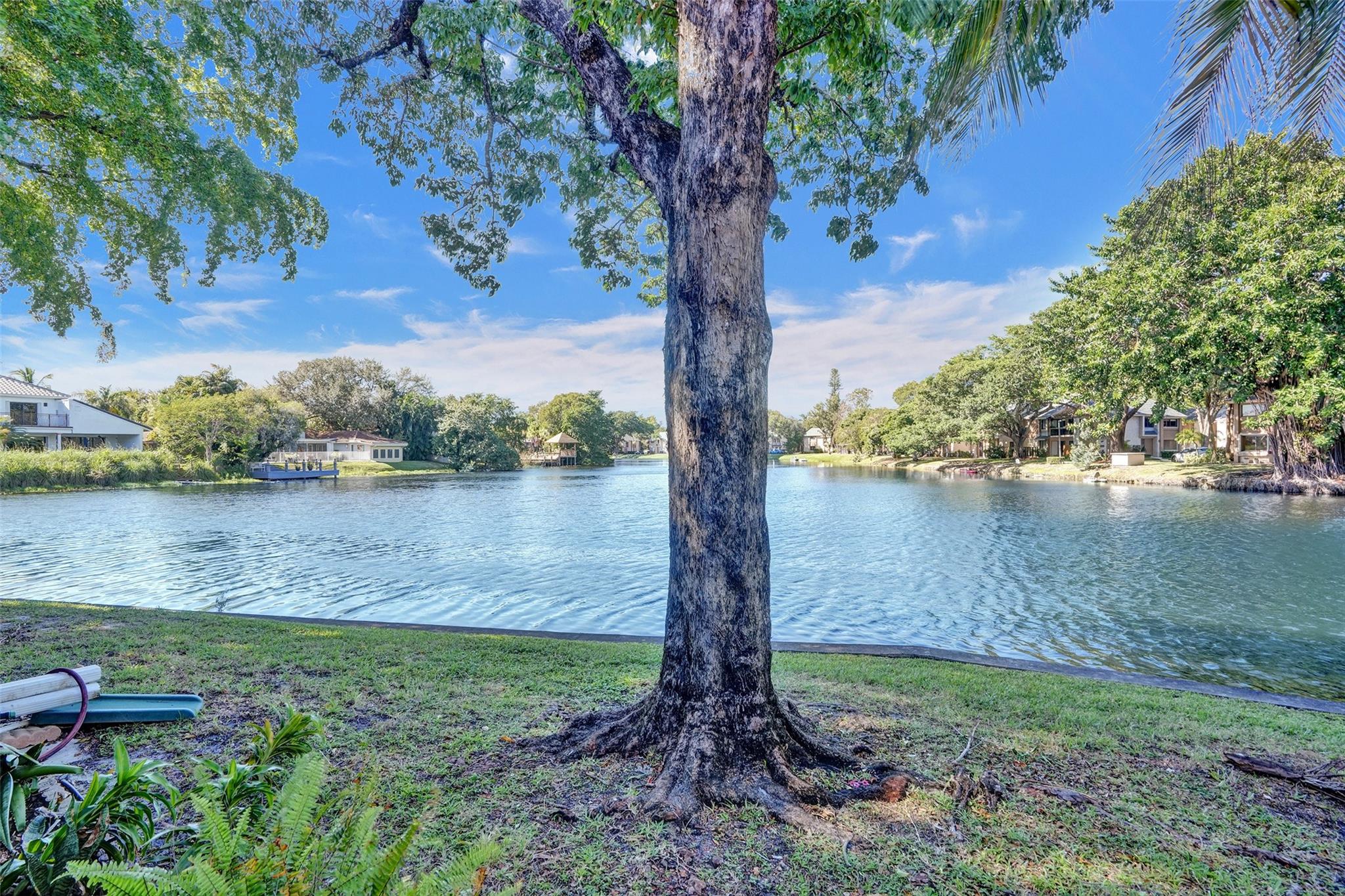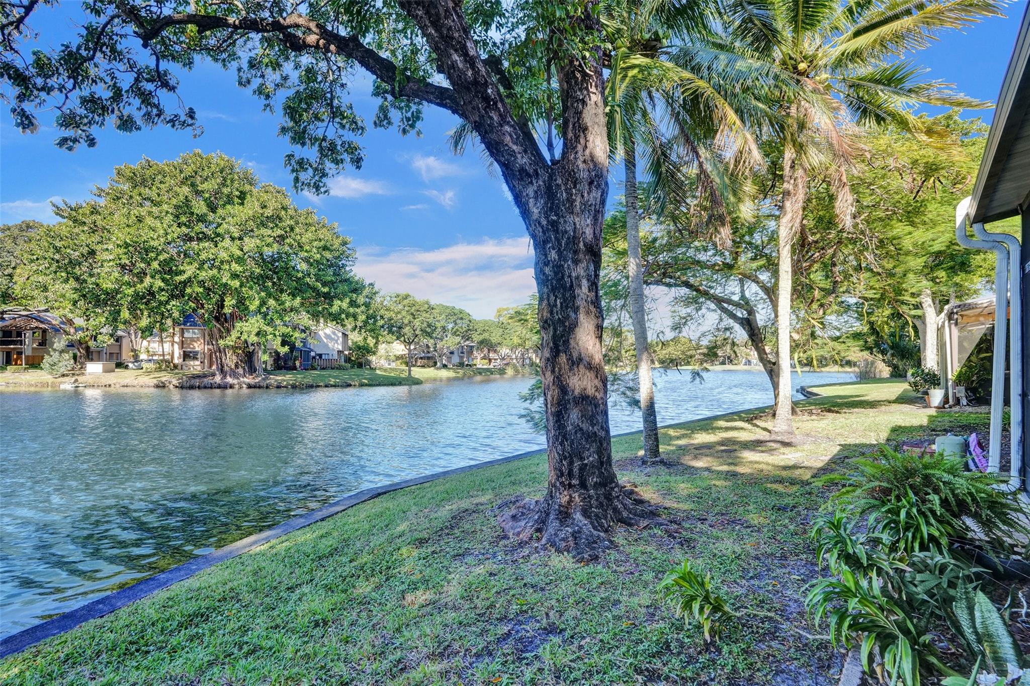 Foyer entry leads into a spectacular remodeled kitchen featuring beautiful Thomasville cabinets, granite counters and backsplash. Upgraded stove with double ovens and a warmer. Beautiful range hood, oversize stainless steel GE Monogram refrigerator, microwave conveniently located at the corner of the kitchen. Center island for your prep work. Wine cooler built in, lots of light and all open to the spacious family living area. Downstairs bedroom. Large tile throughout. Living area w/sunscreen window covers for energy efficiency. Screened patio with beautiful lake view. Upstairs are 2 bedrooms w/remodeled bathrooms. Another screened patio and roof deck. Washer/dryer. Thick impact windows and doors throughout. Two car parking space with guest parking close to the unit.