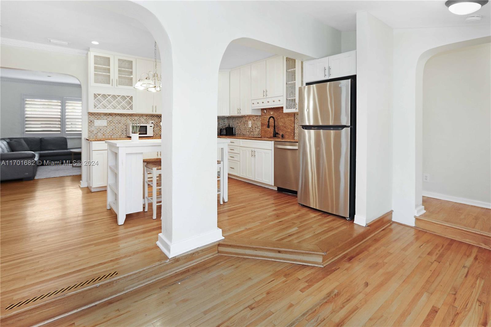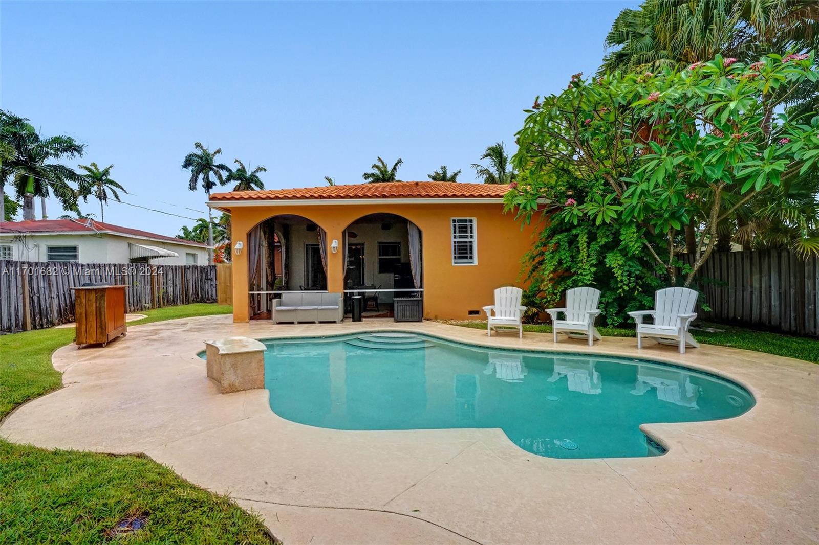 This spacious, 3-bed, 2-bath home offers a split floor plan and a one-car garage. Enjoy a heated pool, impact windows, and a stylish kitchen featuring S/S appliances, a mosaic tile backsplash, and granite countertops. Original crown molding adds charm to the living, dining, and kitchen areas, while the main bedroom includes a large walk-in closet with custom shelving. The primary bath features a porcelain-tiled shower with a mosaic accent and a glass door. Unwind in the Florida room or under the covered patio with elegant arches, ideal for entertaining. Additional highlights include a gazebo, circular driveway, tankless gas water heater, and plantation shutters in select bedrooms. One bathroom includes a shower/tub combo. Located Just minutes from beaches, downtown, golf, and more.
