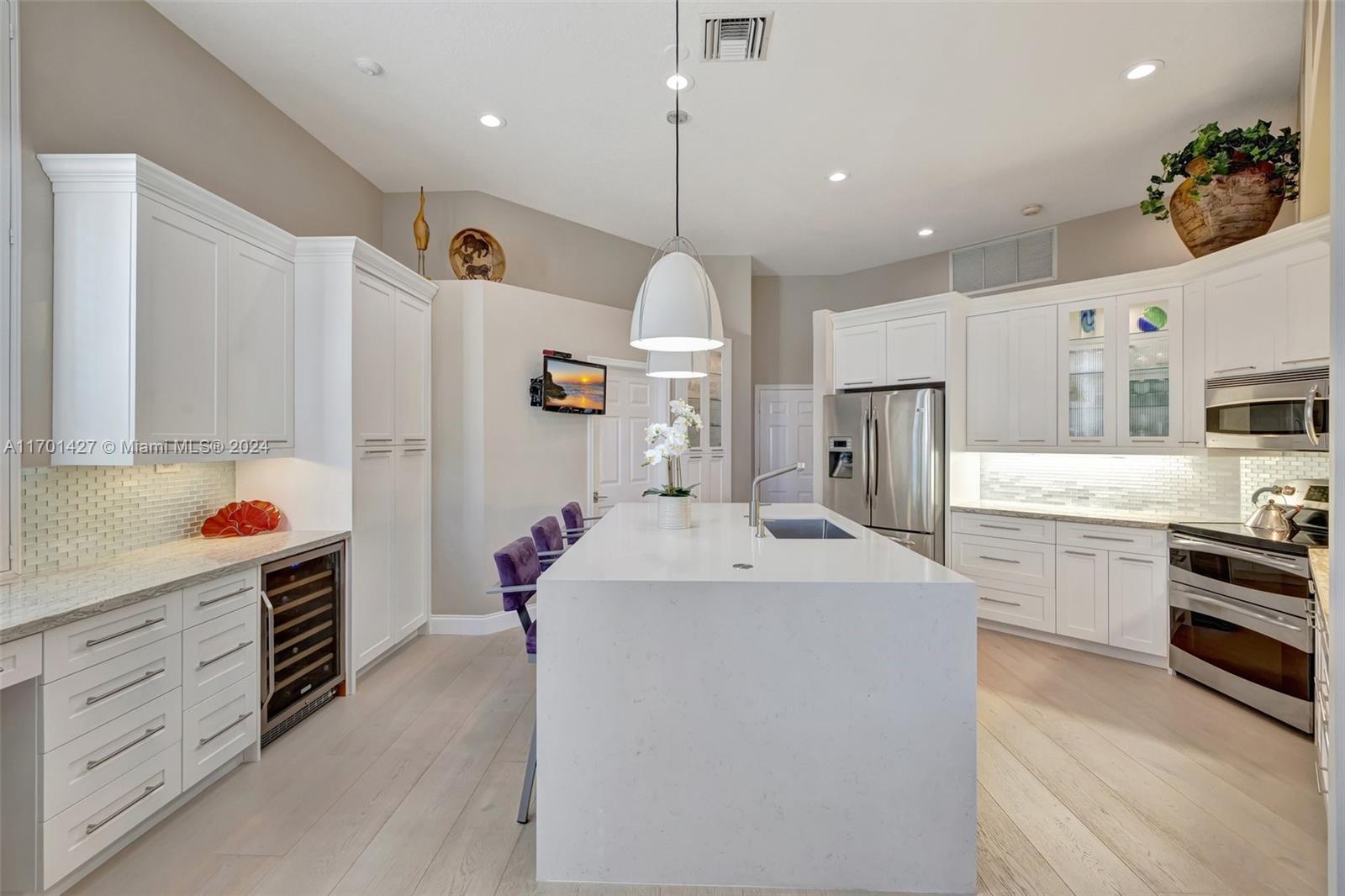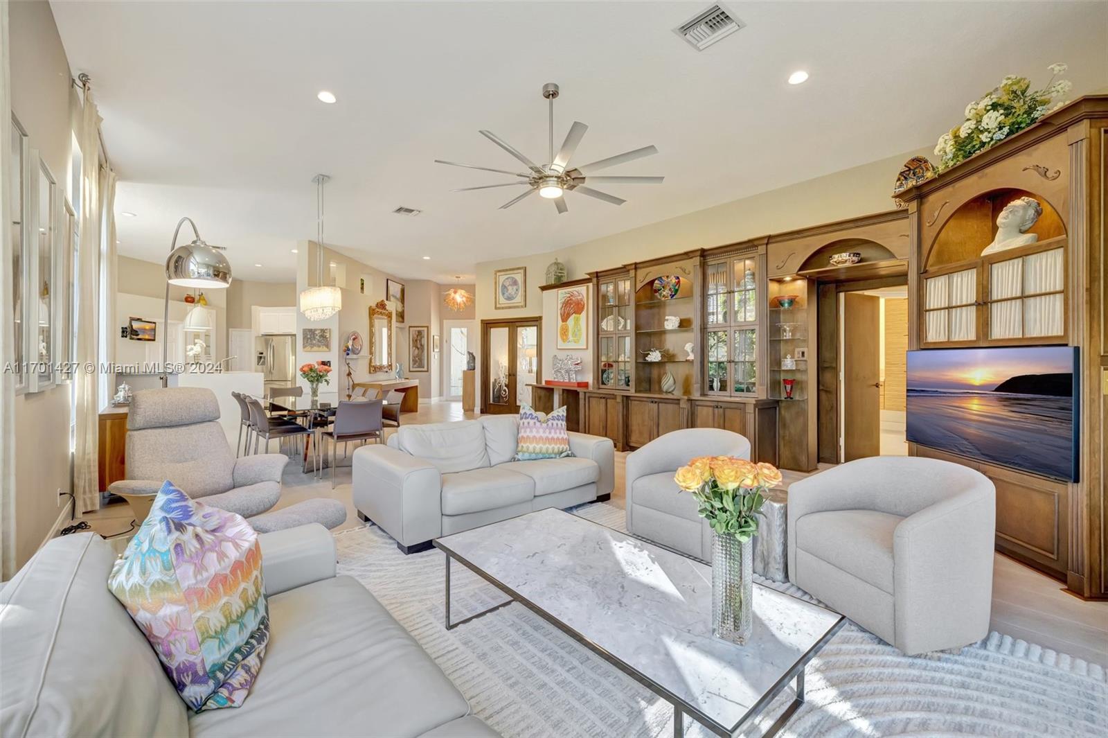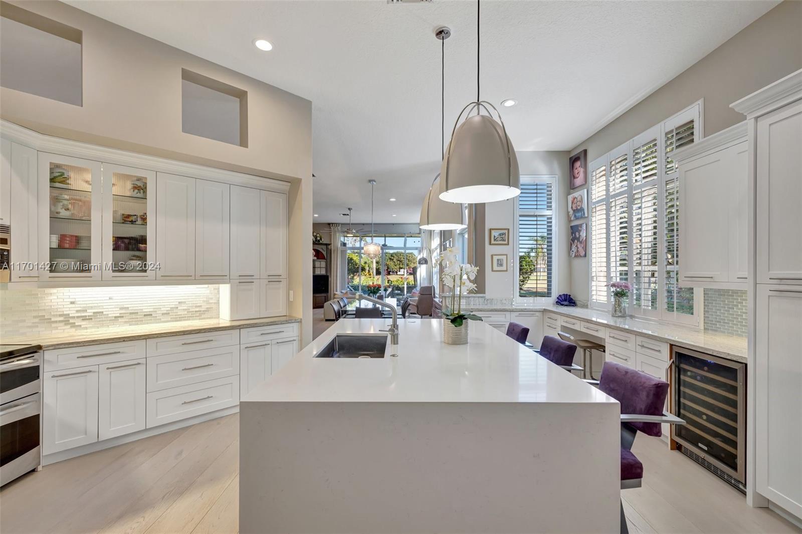 Stunning totally updated 3-bed, 3-bath home in exclusive Bay Isle at Weston Hills on oversized pie shaped lot w/ NE back exposure. Gorgeous golf & lake views, private, quiet cul-de-sac setting. Open concept layout w/ volume ceilings & bright airy spaces w/ gorgeous wide plank white oak in living area, built-ins in Office, Living & Guest Rms. Sparkling clean, move in ready; pride of ownership evident, same owner since '97. Spacious primary bedroom w/ 2 custom walk-ins & stunningly updated en-suite bathroom w/ freestanding tub & top of the line cabinets. Kitchen w/ wood cabinets, quartz & granite counters, stainless, wine bar & desk. 3 yr old Roof, accordion & plantation shutters. Screened patio; A rated schools; guard-gated w/ golf, tennis, gym & restaurant/bar w/ addt'l membership optional
