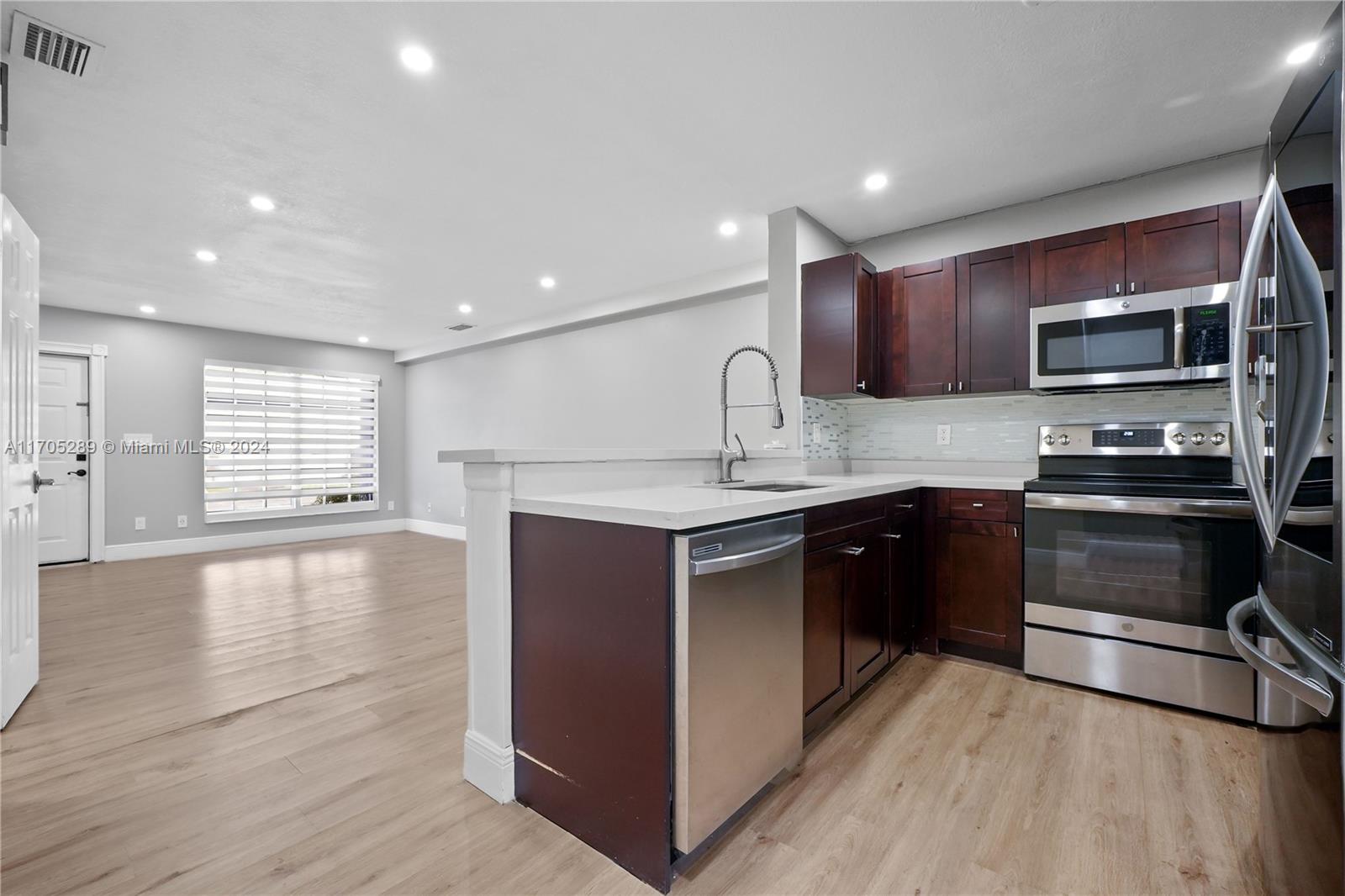 This fully renovated townhouse offers a modern, sleek design with high-end finishes and practical upgrades. As you step inside, you're welcomed by beautiful vinyl flooring that spans throughout the entire home, providing both durability and style. The open-concept living space is bathed in natural light, complemented by recessed lighting that adds an elegant touch. Kitchen features stainless steel appliances that blend seamlessly with pristine quartz countertops. Ample cabinet space and a functional layout make it perfect for both cooking and entertaining. Located in a highly sought area with top rated A schools. AC is 10 years old. Low HOA fee