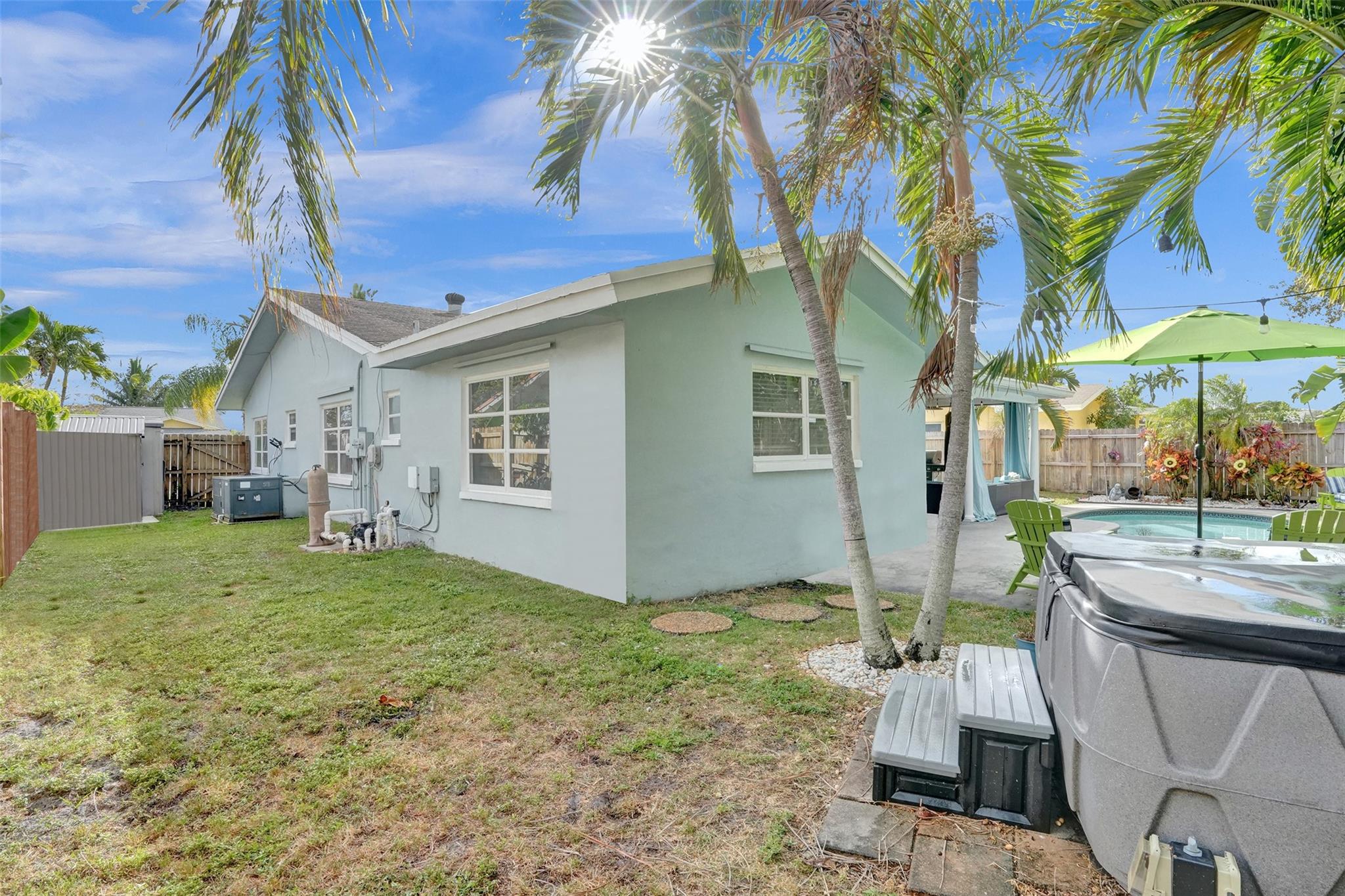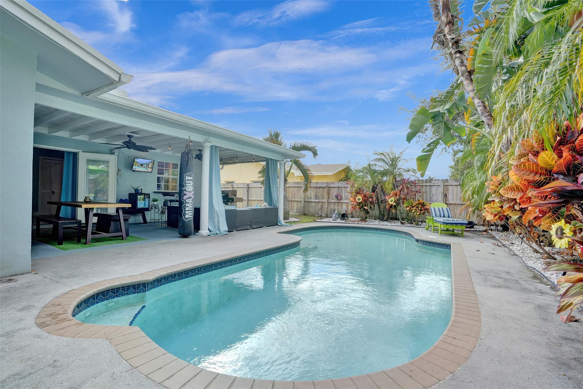 Welcome to 3323 NW 68th Ct, a stunning 3-bedroom, 2-bath home offering the perfect blend of style, comfort, and outdoor living in Fort Lauderdale. The tropical backyard is an entertainer’s dream, featuring a sparkling pool, hot tub, and a covered patio ideal for gatherings and relaxation. Inside, the home boasts a bright and airy layout with a large open kitchen, dedicated dining area, a spacious living room, and a convenient laundry room with ample storage. The 1-car garage, equipped with A/C, is currently used as a fully functional gym, offering added flexibility to suit your lifestyle. With its lush landscaping, inviting outdoor spaces, and thoughtful interior design, this home is a true private retreat!