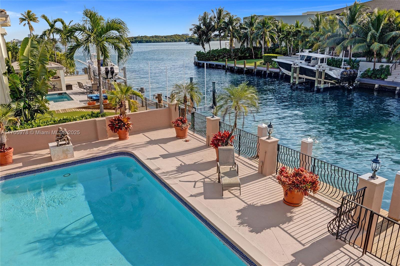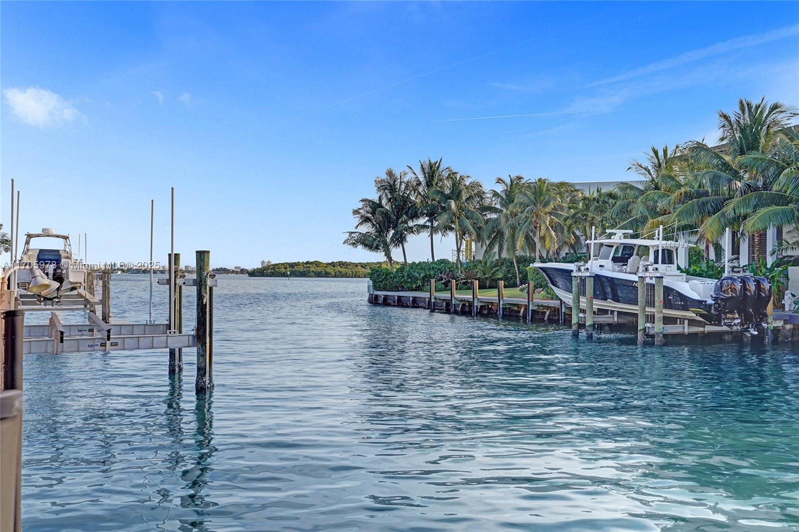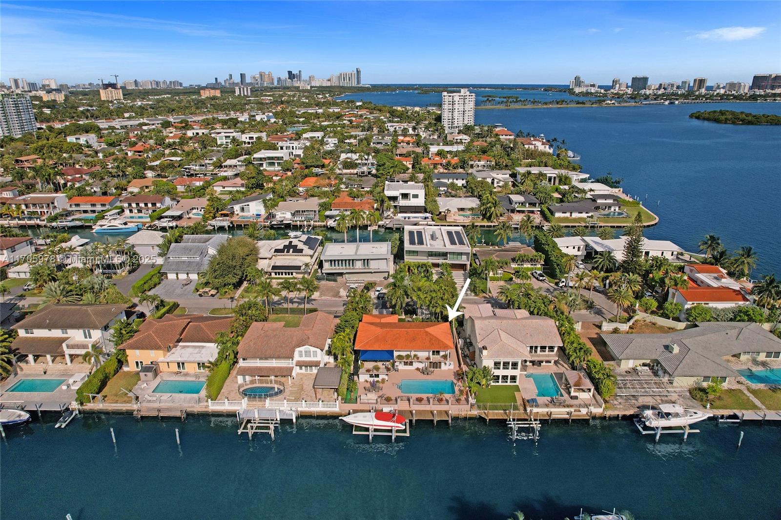 One of a kind with Bay views!!!! Located in the gated, police-protected community of Sans Souci Estates, this 2-story concrete home offers breathtaking open bay views and an extra-wide deep-water canal with ocean access just minutes away. Perfect for larger boats, it features a 20,000-lb boat lift and a sprawling outdoor entertaining area with a pool, lush landscaping, and up-lighting. Inside, enjoy 5BR/4BA, soaring ceilings, marble floors, and natural light throughout. The oversized master suite boasts one of the largest layouts in the area, a spa-like bath, and a huge private terrace overlooking the bay. The air-conditioned 2-car garage doubles as flexible space. This premium property shines day and night, offering luxury waterfront living at its finest.