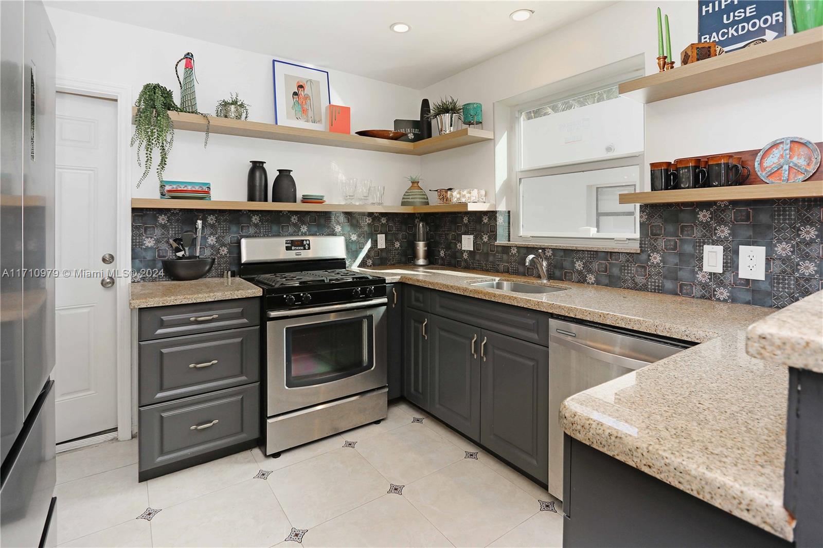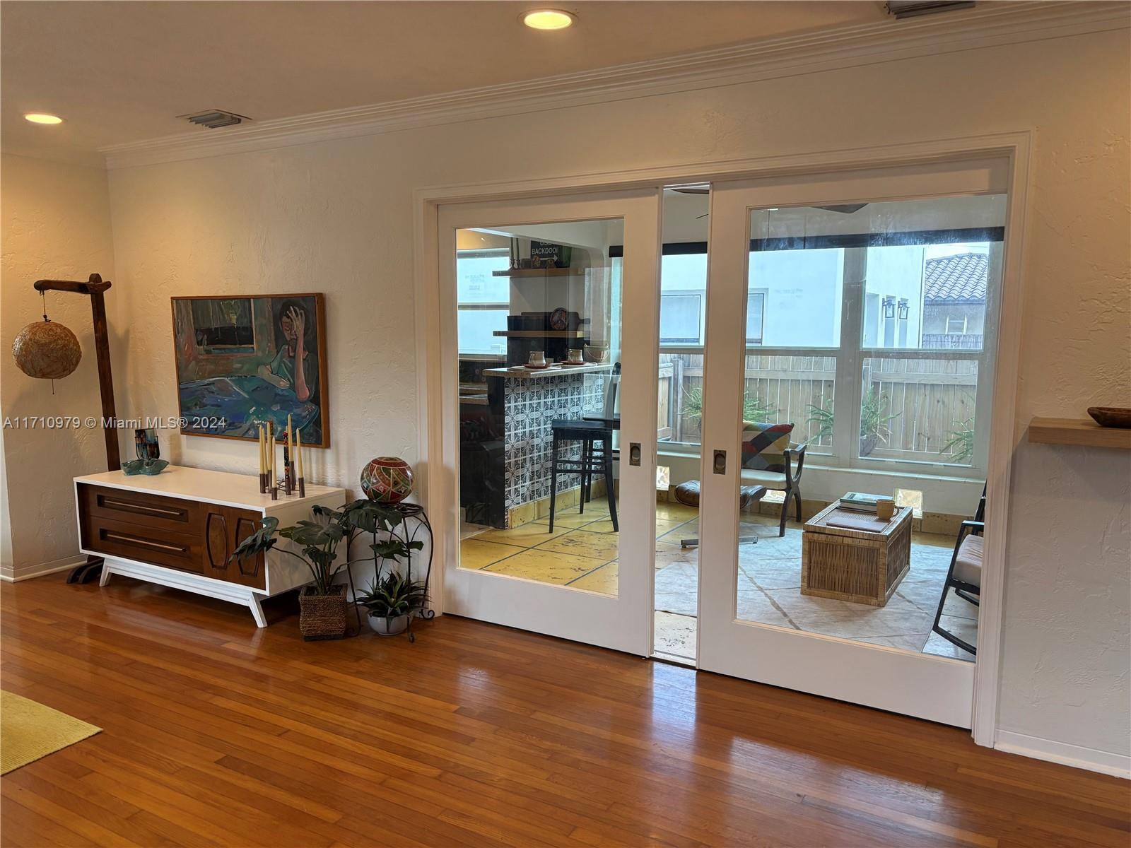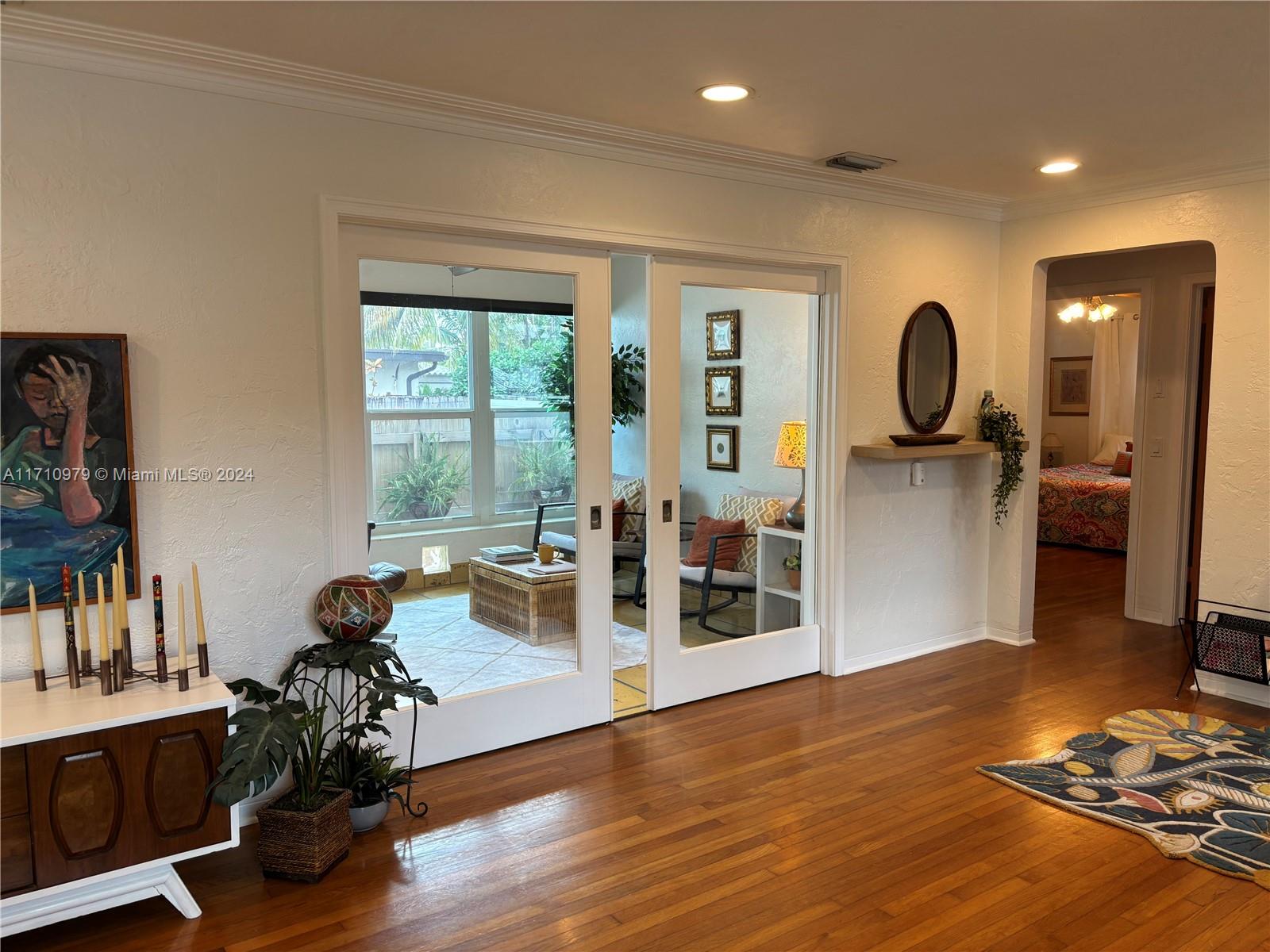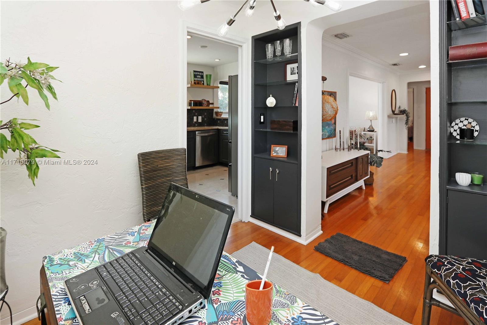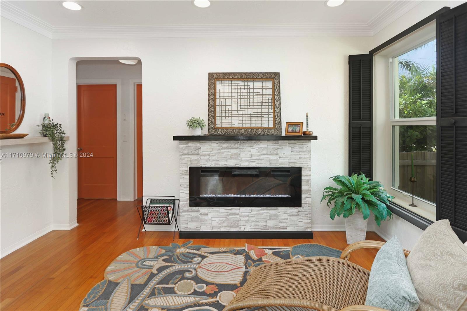 Classic 1940s Hollywood Lakes home exudes original charm, arched front door, gated courtyard, hardwood floors, 24”cement-tiled sun room & crown molding. Front room also features new fireplace & custom pocket sliding doors that completely define/elevate the space. Two spacious king BRs offer room & storage to spare w/4 walk-in closets & a hallway pantry, all w/custom organizers. Primary BR also includes private BA. Updated kitchen features SS appliances, gas stove, new fridge, open shelving & granite counters w/bar seating. A private home office conveniently located between kitchen & L/R. Entire interior was freshly painted 2024, new hurricane windows/doors in 2022. Yard is newly fenced & features a brick patio w/string lighting. One-car garage with W/D & freezer, roof warranty of 7 yrs.